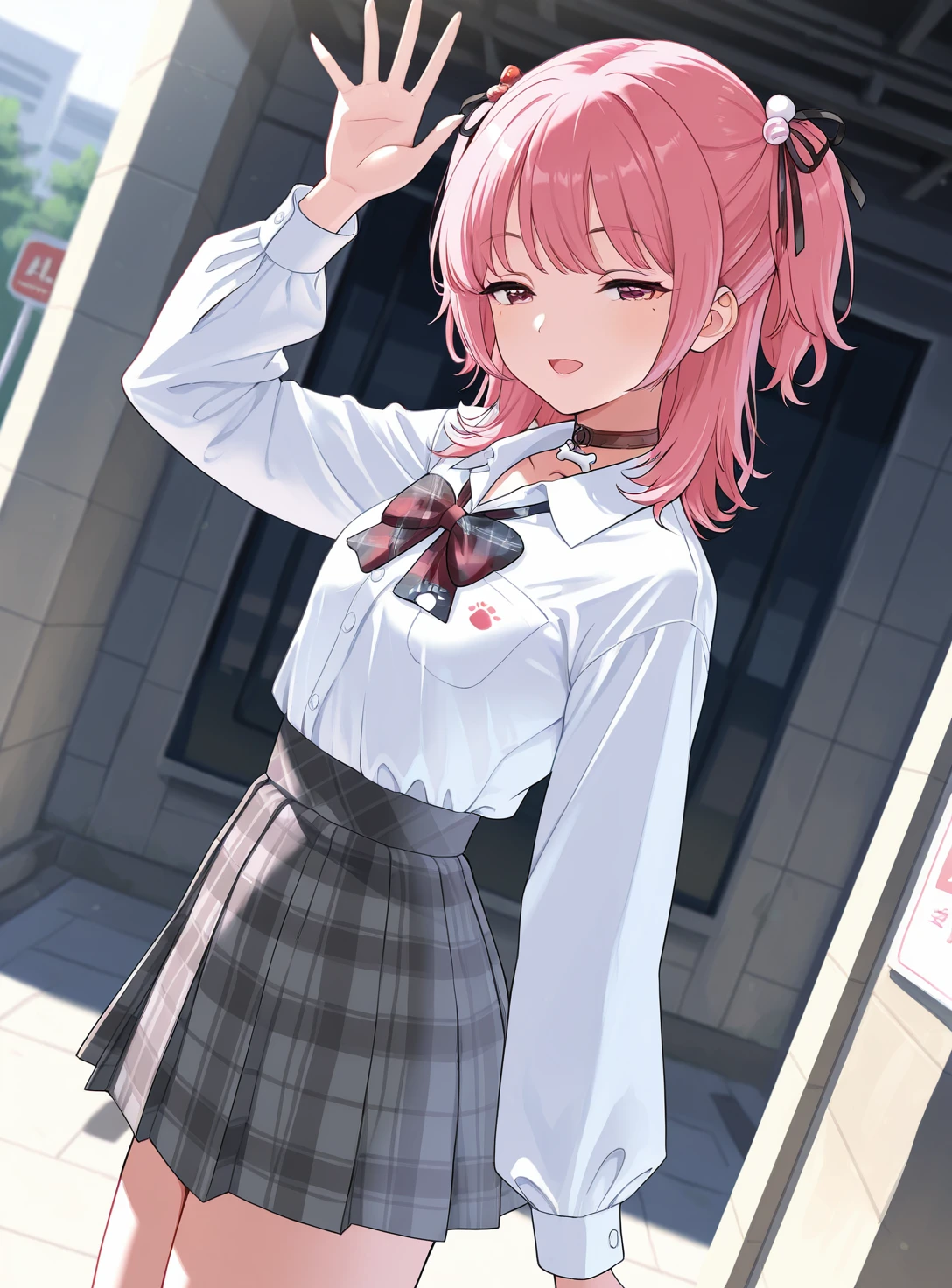 PitaUniform, medium hair, two side up, hair ornament, dog hairclip, mole under eye, bone pendant choker, white shirt, shirt tucked in, bowtie, plaid pleated skirt,