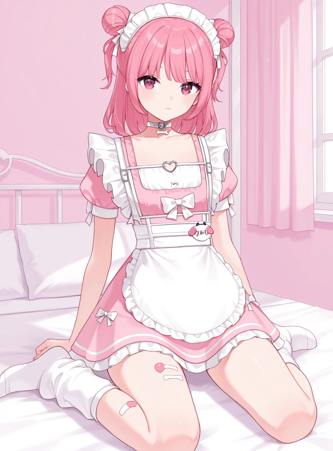 PitaMaid, medium hair, double bun, two side up, maid headdress, hair ribbon, bone pendant choker, maid dress, maid apron, name tag,