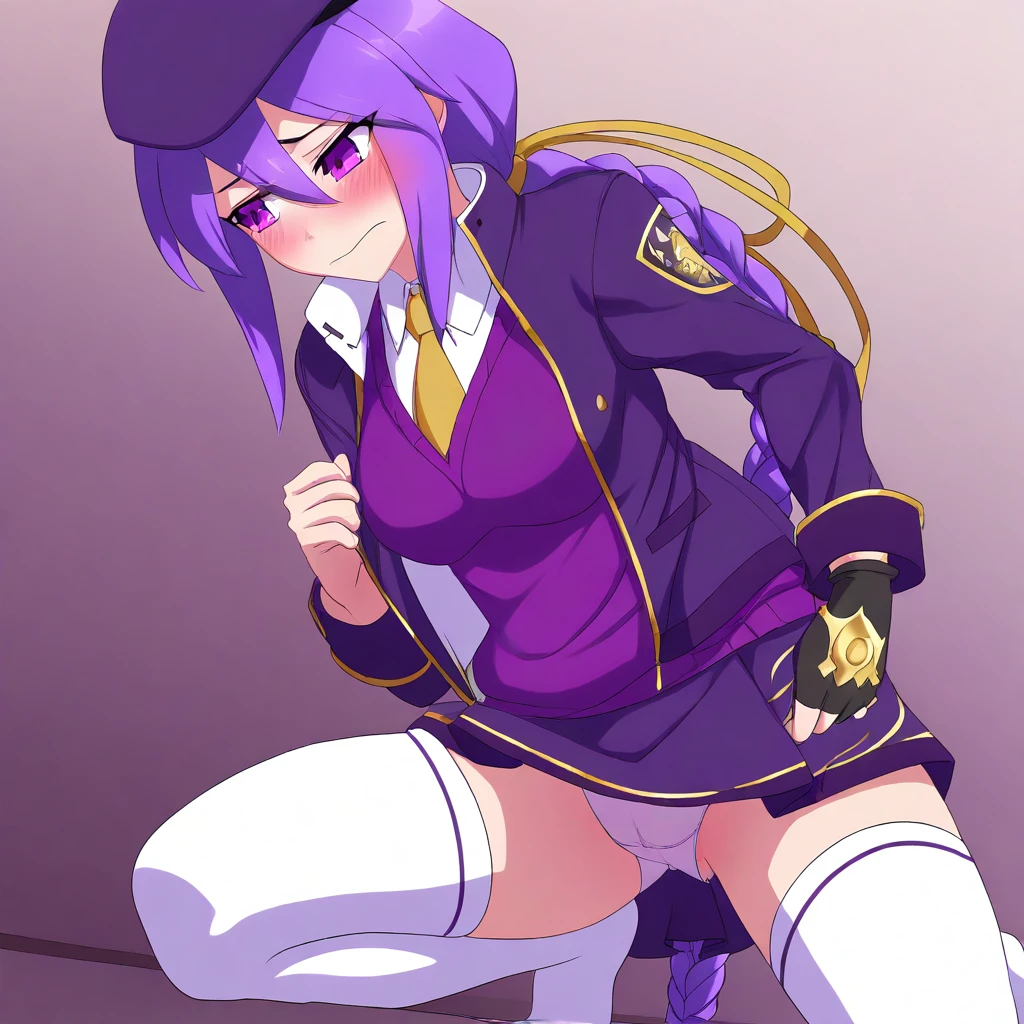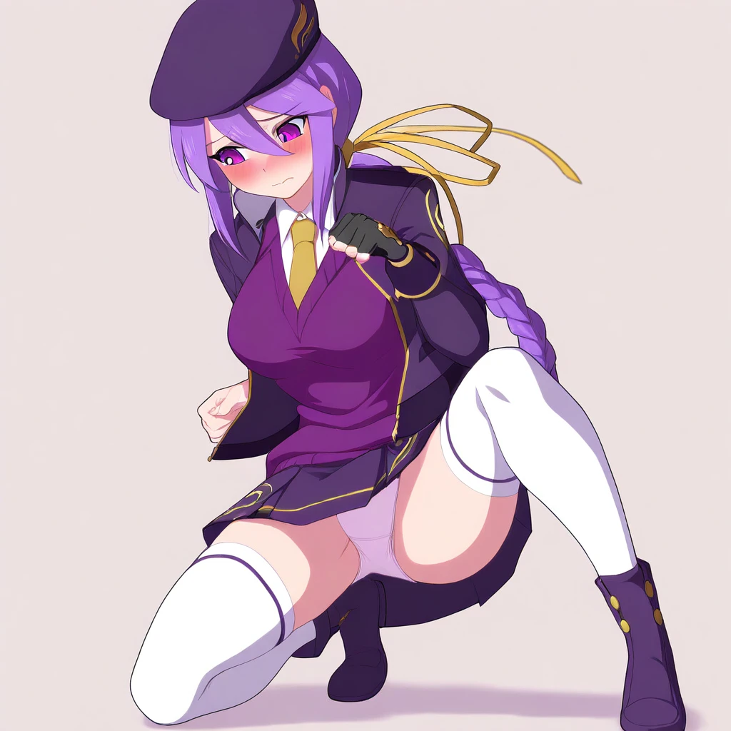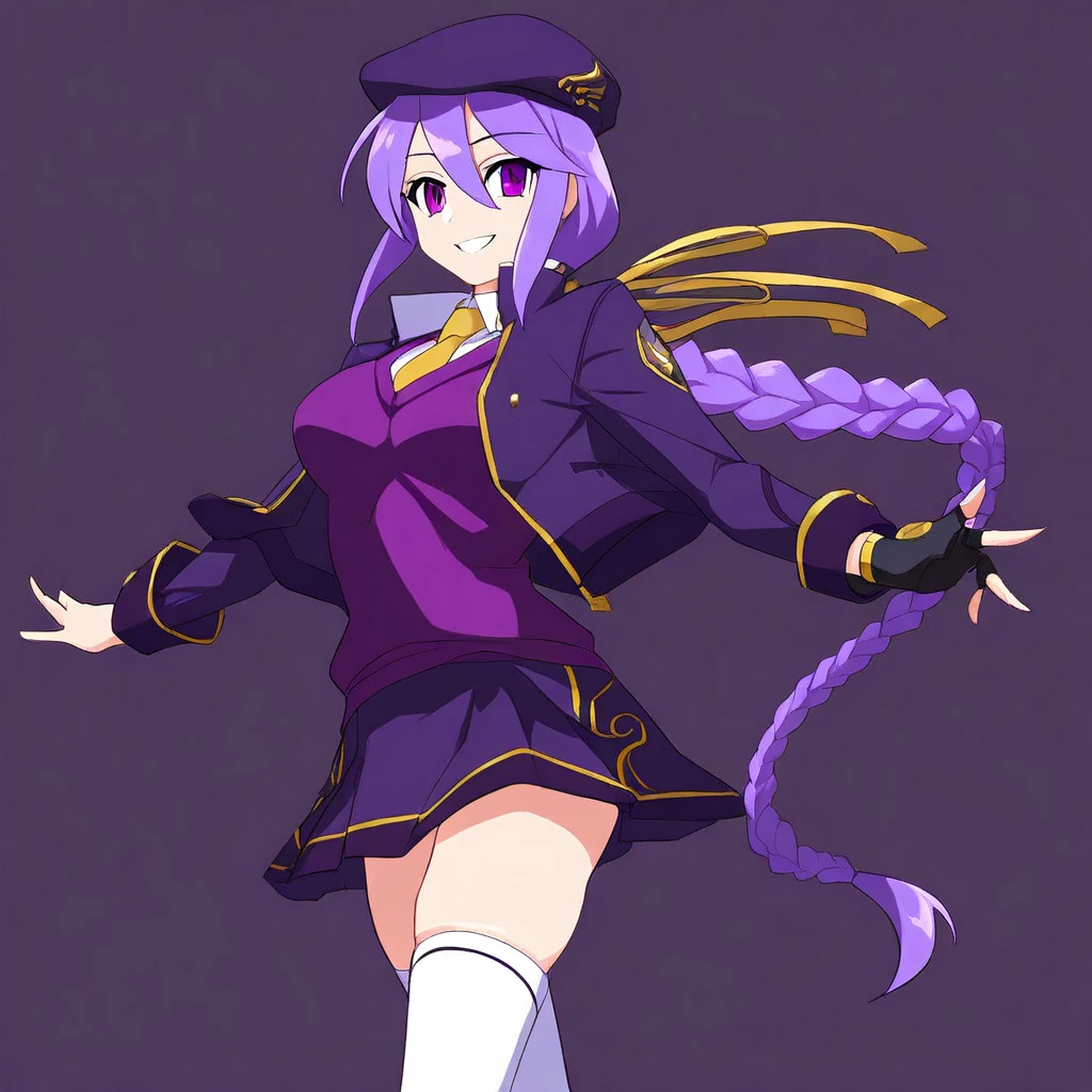 EltnumOutfit, light purple sweater, sweater vest, collared undershirt, white undershirt, undershirt, yellow necktie, dark purple cropped jacket, dark purple skirt, miniskirt, gold trim, white thighhighs, single glove, fingerless glove, black glove, dark purple beret, open jacket, white boots