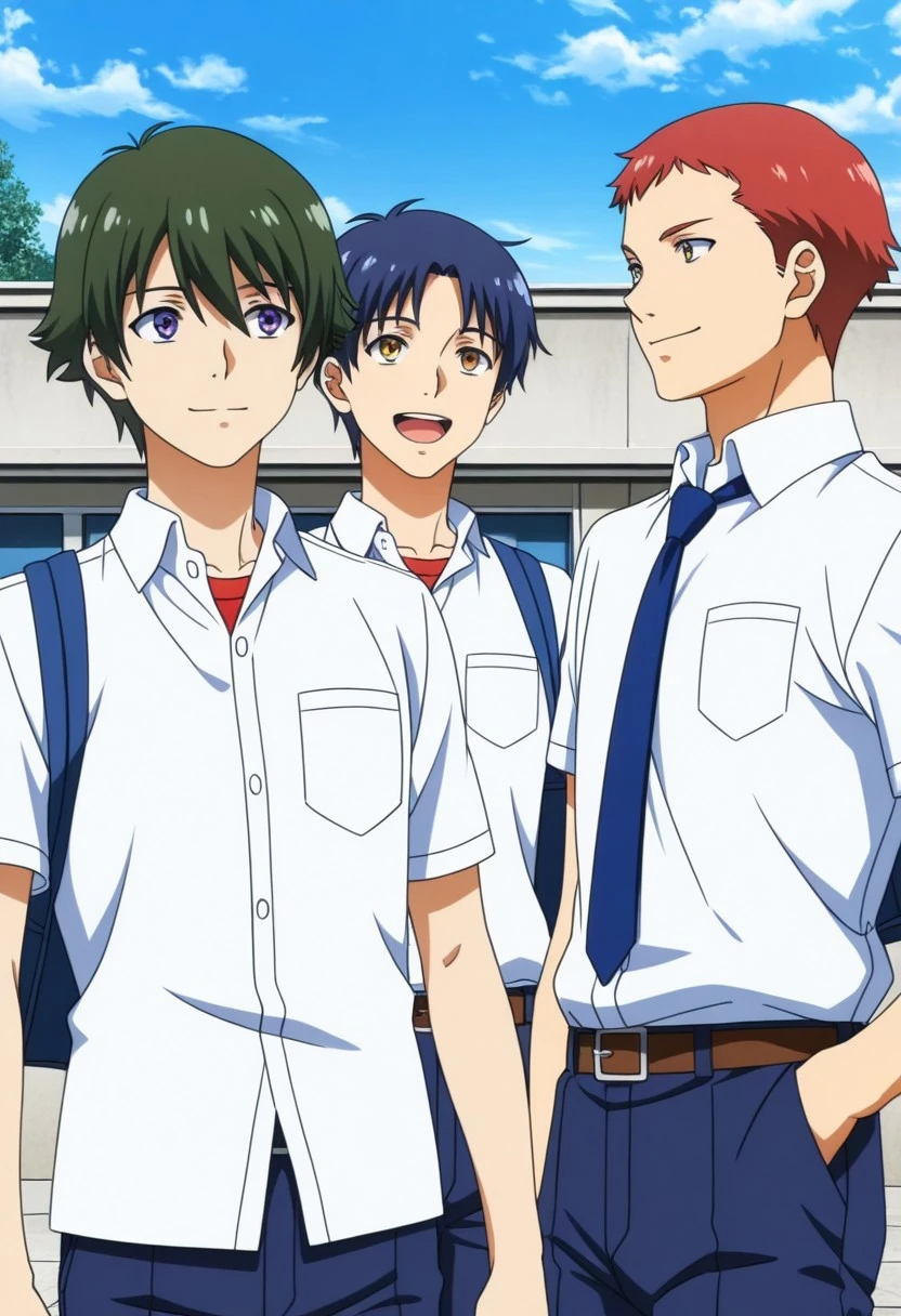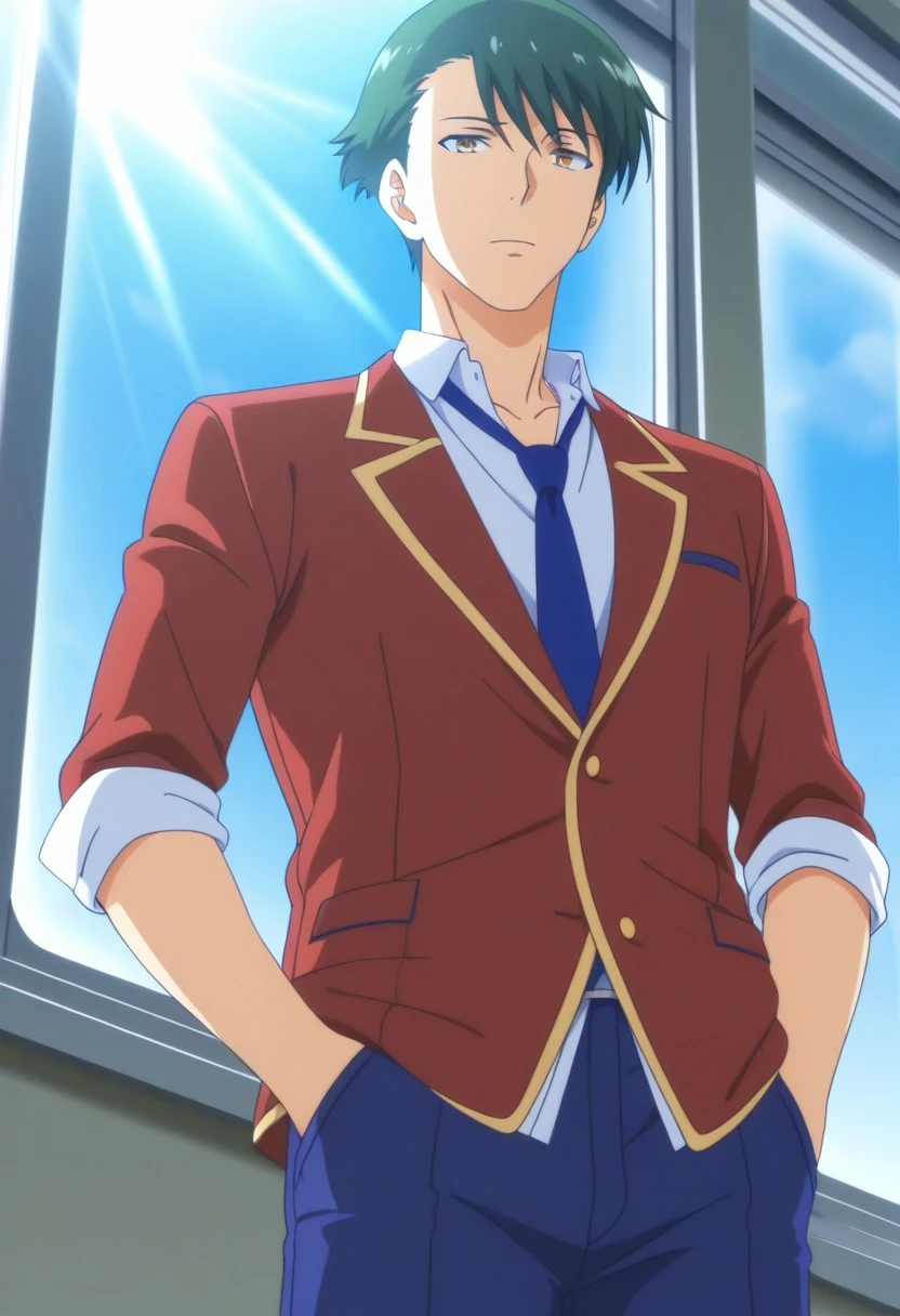 male school uniform, red blazer, yellow accents, white collared undershirt, blue necktie, dark green pants