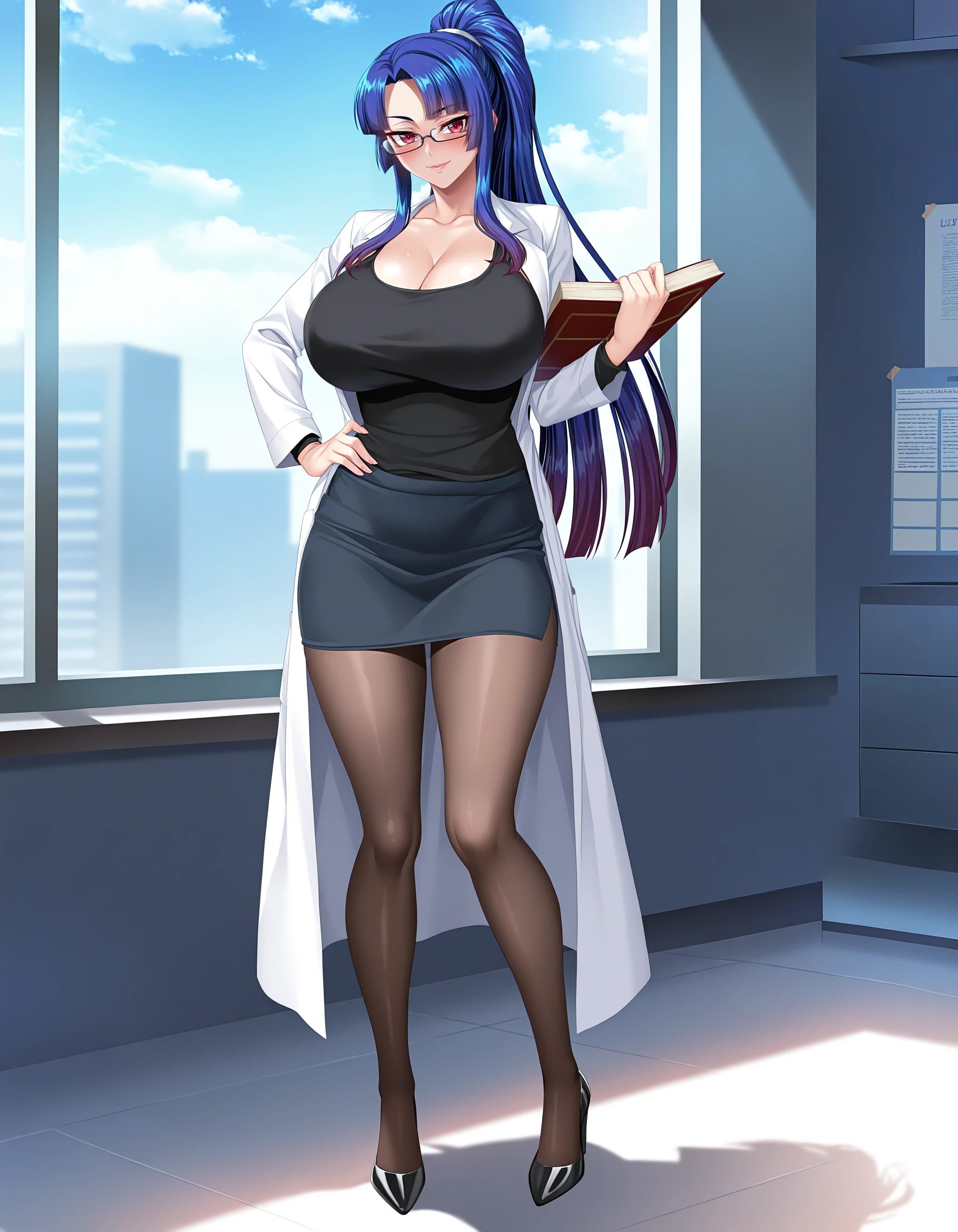office lady, lab coat, white miniskirt, pencil skirt, black tank top, pantyhose, high heels