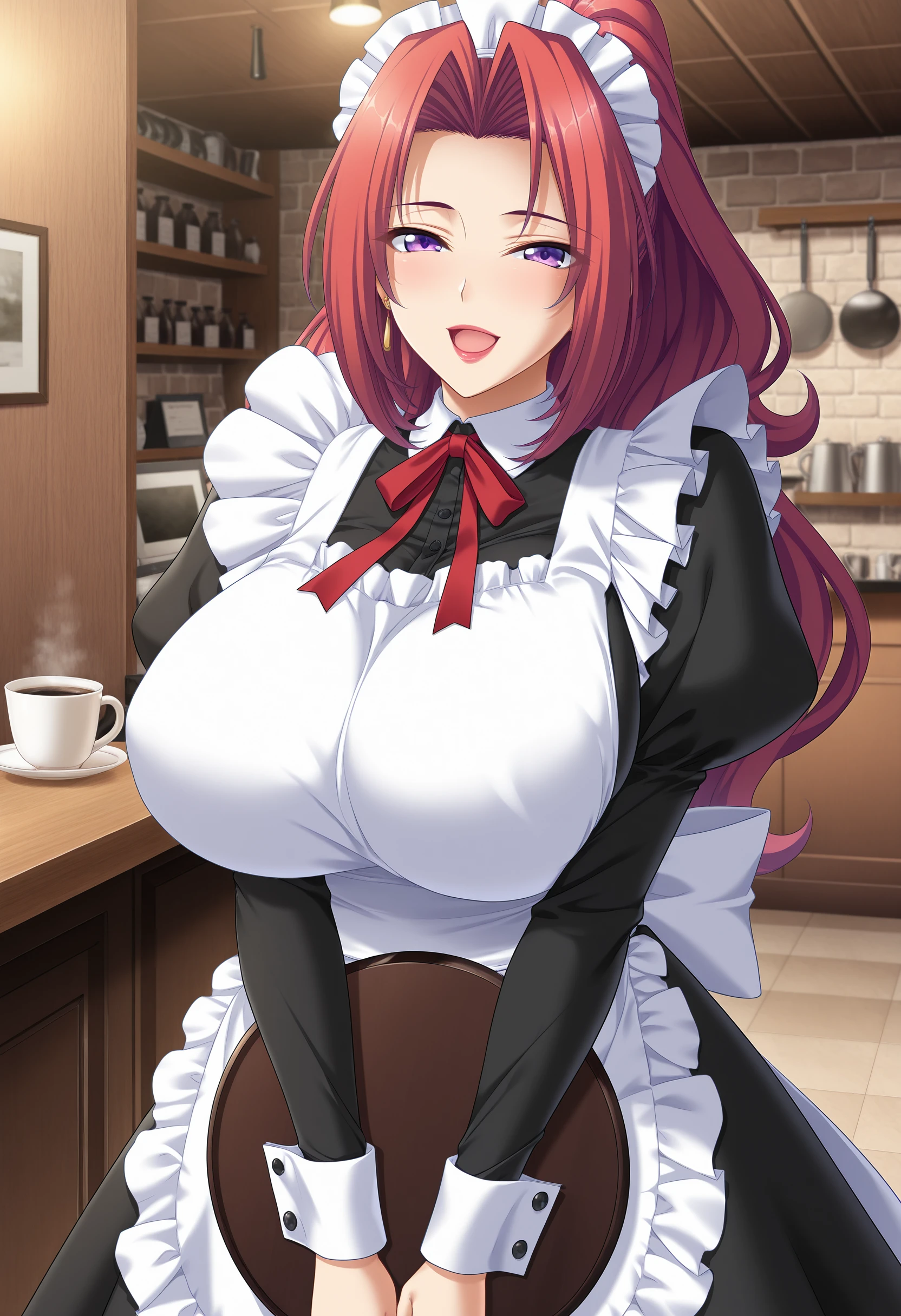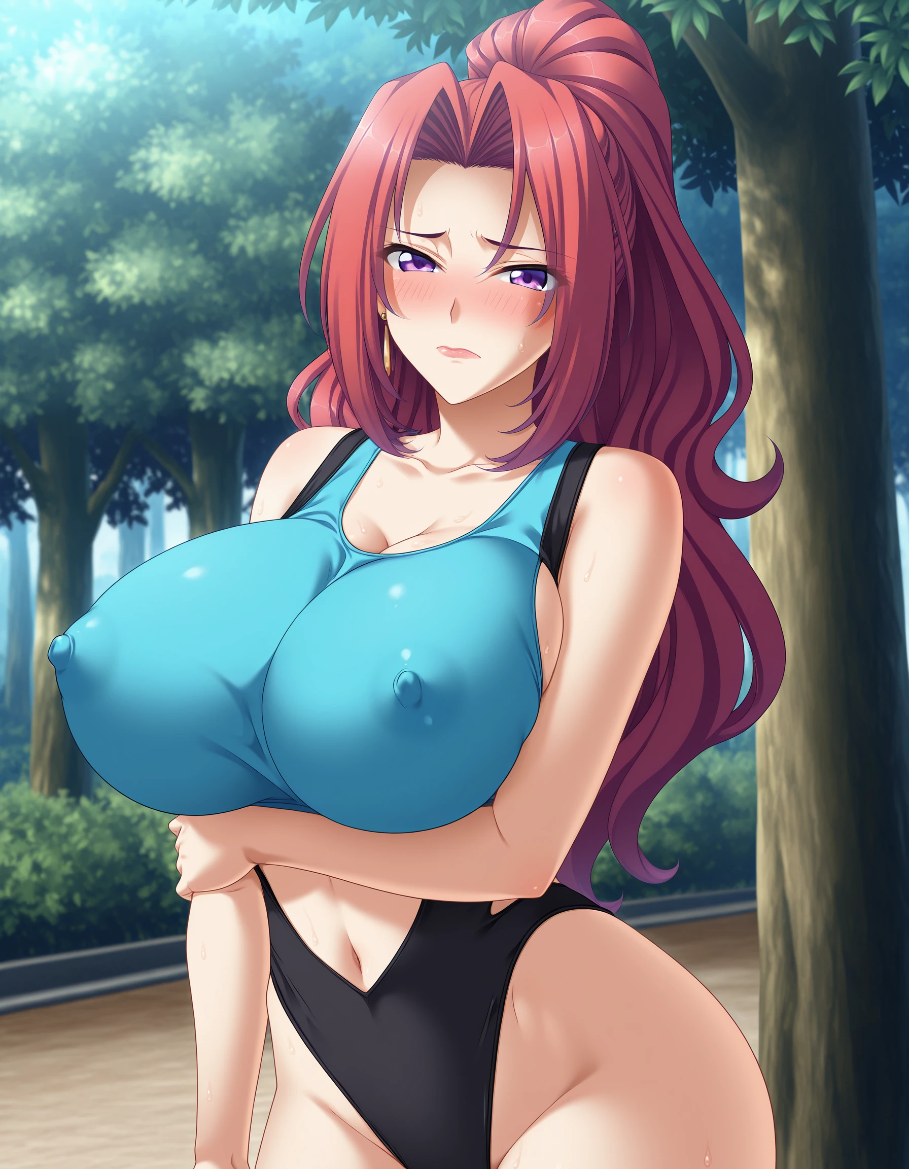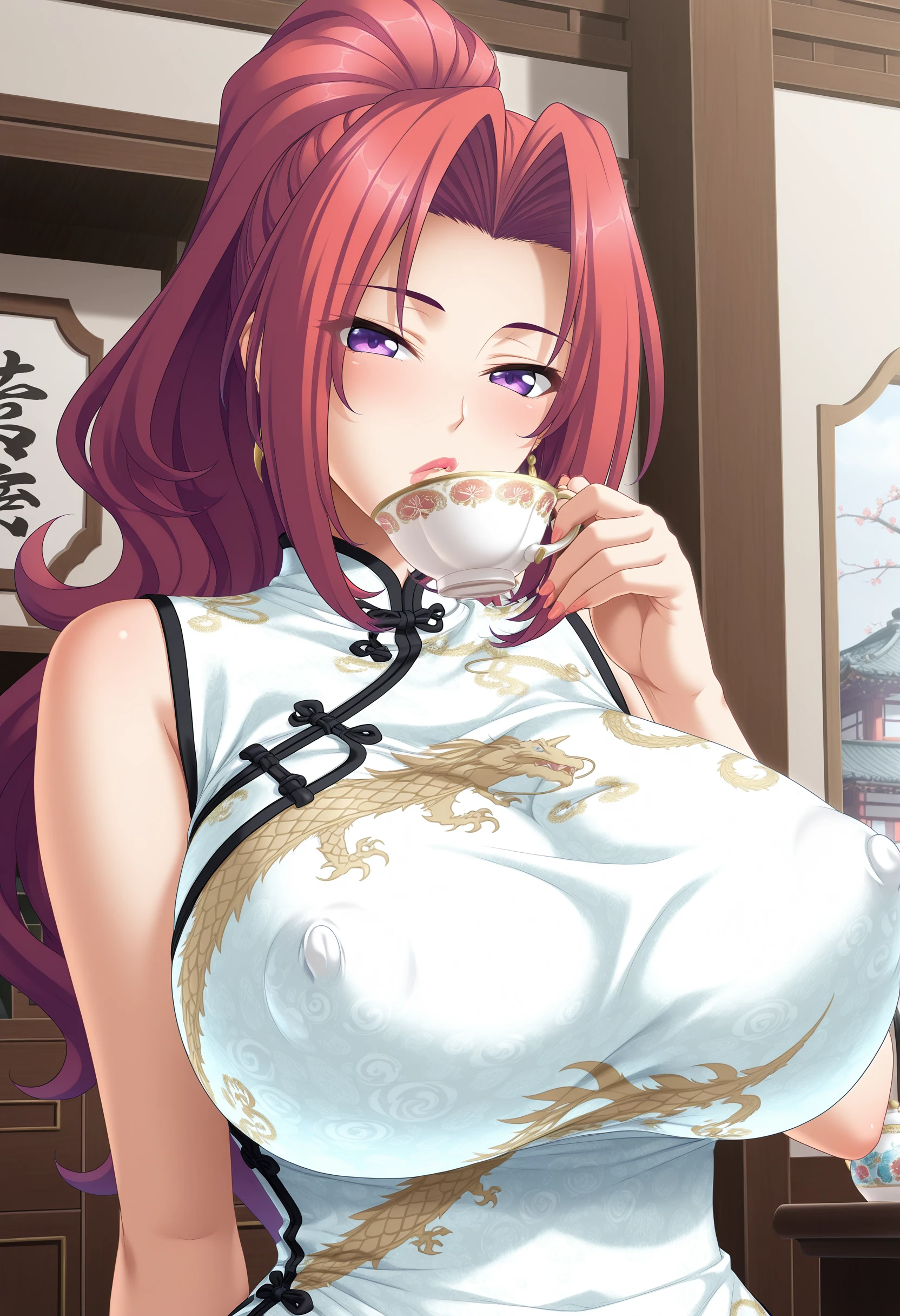 toukomk3, 1girl, red hair, long hair, high ponytail, purple eyes, 1mole on breast, lipstick
