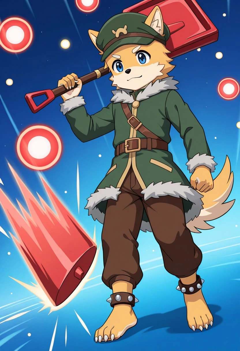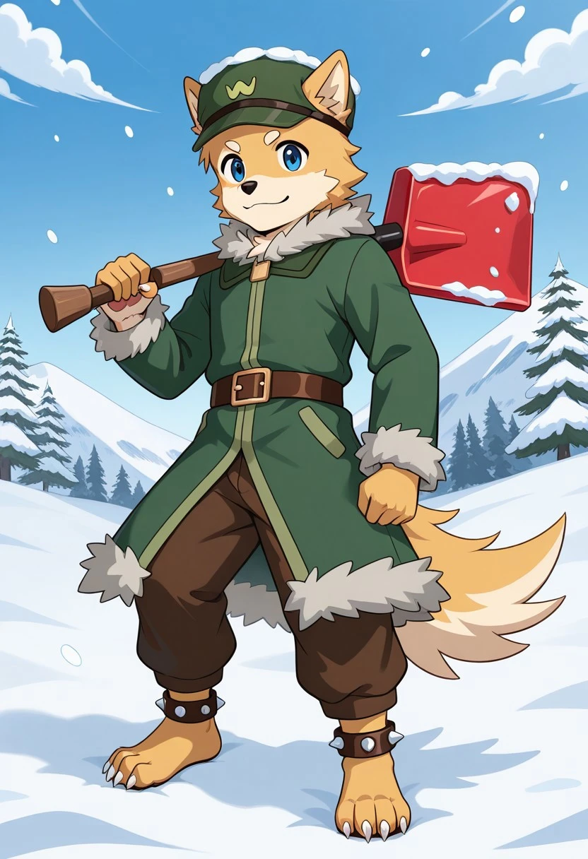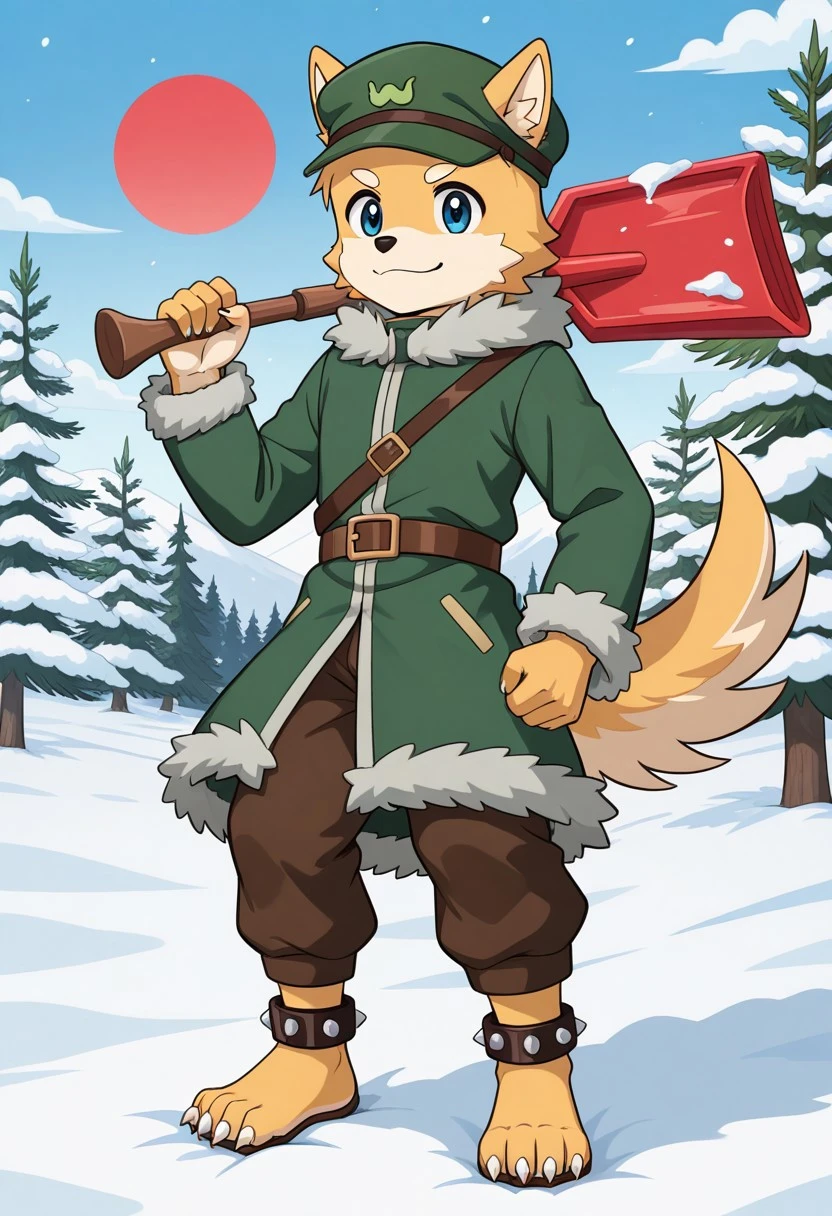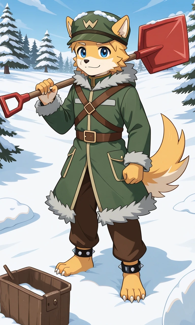 Loss, male, solo,anthro, dog, dog ears, Golden and white fur, blue eyes, wearing green military coat with gray fur trim and yellow Details, green-olive cap with golden “W”, brown pants, black spiked ankle bracelets, claws,Brown belt, brown straps