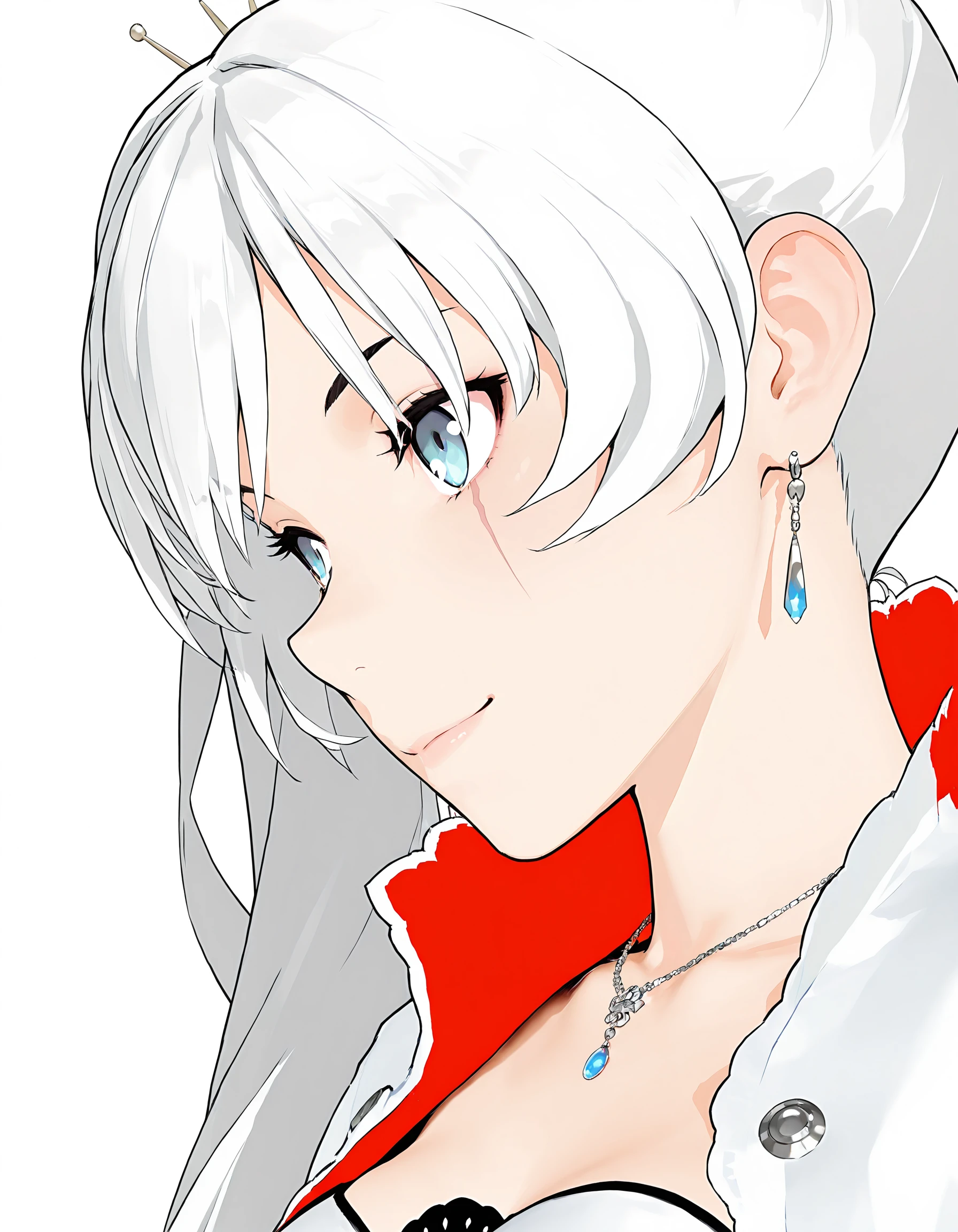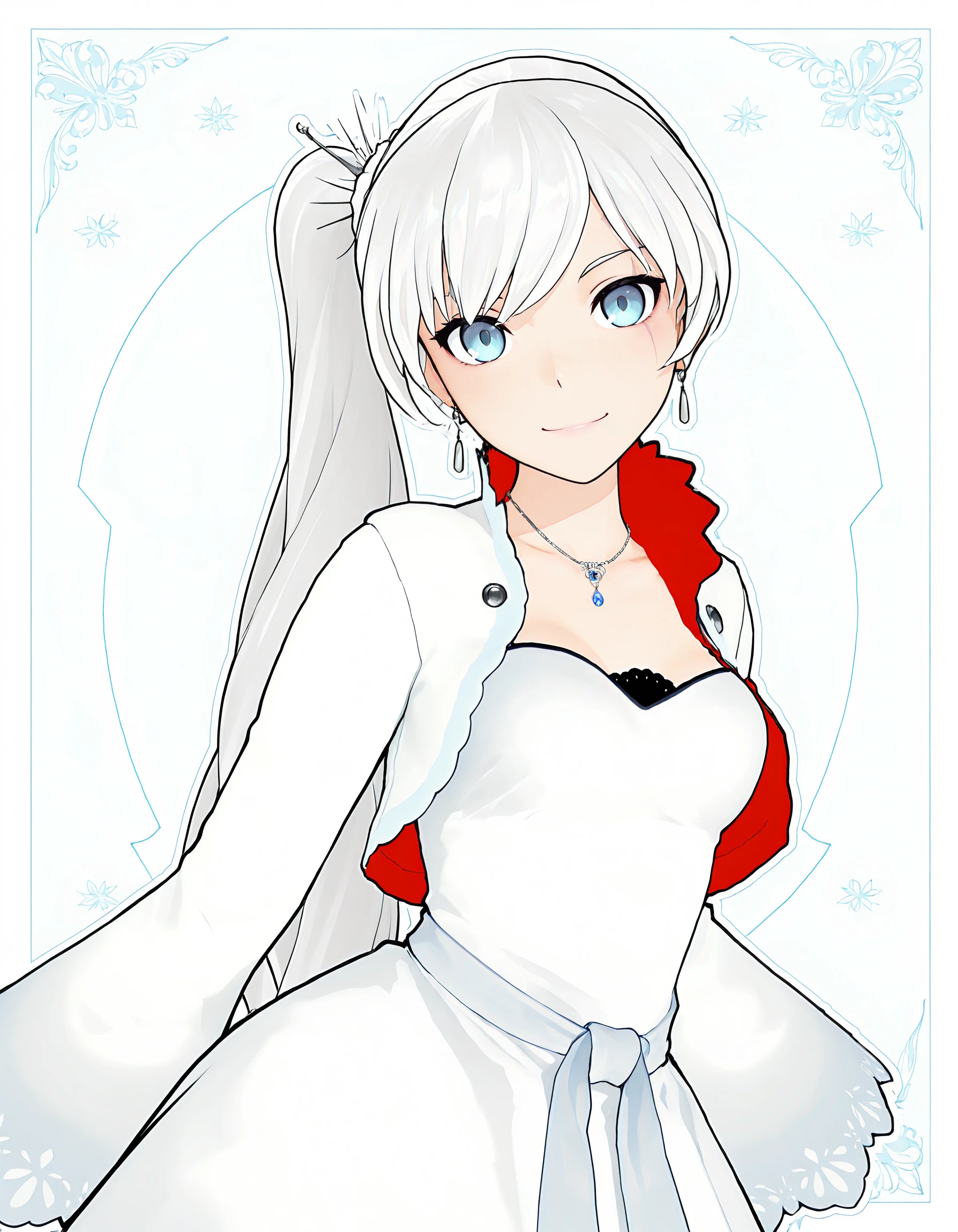WeissSchneeV1, white hair, long hair, side ponytail,hair ornament, blue eyes, scar across eye, necklace, cropped jacket, long sleeves, white dress, white boots, high heel boots,