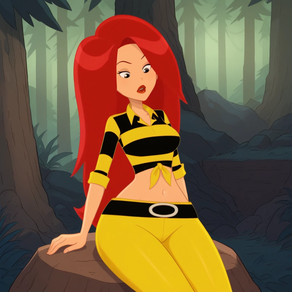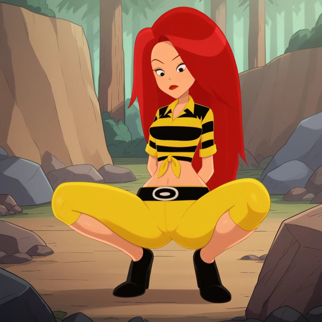 yellow shirt, striped shirt, short sleeves, shirt knot, midriff, black belt, yellow pants,