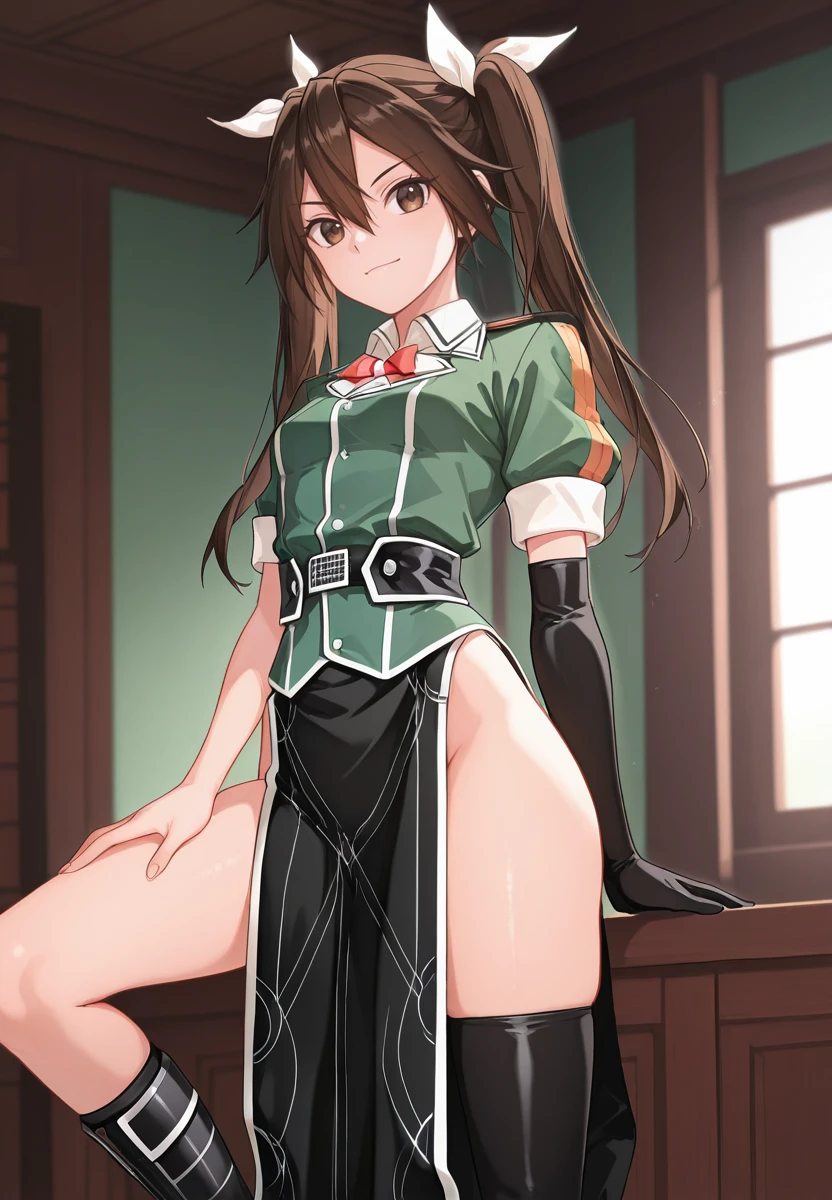 pelvic curtain, thighhighs, elbow gloves, boots, hair ribbon, red bow tie, green shirt