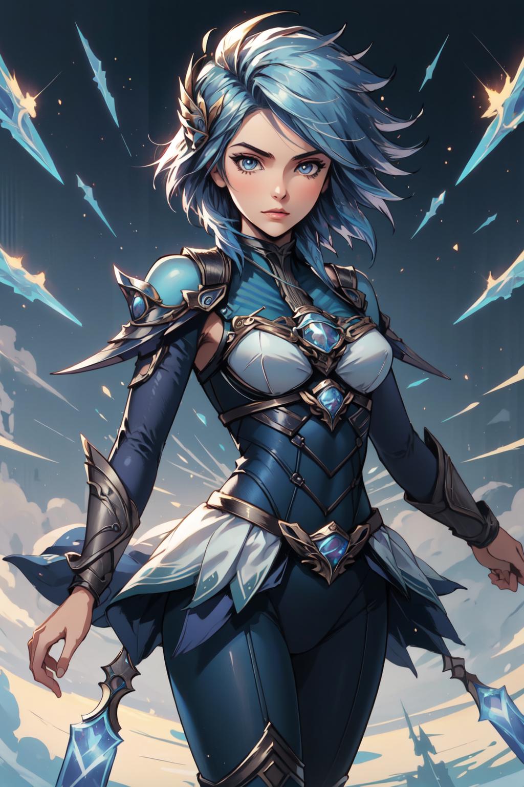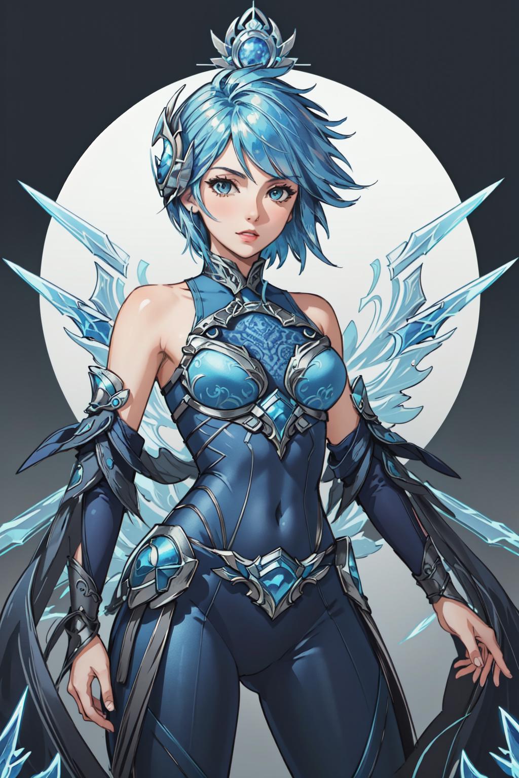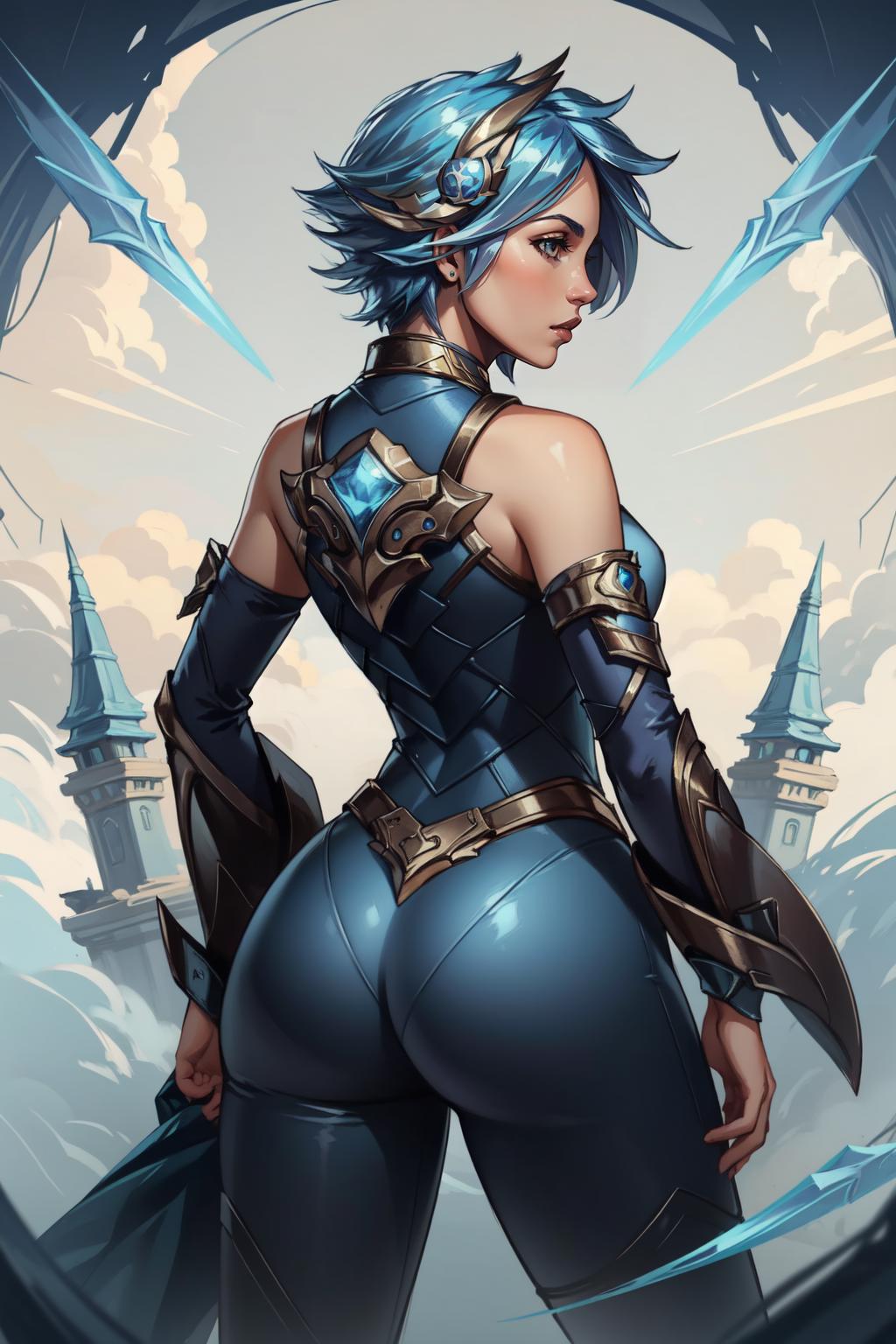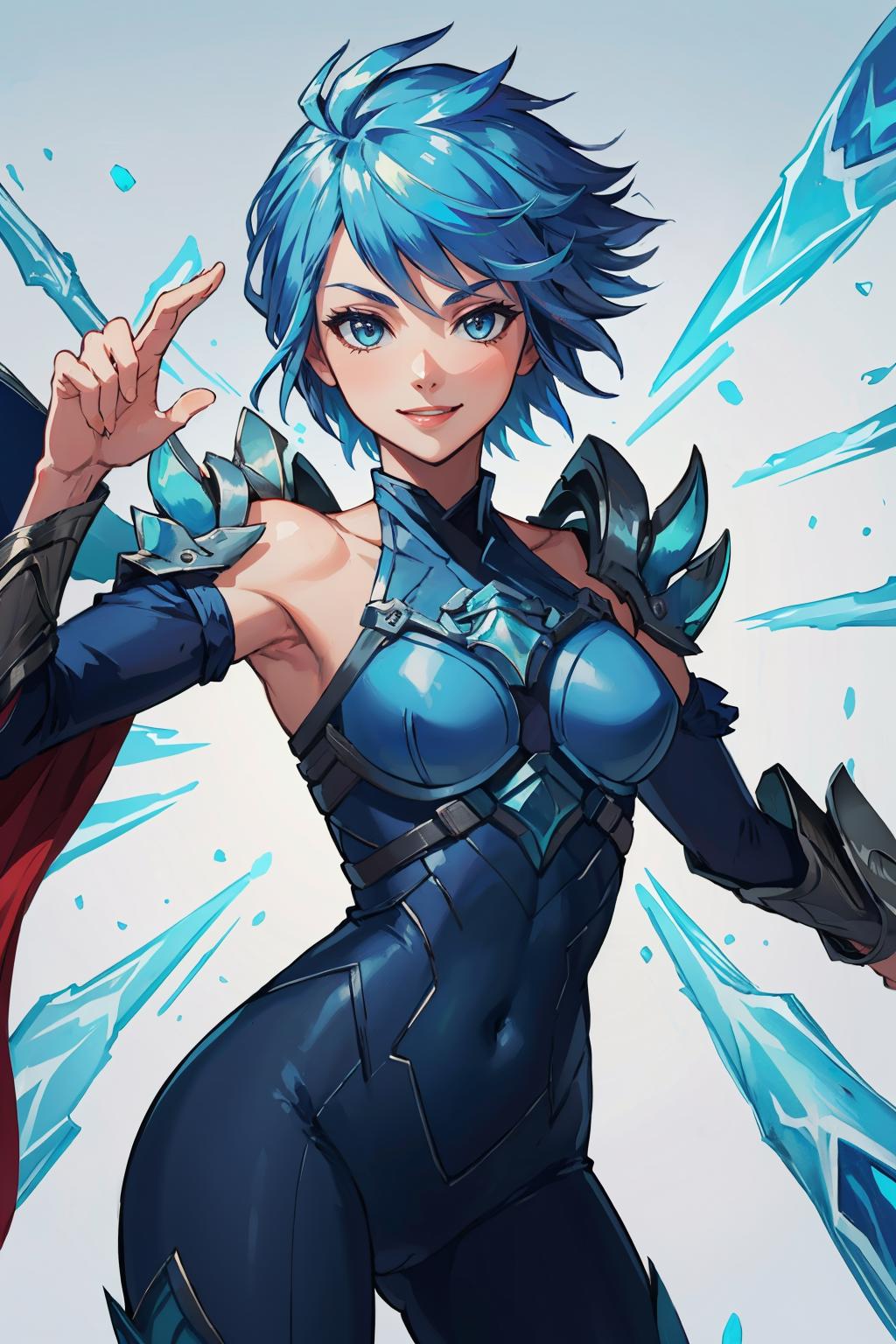 tags: frostblade irelia, 1girl, short hair, blue hair, bodysuit, detached sleeves