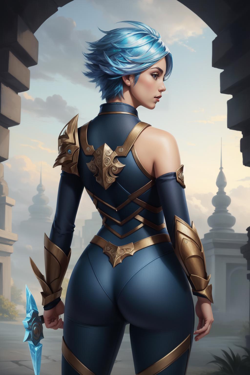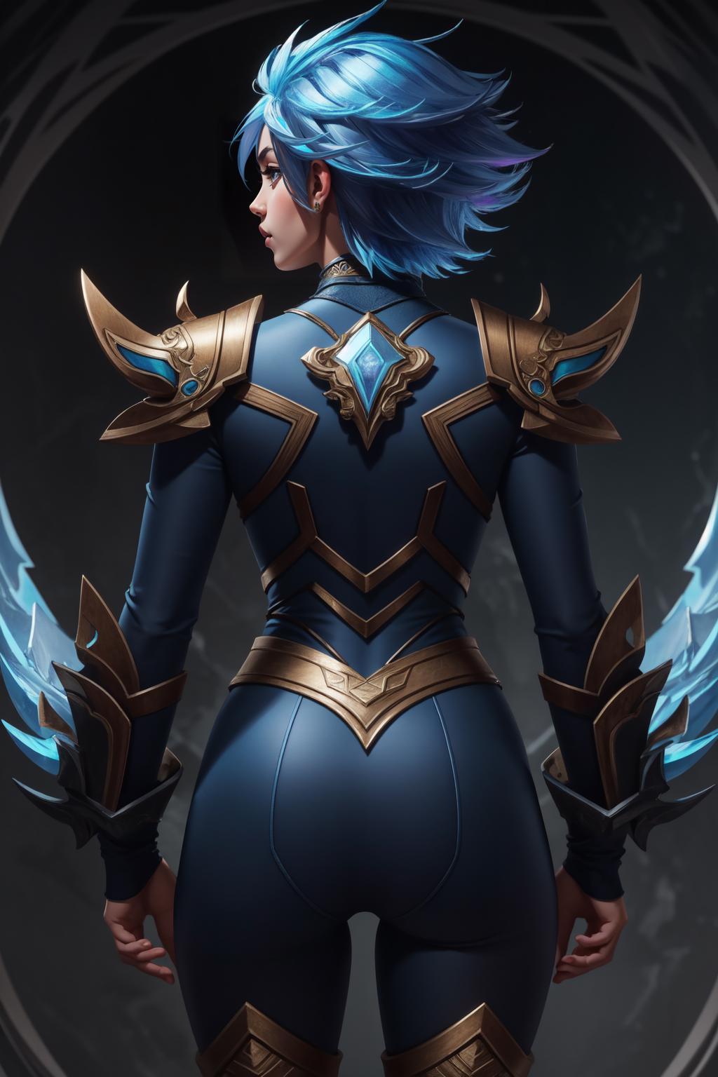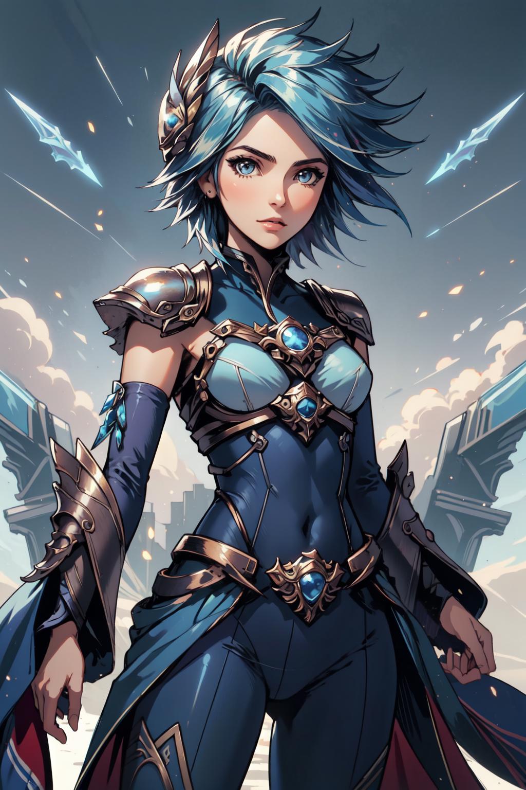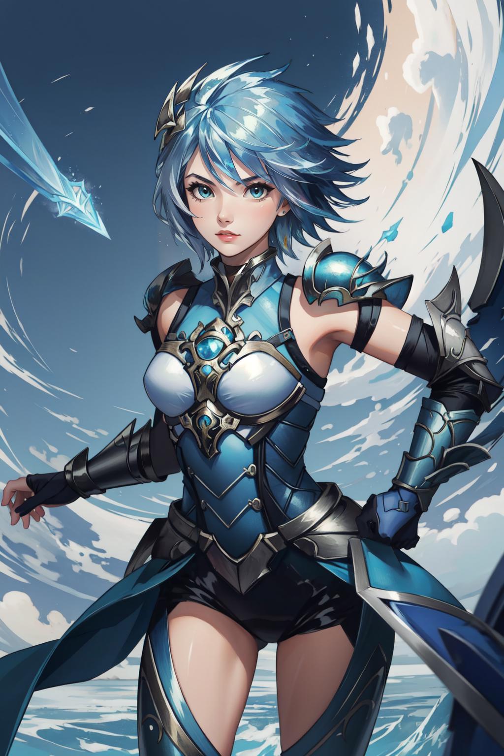 tags: frostblade irelia, 1girl, short hair, blue hair, bodysuit, detached sleeves