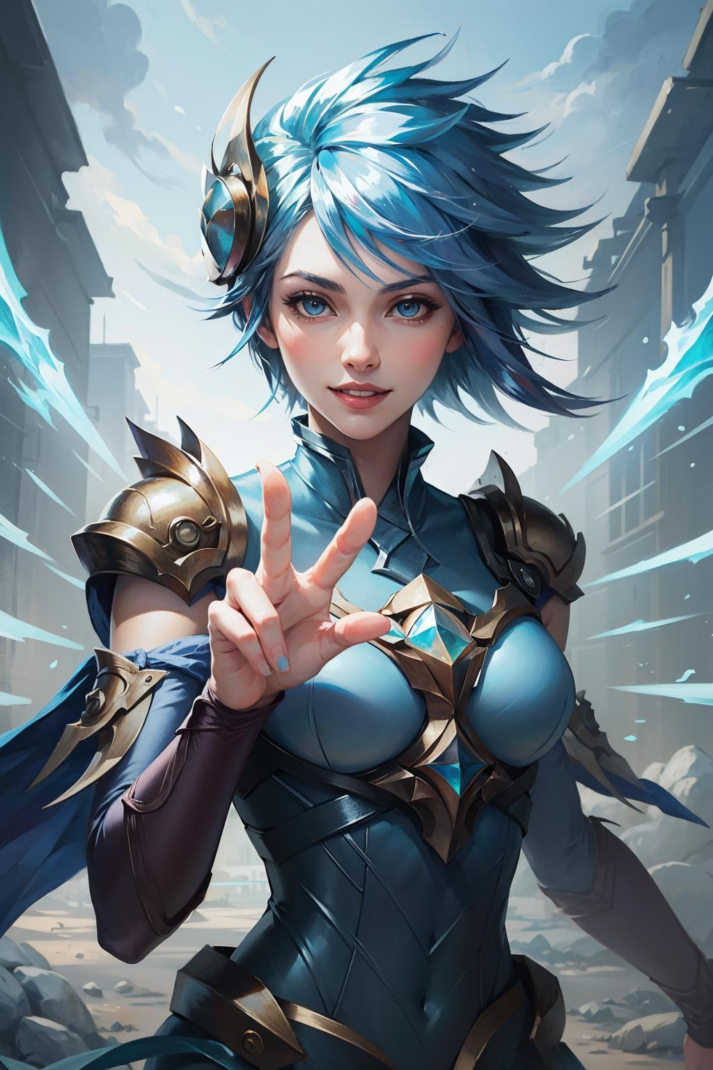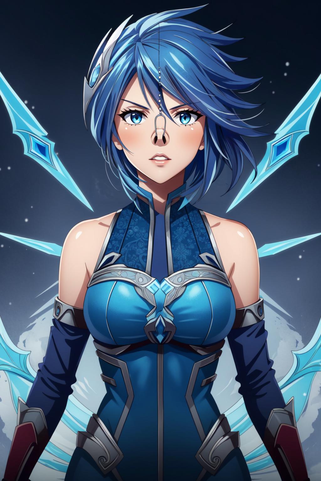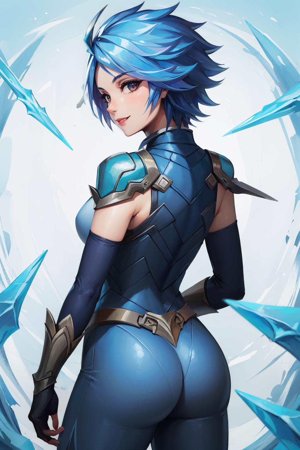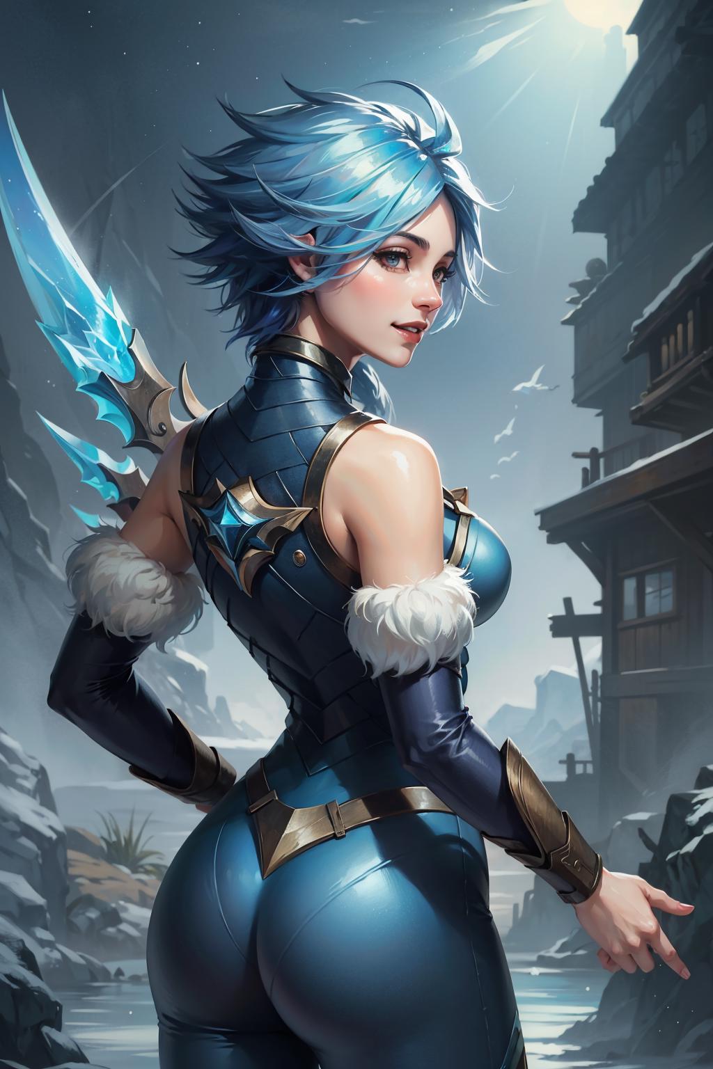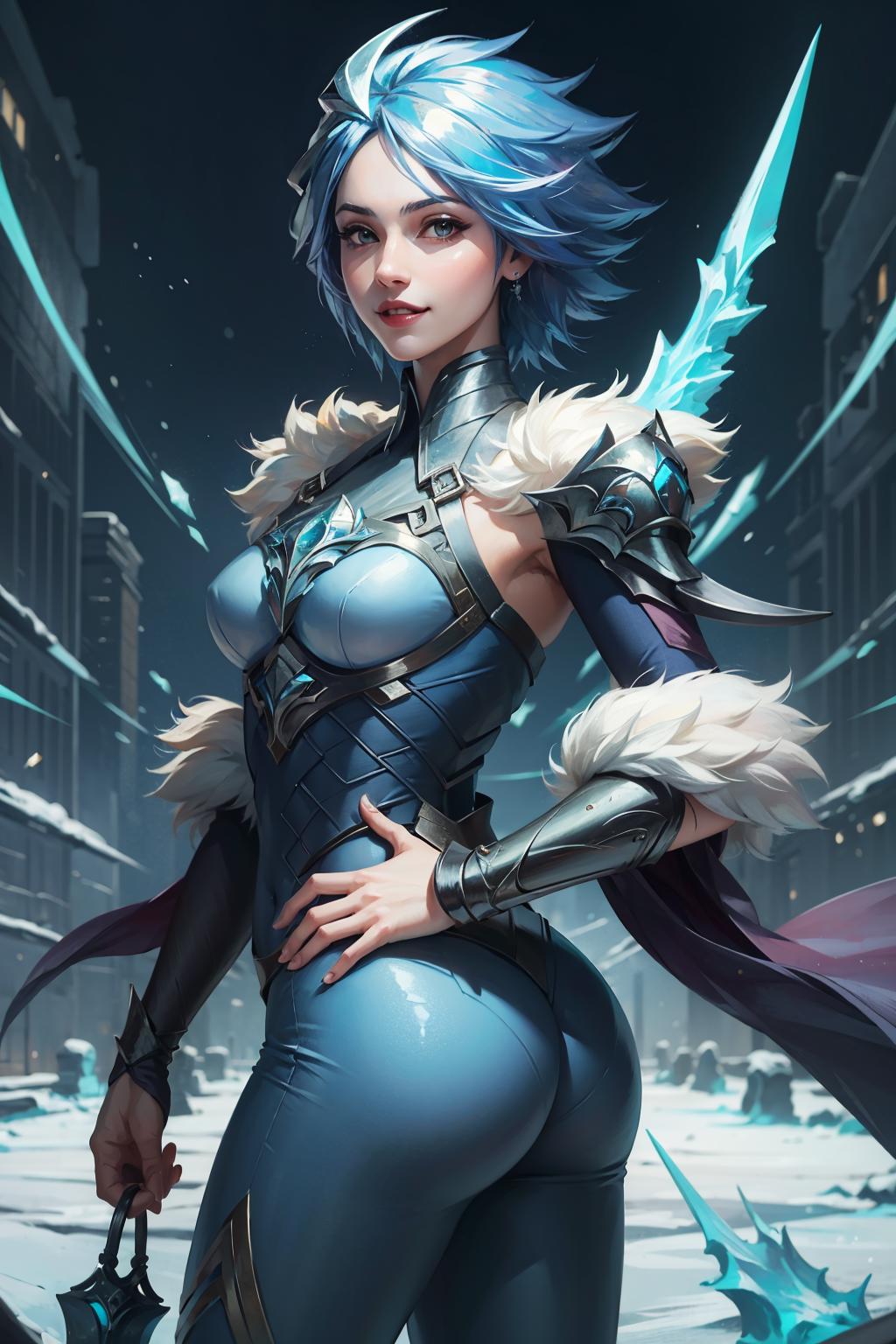 tags: frostblade irelia, 1girl, short hair, blue hair, bodysuit, detached sleeves