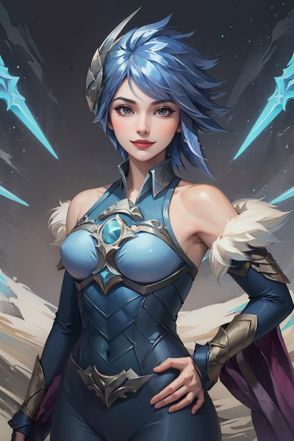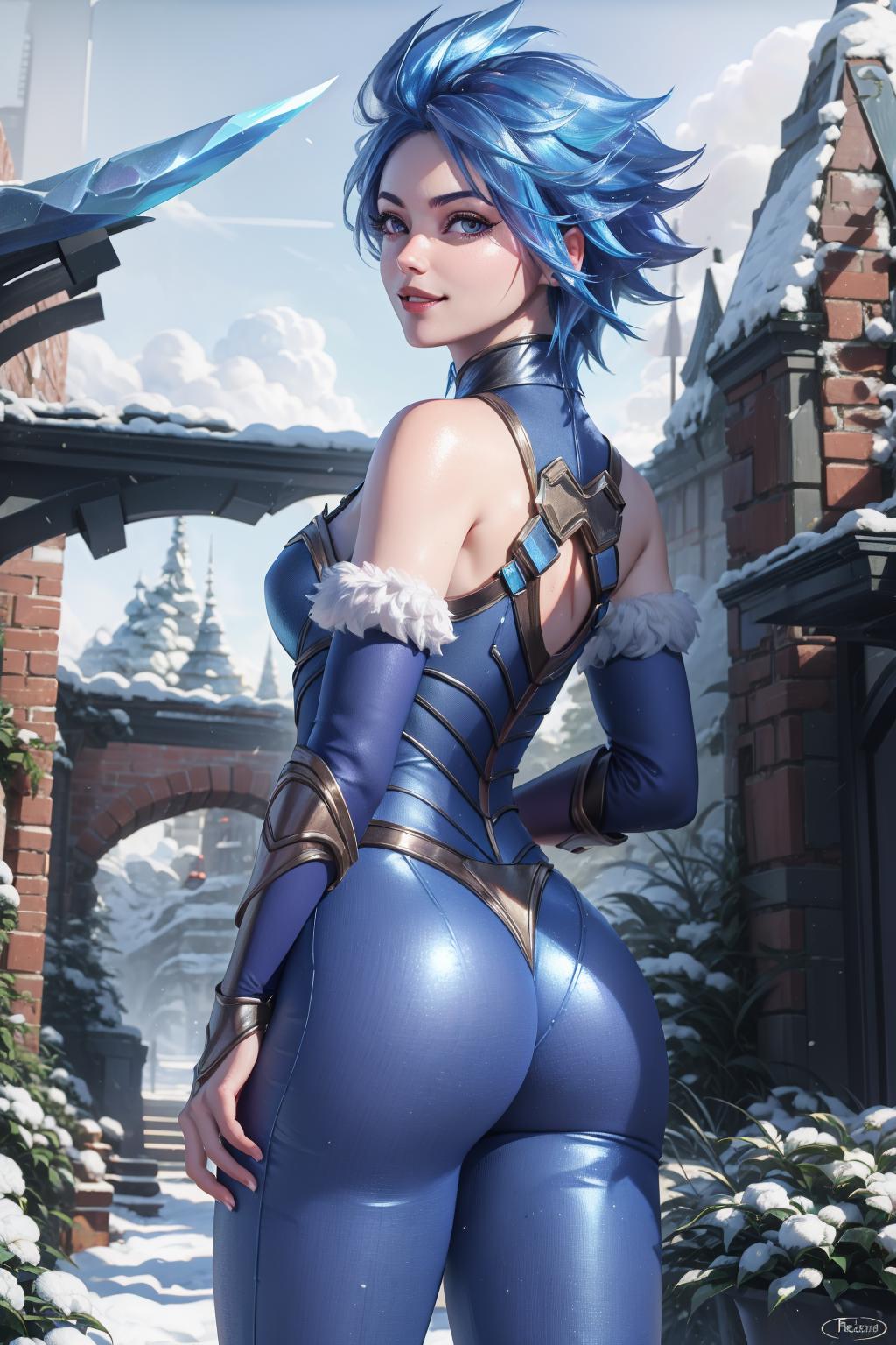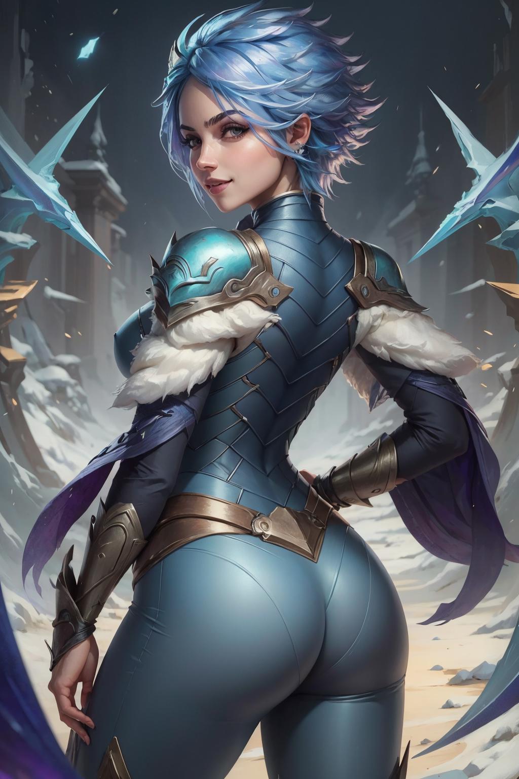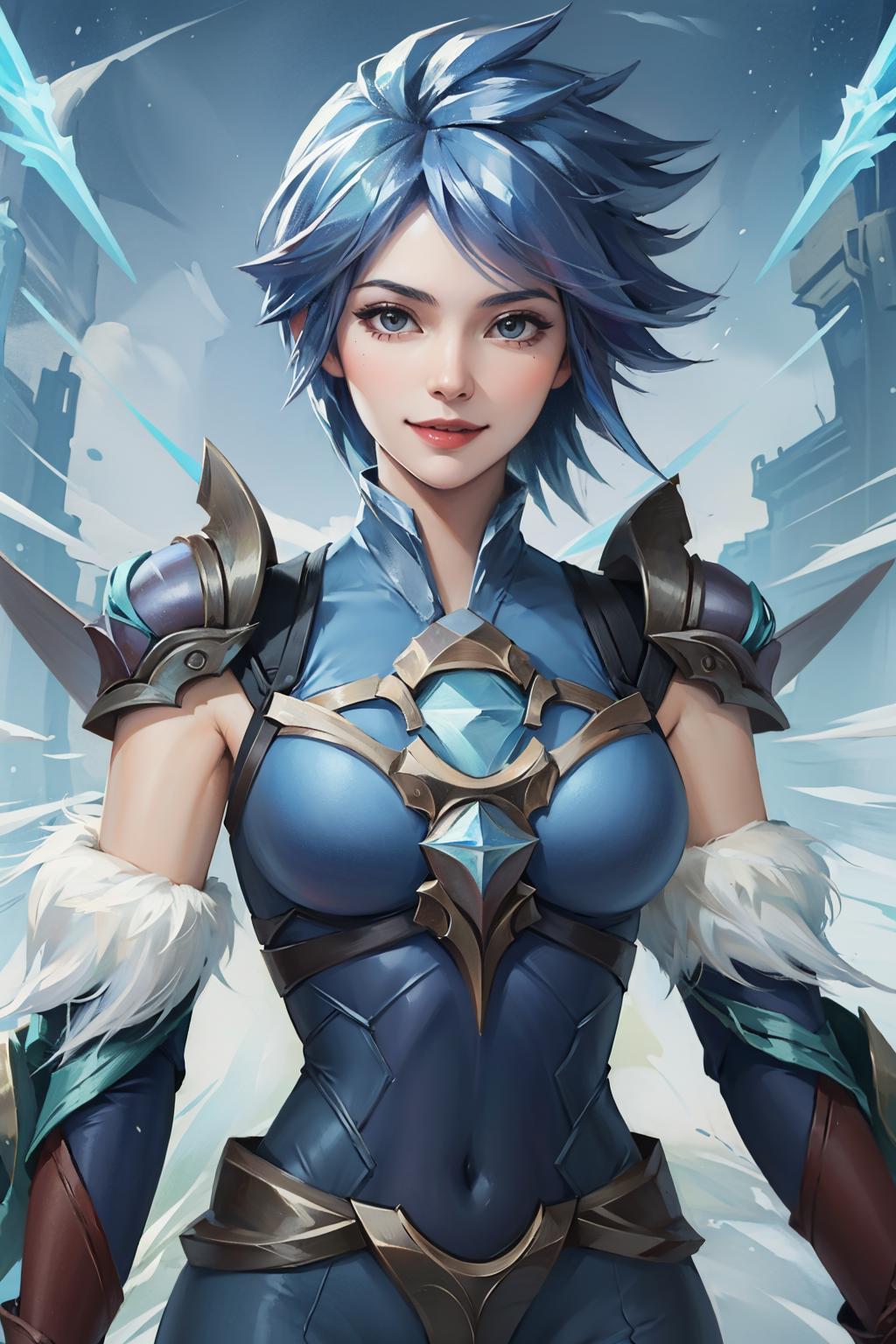 tags: frostblade irelia, 1girl, short hair, blue hair, bodysuit, detached sleeves