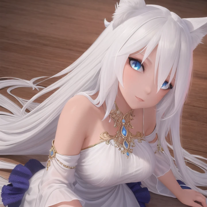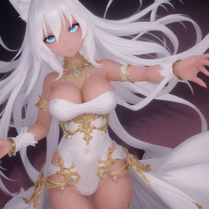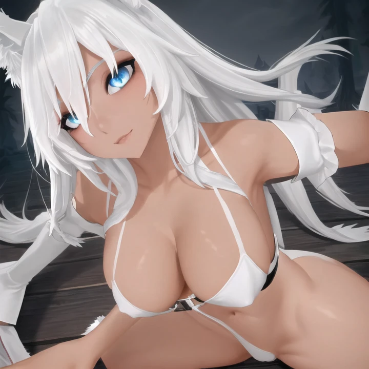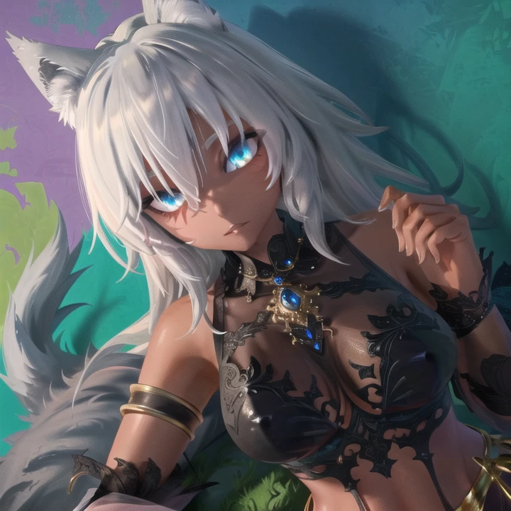 1girl, wolf ears, wolf tail, tan skin, thamriyell, blue eyes, medium breasts,