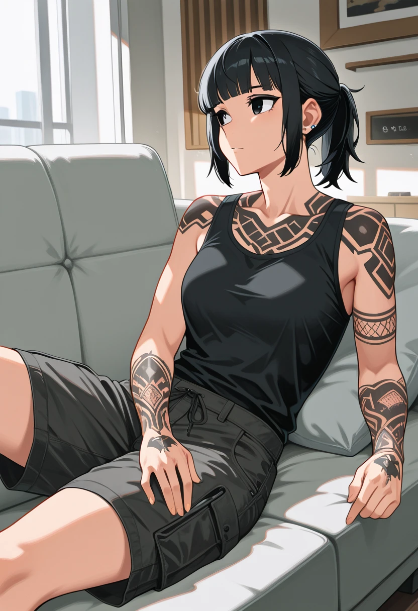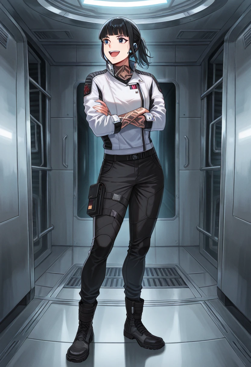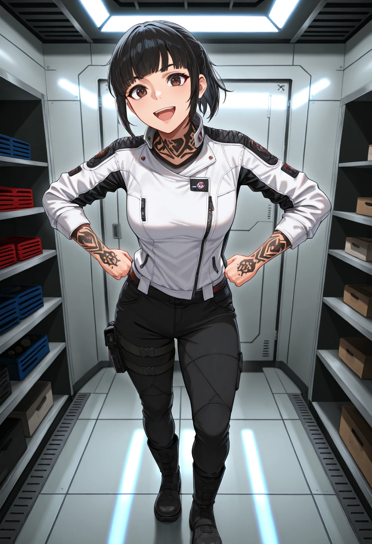 Emma Kagan from Black Ops 7. Main prompt is "ekbo7", with "black hair, blunt bangs, ponytail" for her hair and "tattoo, white jacket, black pants" for her in-game outfit.