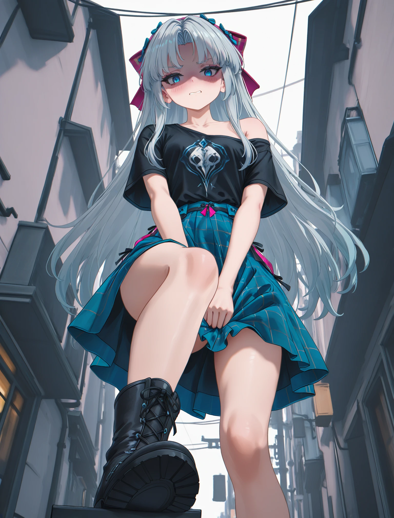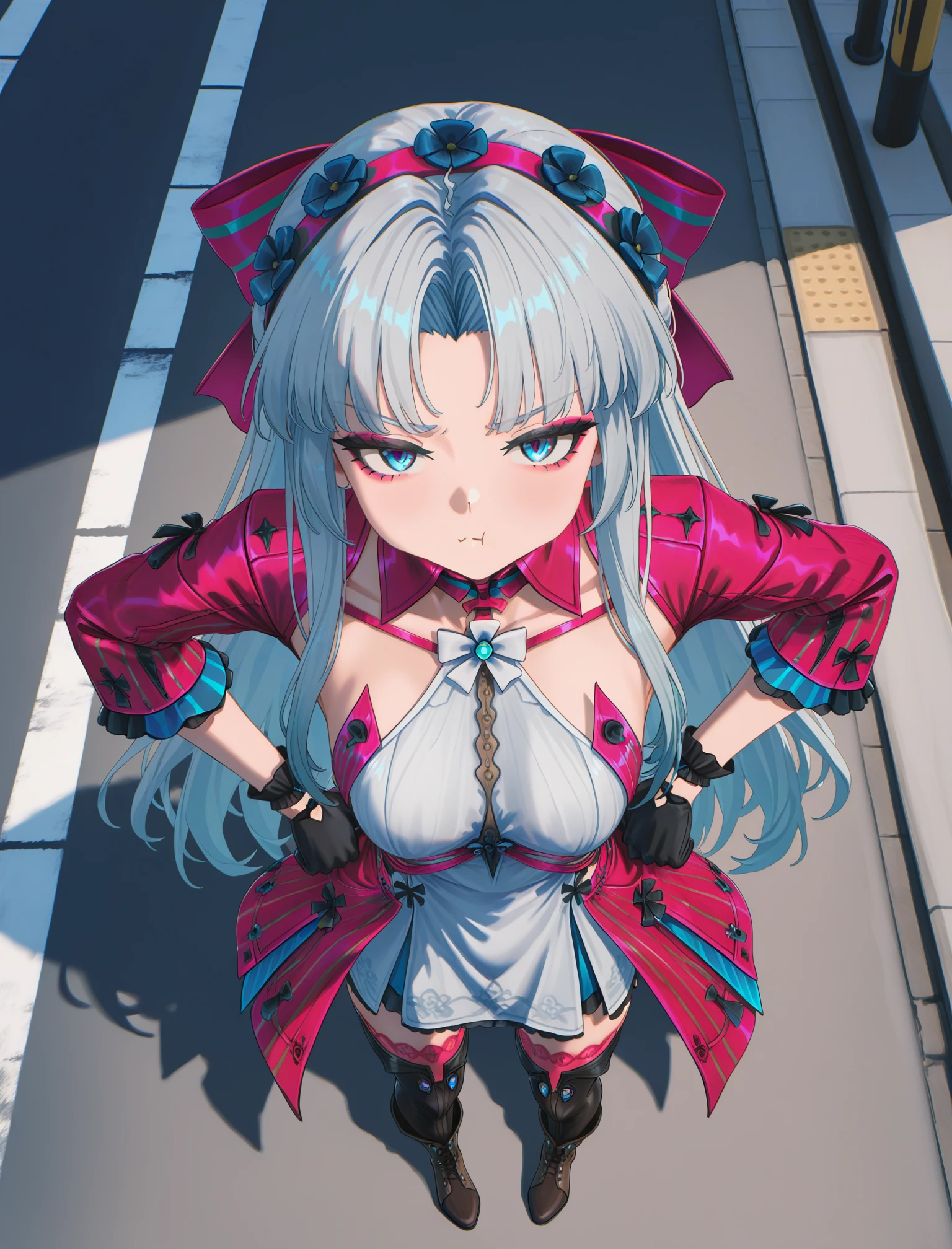 Carlotta, long hair, dress, thighhighs, boots, blue eyes, grey hair, red jacket, black gloves