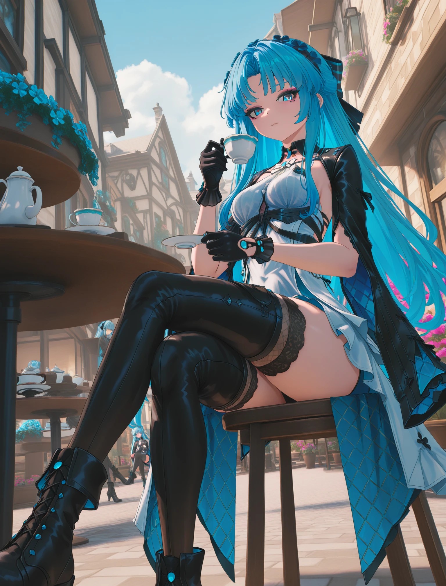 Carlotta, long hair, dress, thighhighs, boots, blue eyes, grey hair, red jacket, black gloves,  masterpiece, best quality, newest, absurdres, highres, very awa