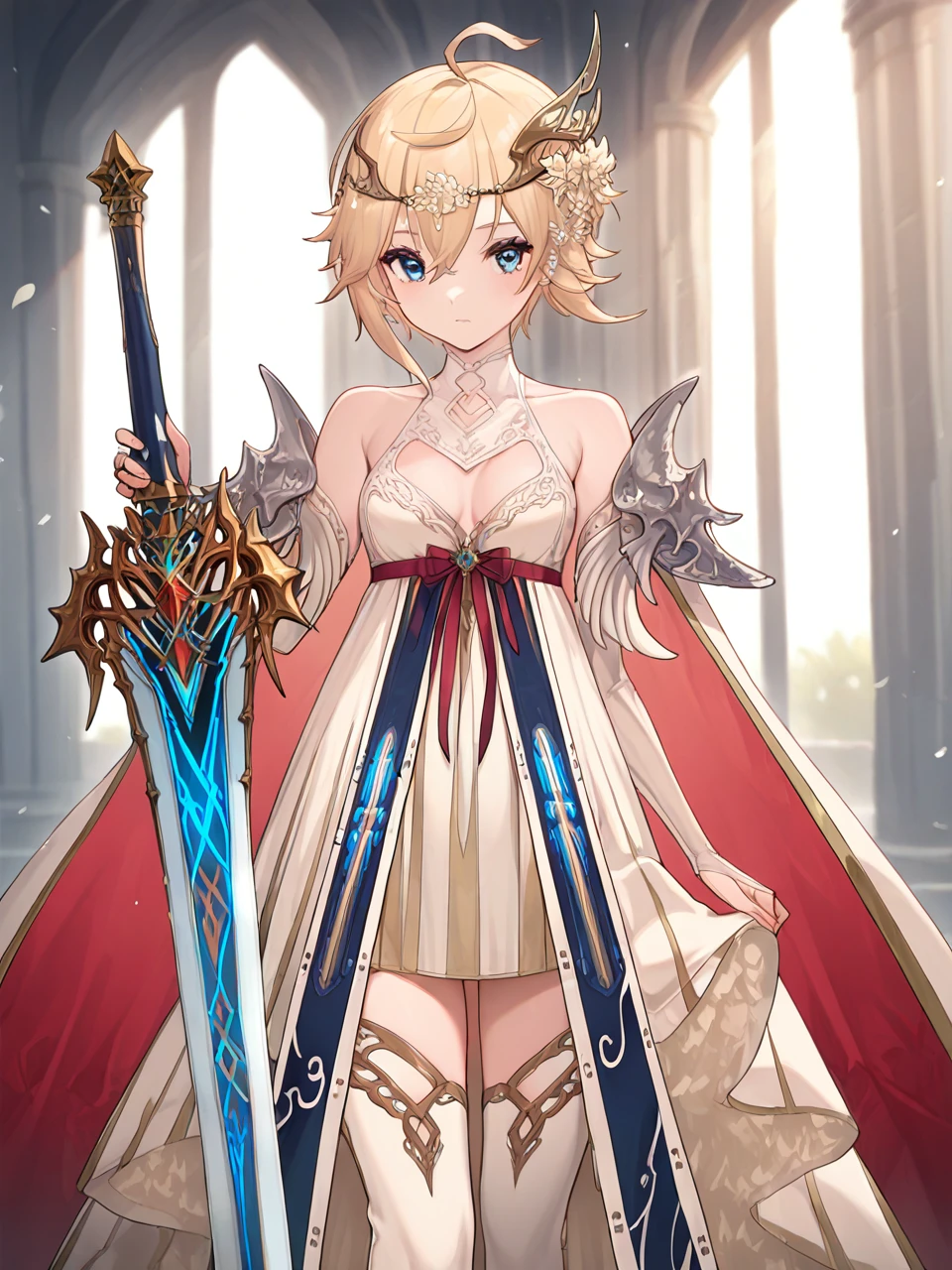cano,ahoge,single hair ornament,circlet,hair flower,blonde hair,short hair,blue eyes,bare shoulders,shoulder armor,cloak,white dress,red ribbon,bridal gauntlets,white thigh boots,holding master sword