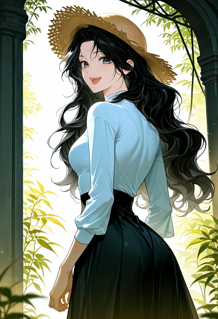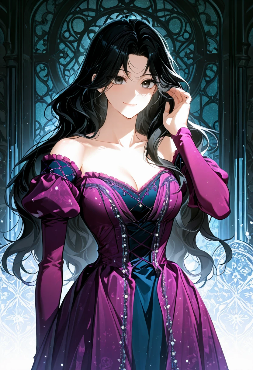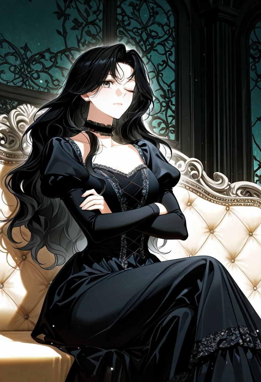 hailey, black hair, long hair, wavy hair, parted bangs, curtained hair, black eyes