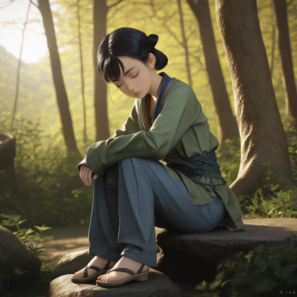 blindgirl, 1girl, solo, black hair, , hair bun, clothes,sleeves past wrists, sash, pants, long sleeves,sandals, closed eyes,blind,asian,3d,day