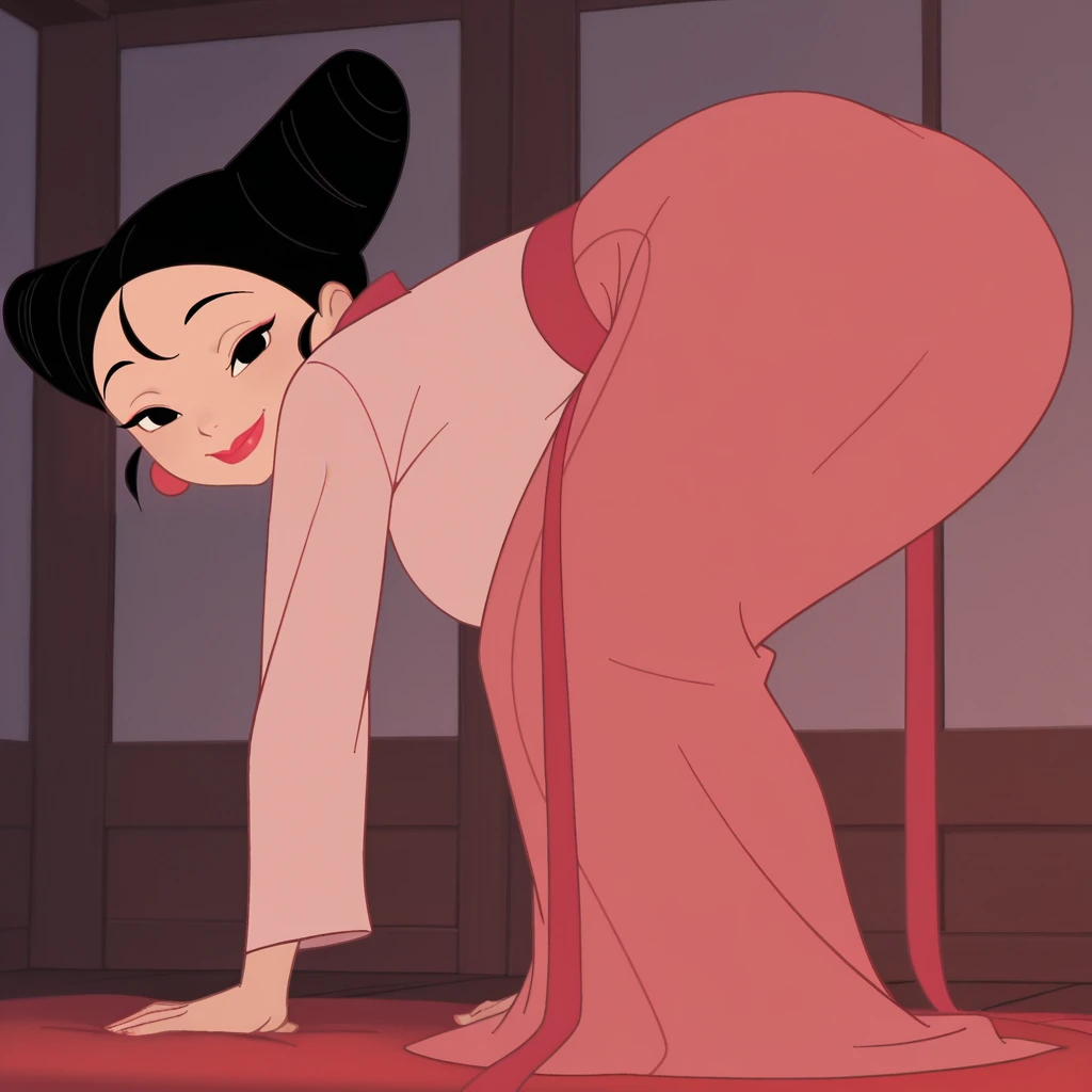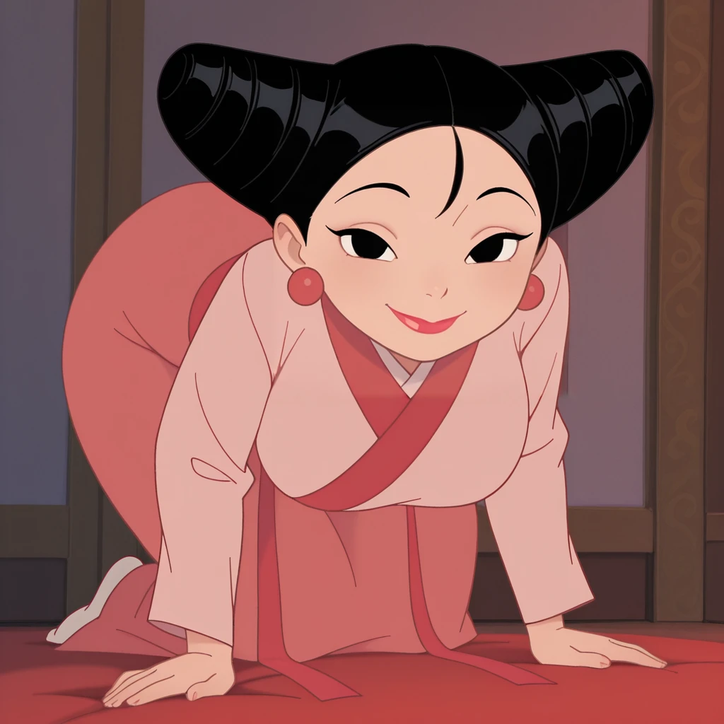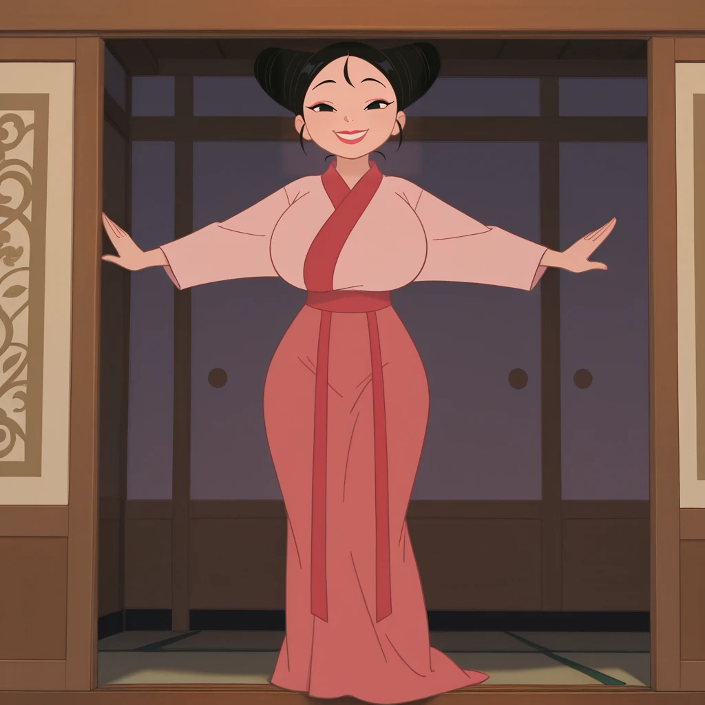 TAGS: two buns hairstyle, long black hair, asian, slanted eyes, hair bun, traditional chinese clothes, red sash, long sleeves, pink dress, light pink hanfu hanfu, black eyes, lipstick, sash belt