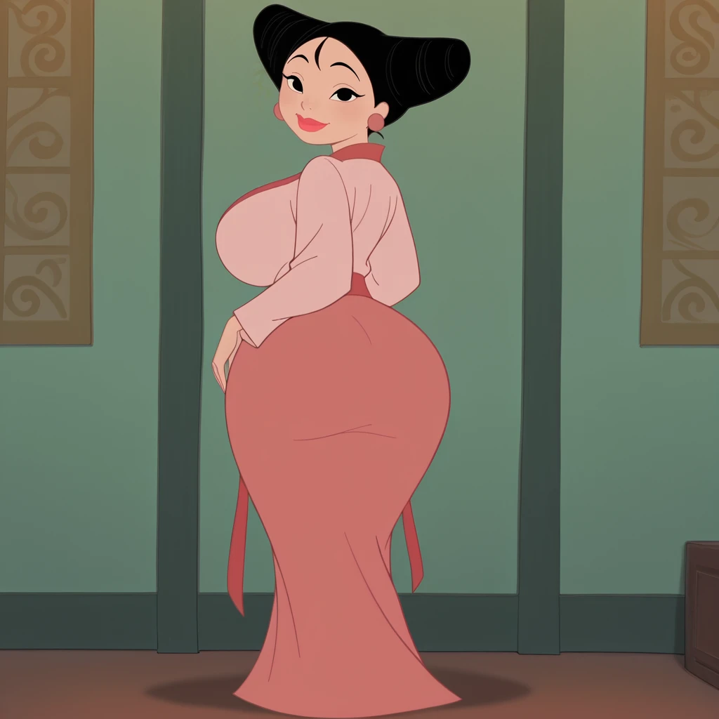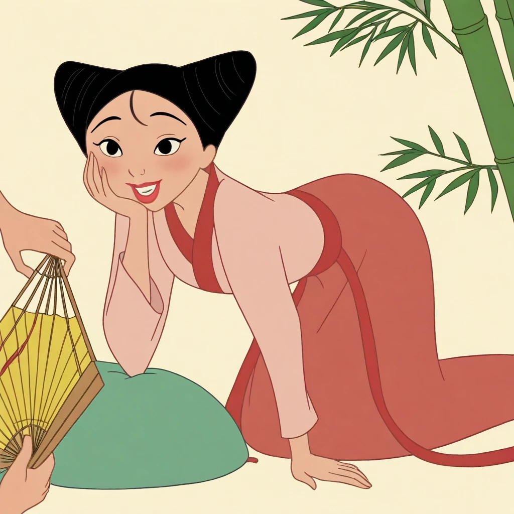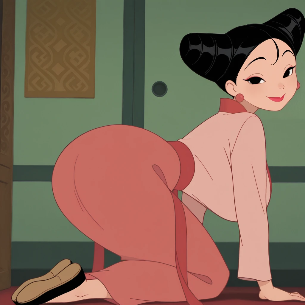TAGS: two buns hairstyle, long black hair, asian, slanted eyes, hair bun, traditional chinese clothes, red sash, long sleeves, pink dress, light pink hanfu hanfu, black eyes, lipstick, sash belt