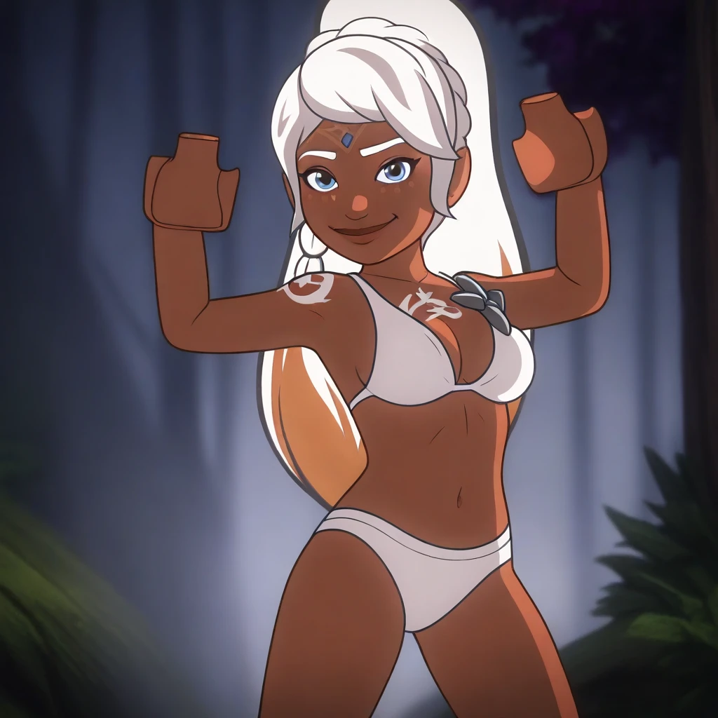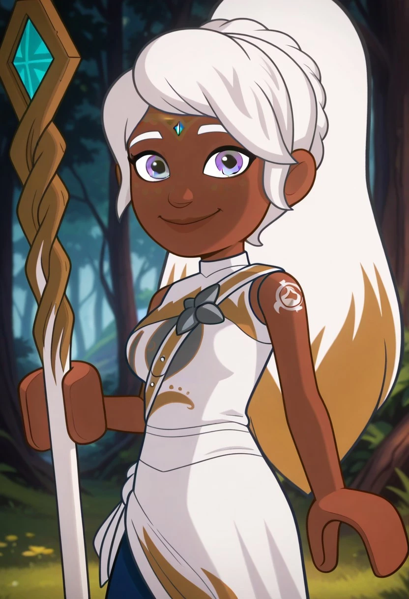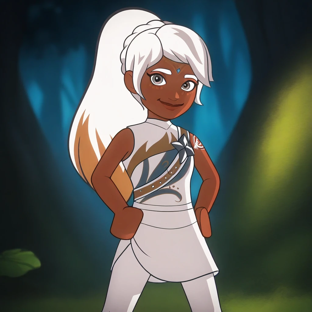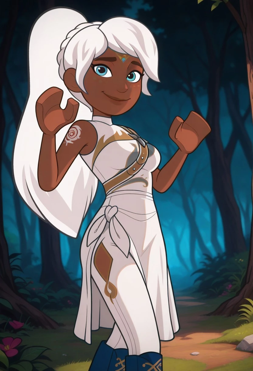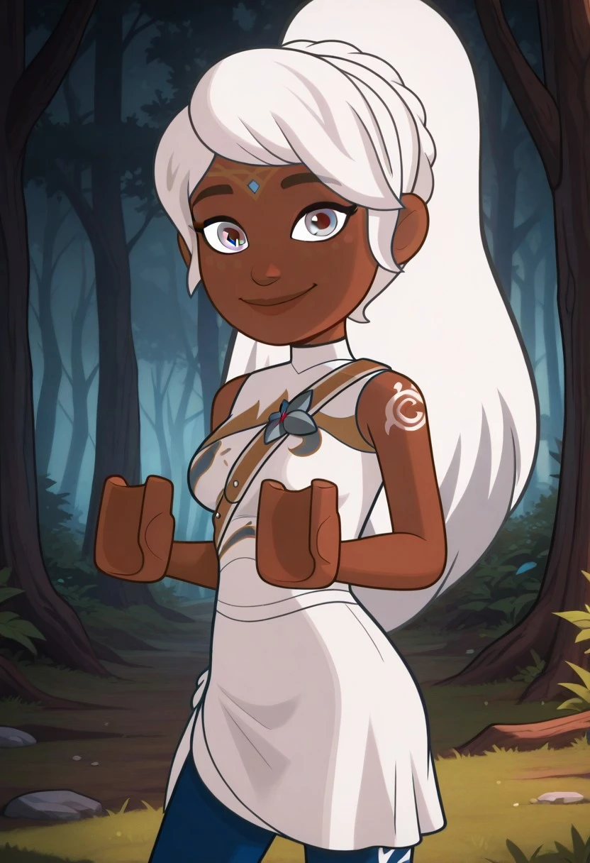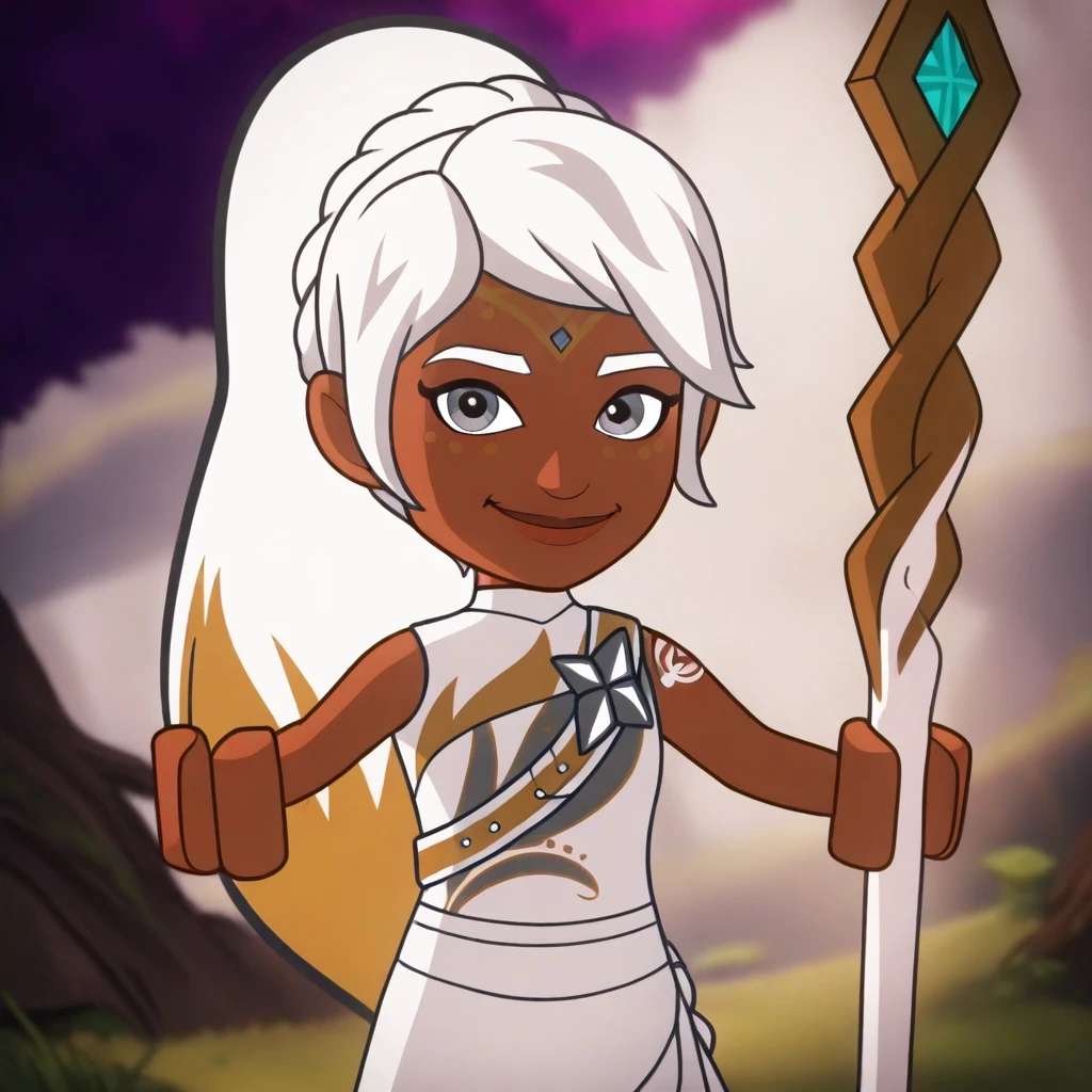 Lumia, white hair, silver eyes, gradient hair, dark-skinned, tattoo on cheek, ponytail, long hair, Lego hands, solo,