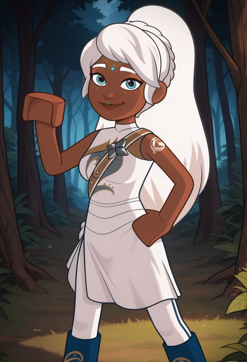 white dress, sleeveless, bare shoulders, midnight blue leggings, midnight blue boots,