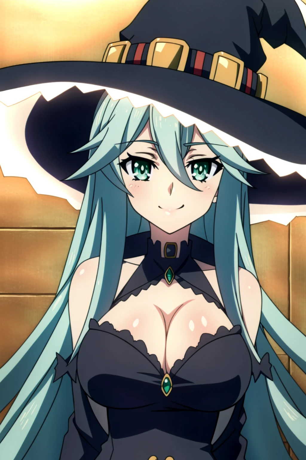 Natsumi Kyouno, 1girl, hat, solo, green hair, long hair, green eyes, witch hat, breasts, cloud, sky, staff, star (symbol), cape, bodysuit, day