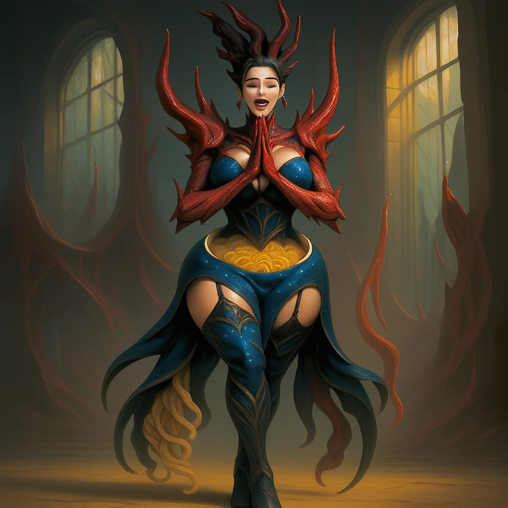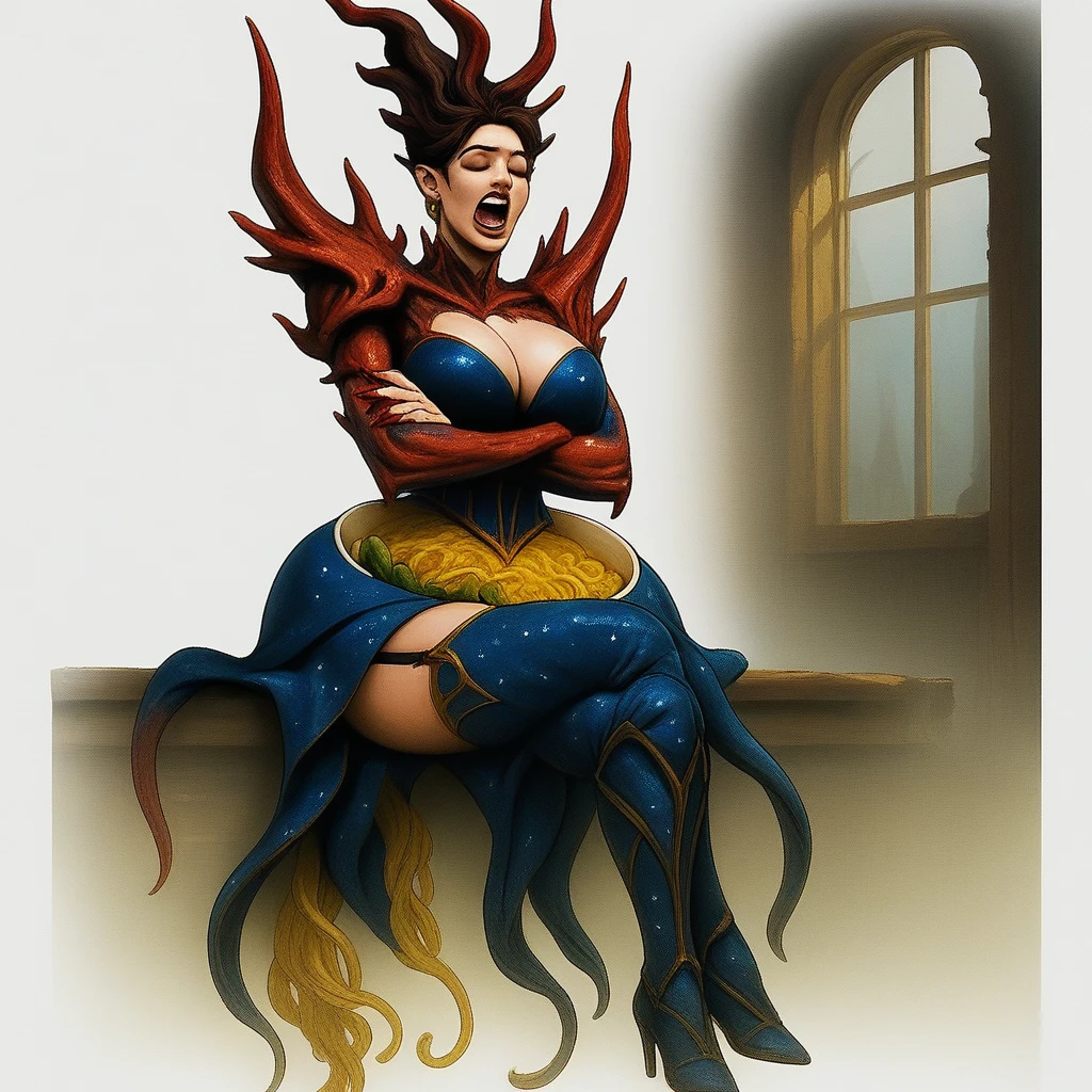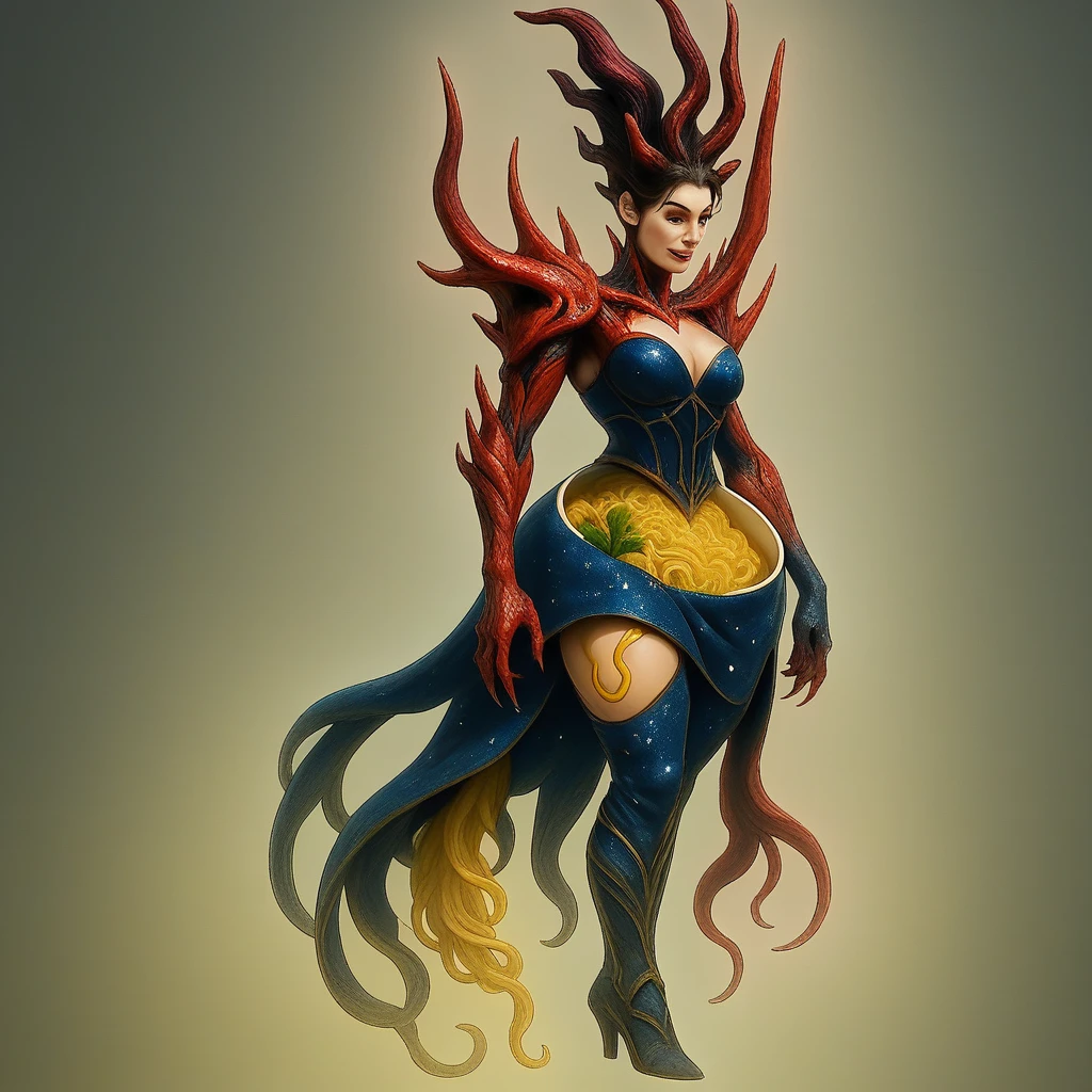 1woman, ramepelvia nyxboolta, ramen, noodles, bowl, bowl as hip, a bowl of ramen noodles as pelvis, dark blue corset, ramen abdomen, golden thigh binding, red coral armor, horns, red coral horns, claws, red claws, starry night dress, starry night fabric, asymmetrical skirt, high heels, coral hair, coral crown, body horror, mutation, food-themed