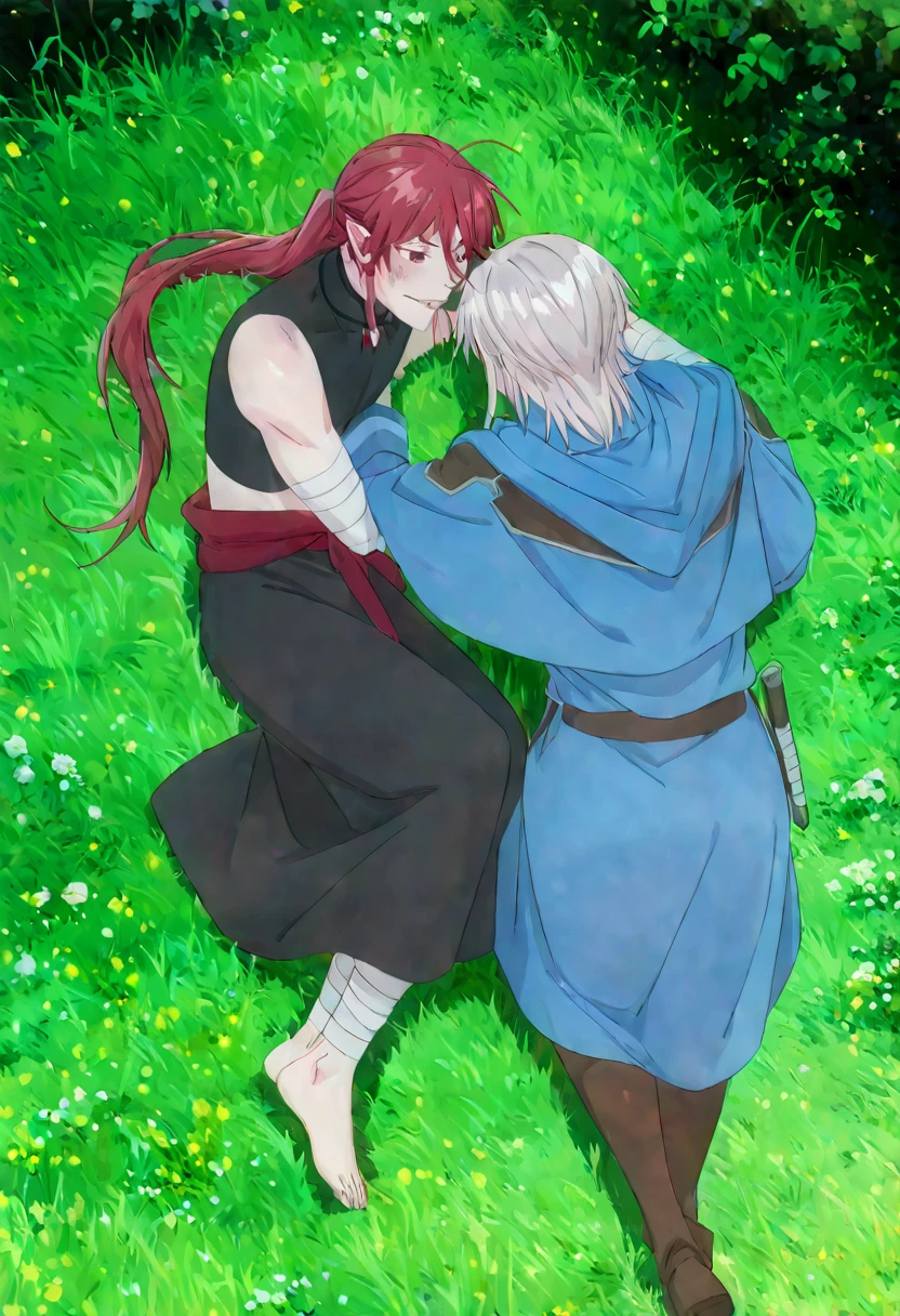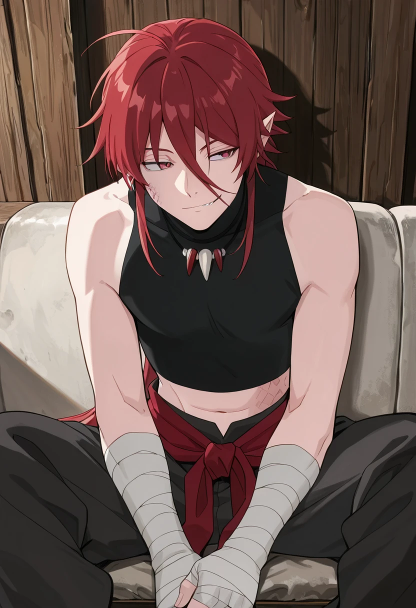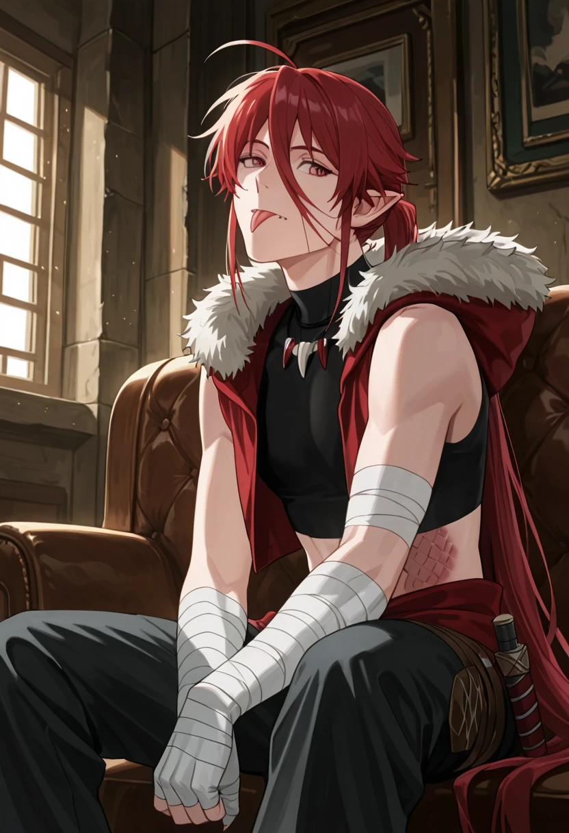 El3ven, male, red eyes, long hair, ponytail, ahoge, hair between eyes, pointy ears, bifid tongue, bandages, bandaged arm, crop top, sleeveless, turtleneck, midriff, navel, pants, sandals, necklace,