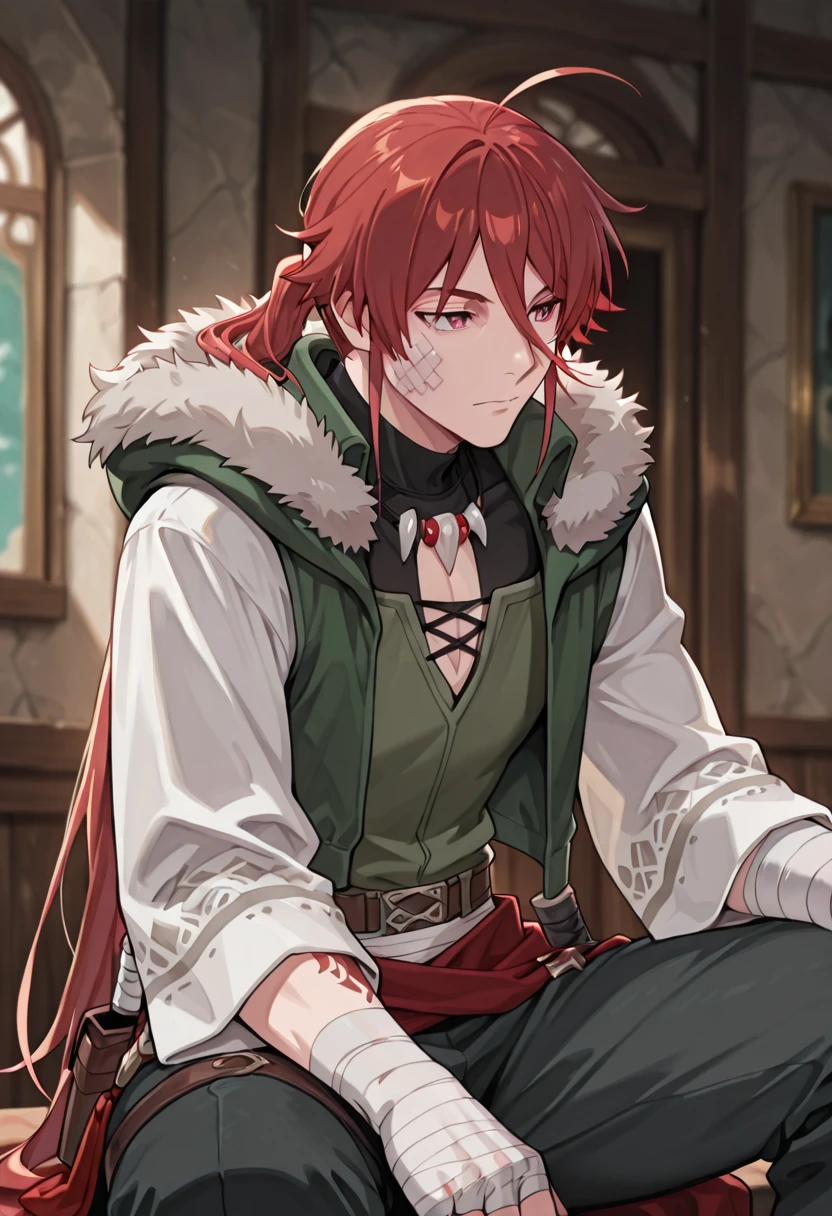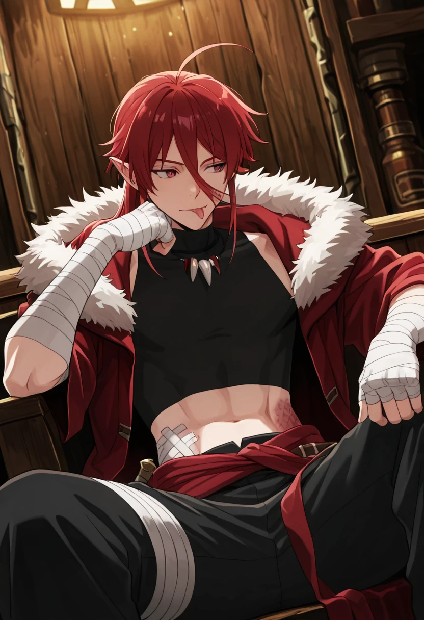 El3ven, male, red eyes, long hair, ponytail, ahoge, hair between eyes, pointy ears, bifid tongue, new_outfit, bandages, tattoo, fur trim, pants, jewelry