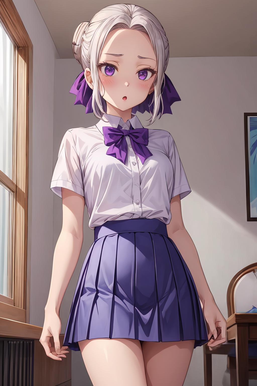 套装二,white shirt,collared shirt,purple bowtie,short sleeves,pleated skirt,blue skirt,