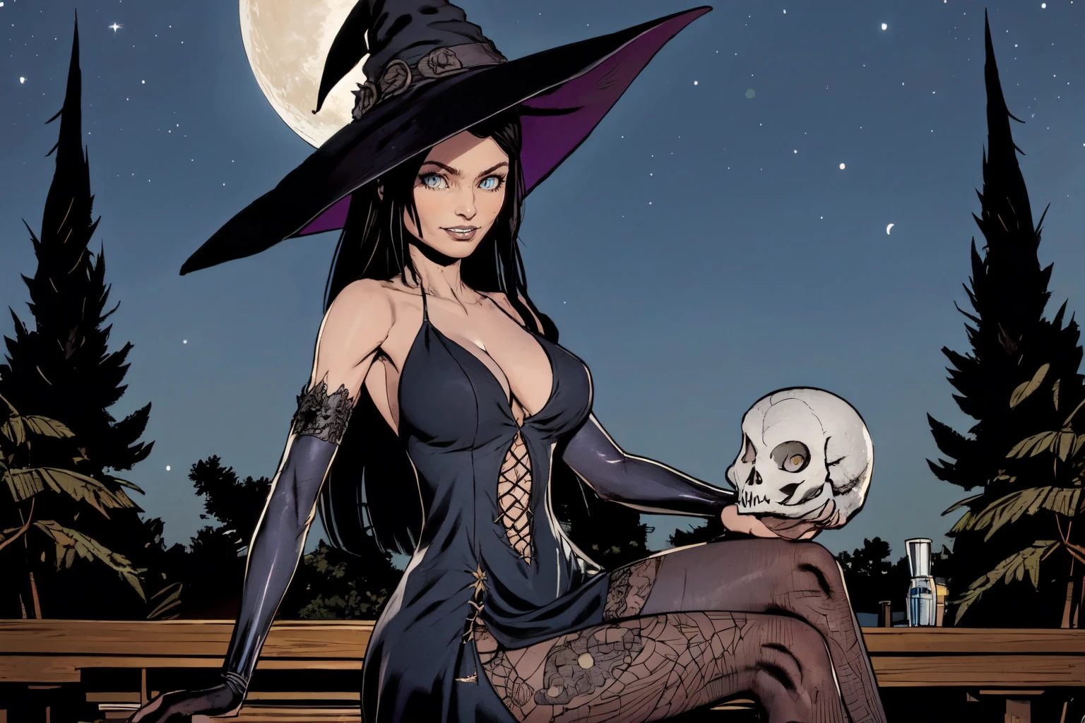 Trigger Witch : 1girl, long hair, dress, cleavage, spiderweb stockings, witch hat, witch, detached sleeves, black nails, heels