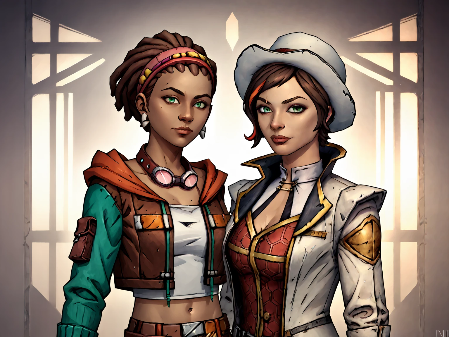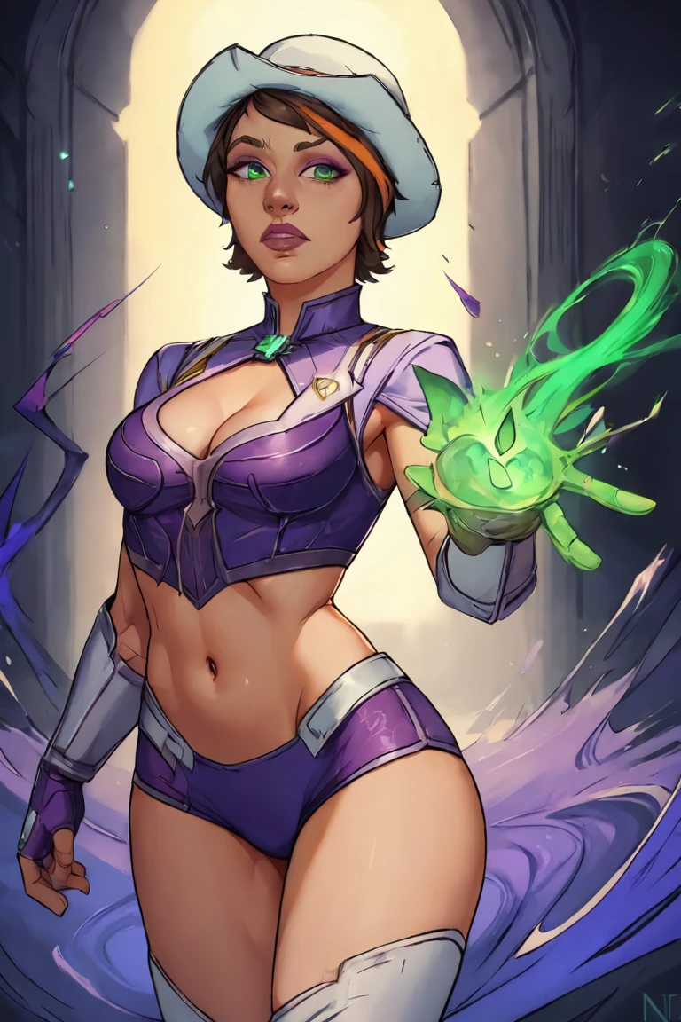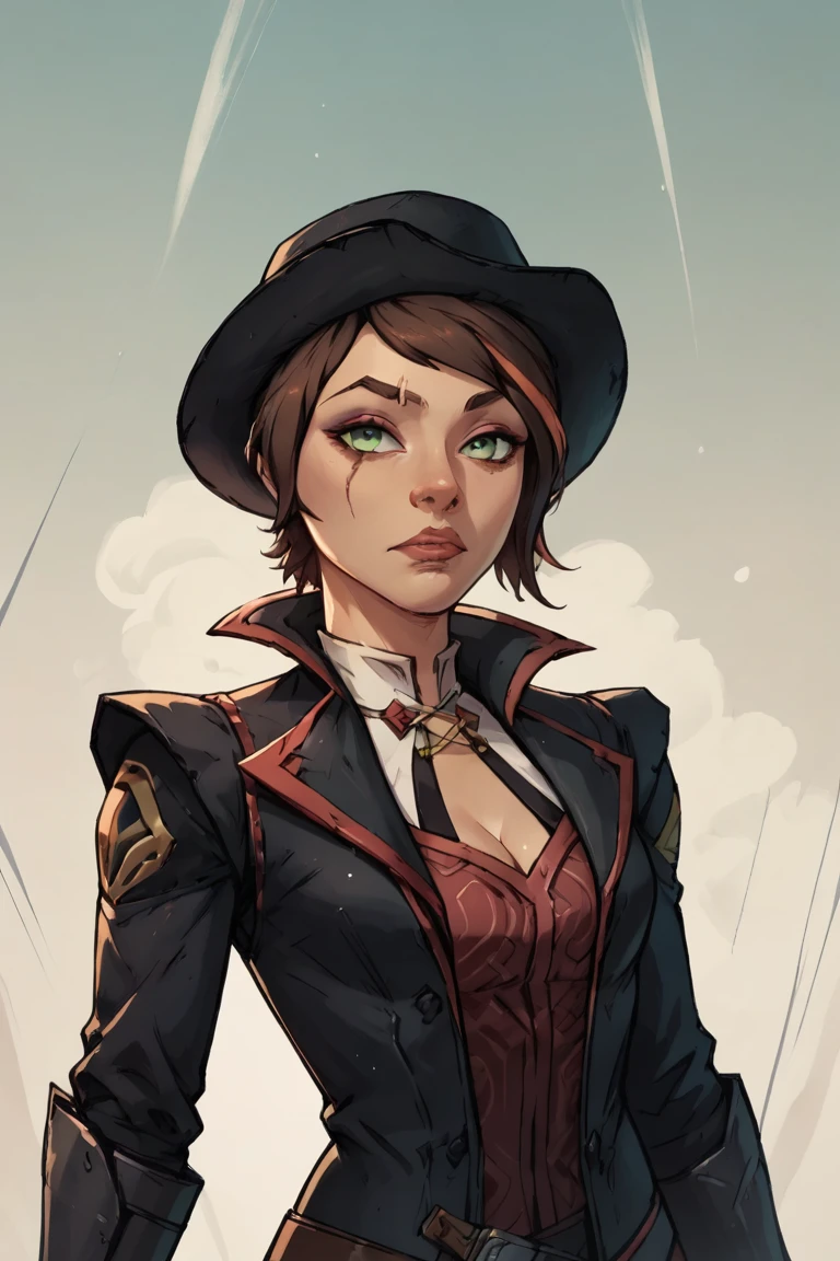 <lora:FionaV1.4:0.8>, 1girl, brown hair with red streak, hair with red streak, eyeshadow, fionatftbl, green eyes,red business coat, red shirt, blue nail polish, white headwear , white hat, short hair, white pants, brown boots, belt, smirk