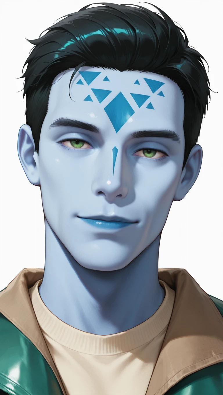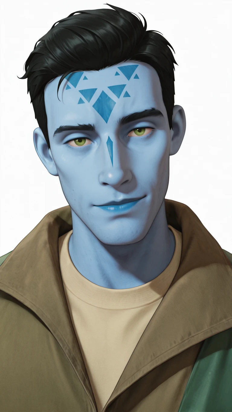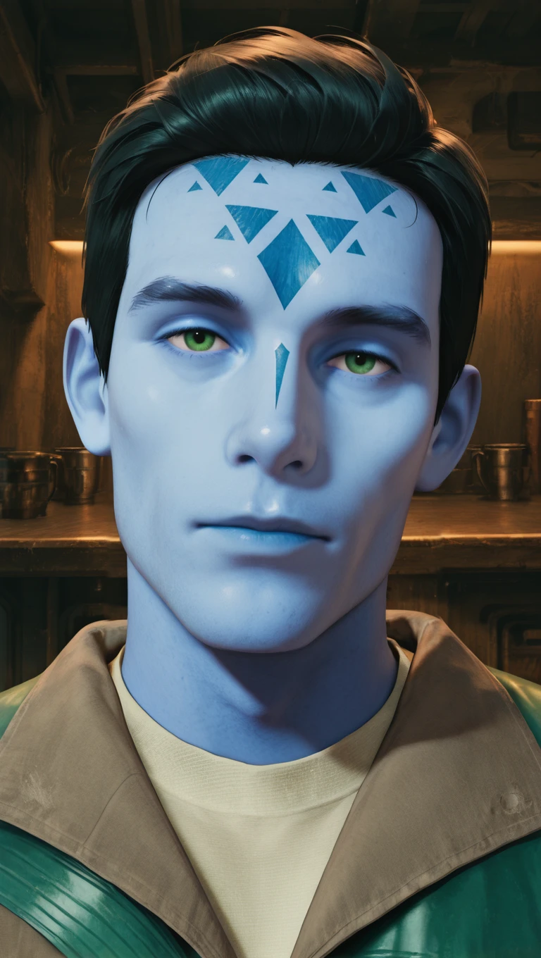 swmoran, 1boy, short hair, black hair, blue skin, green eyes, geometric face tattoo, tattoo on nose, mirialan, blue lipsV1 outfit tags are as follows: