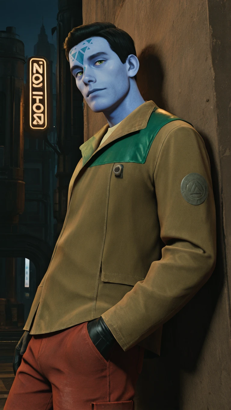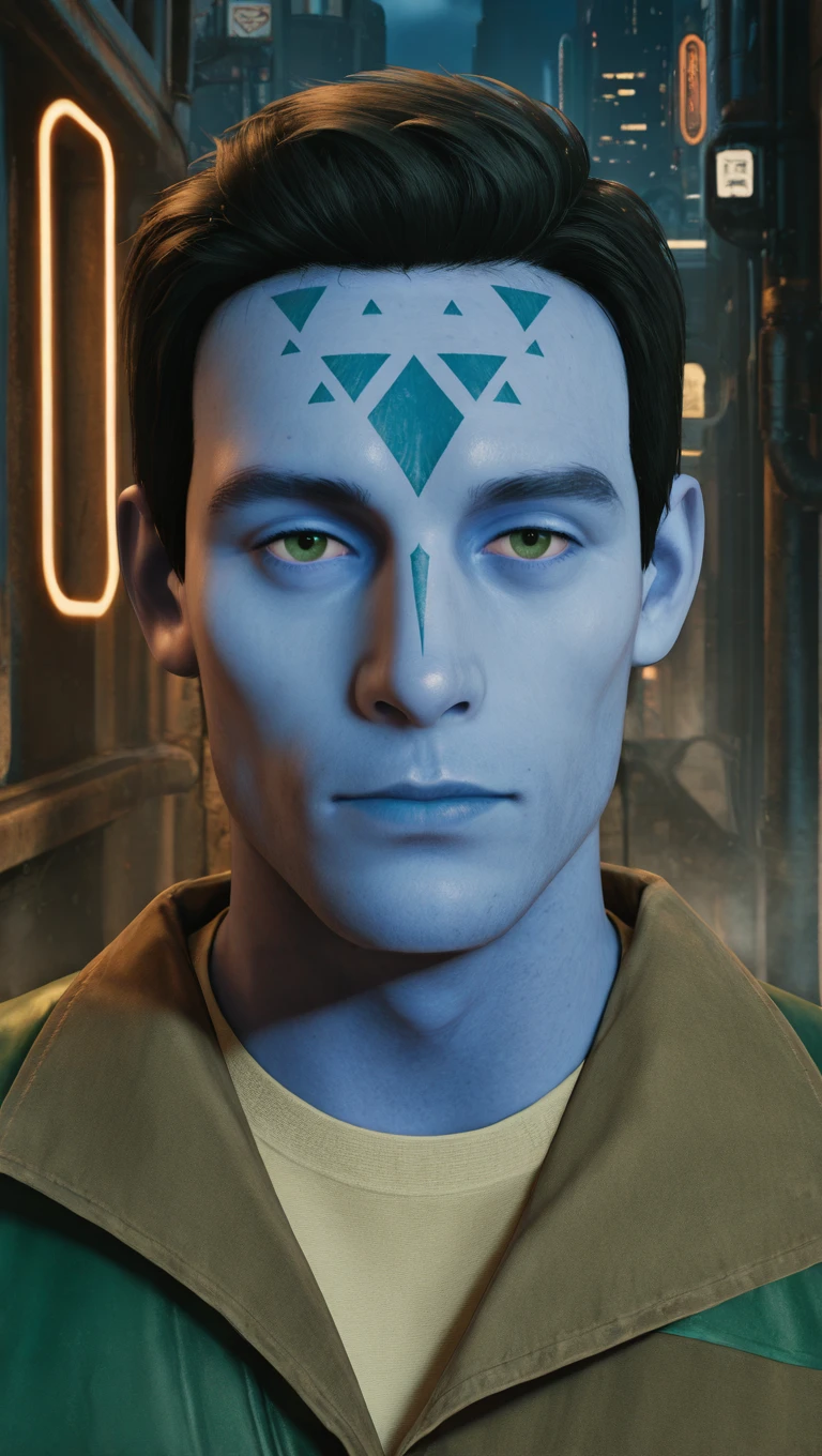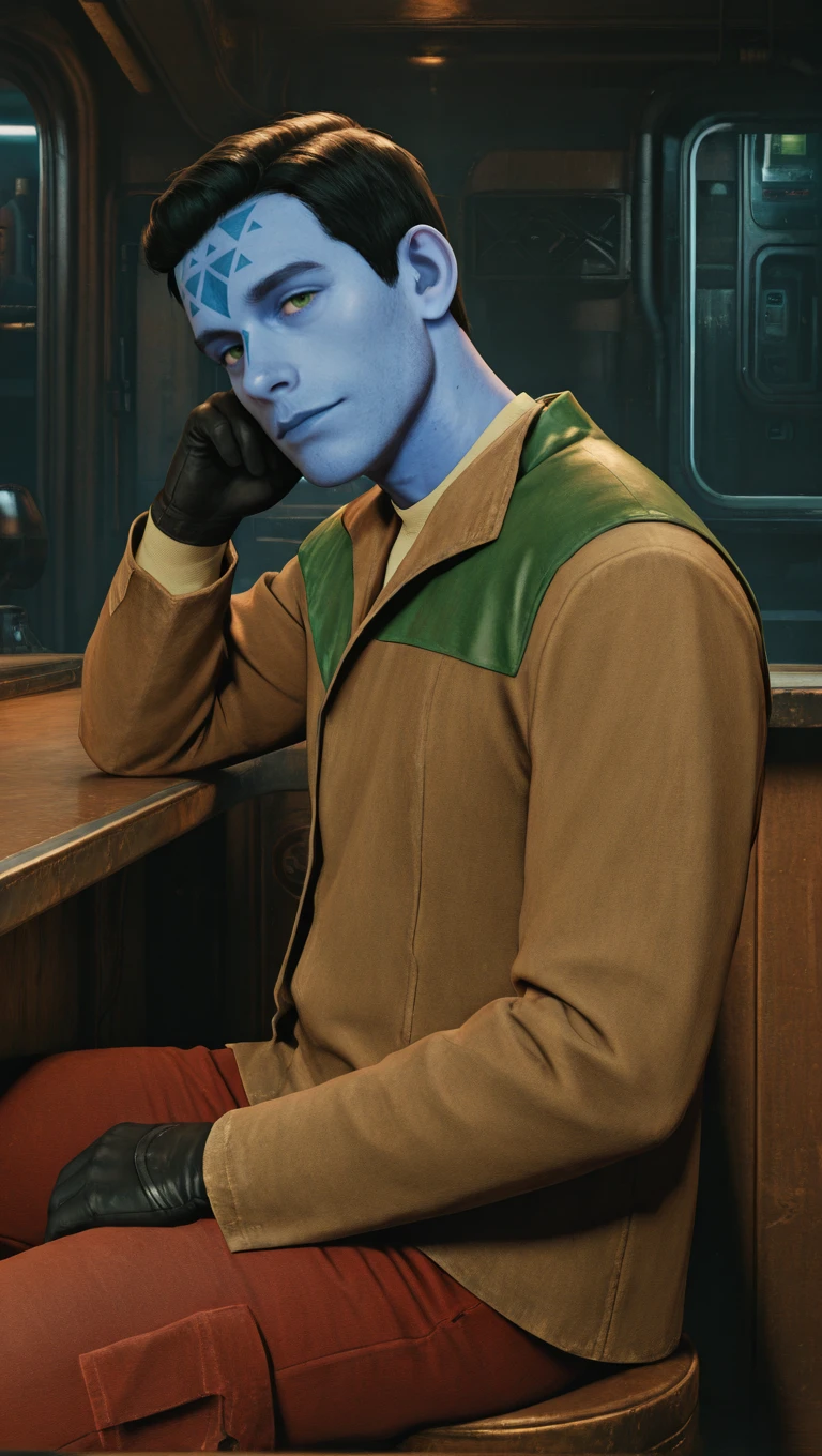 swmoran, 1boy, short hair, black hair, blue skin, green eyes, geometric face tattoo, tattoo on nose, mirialan, blue lipsV1 outfit tags are as follows: