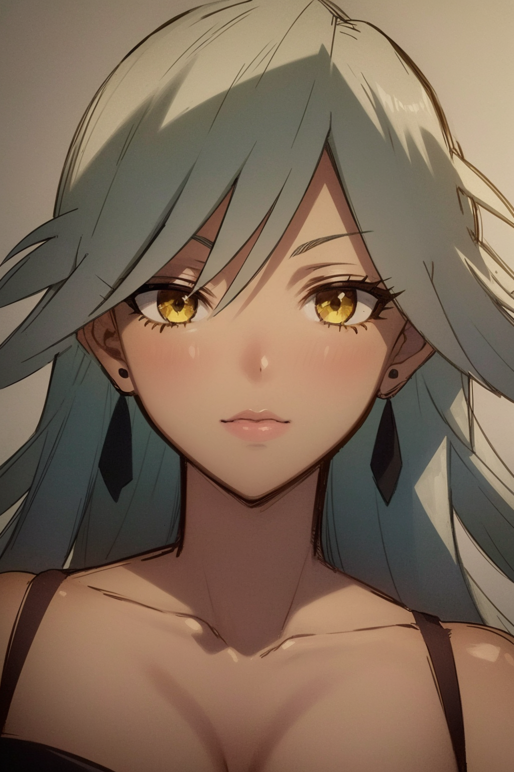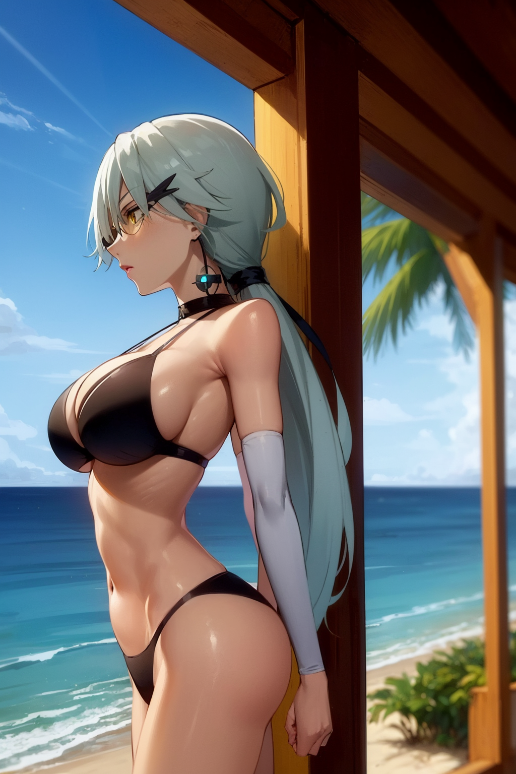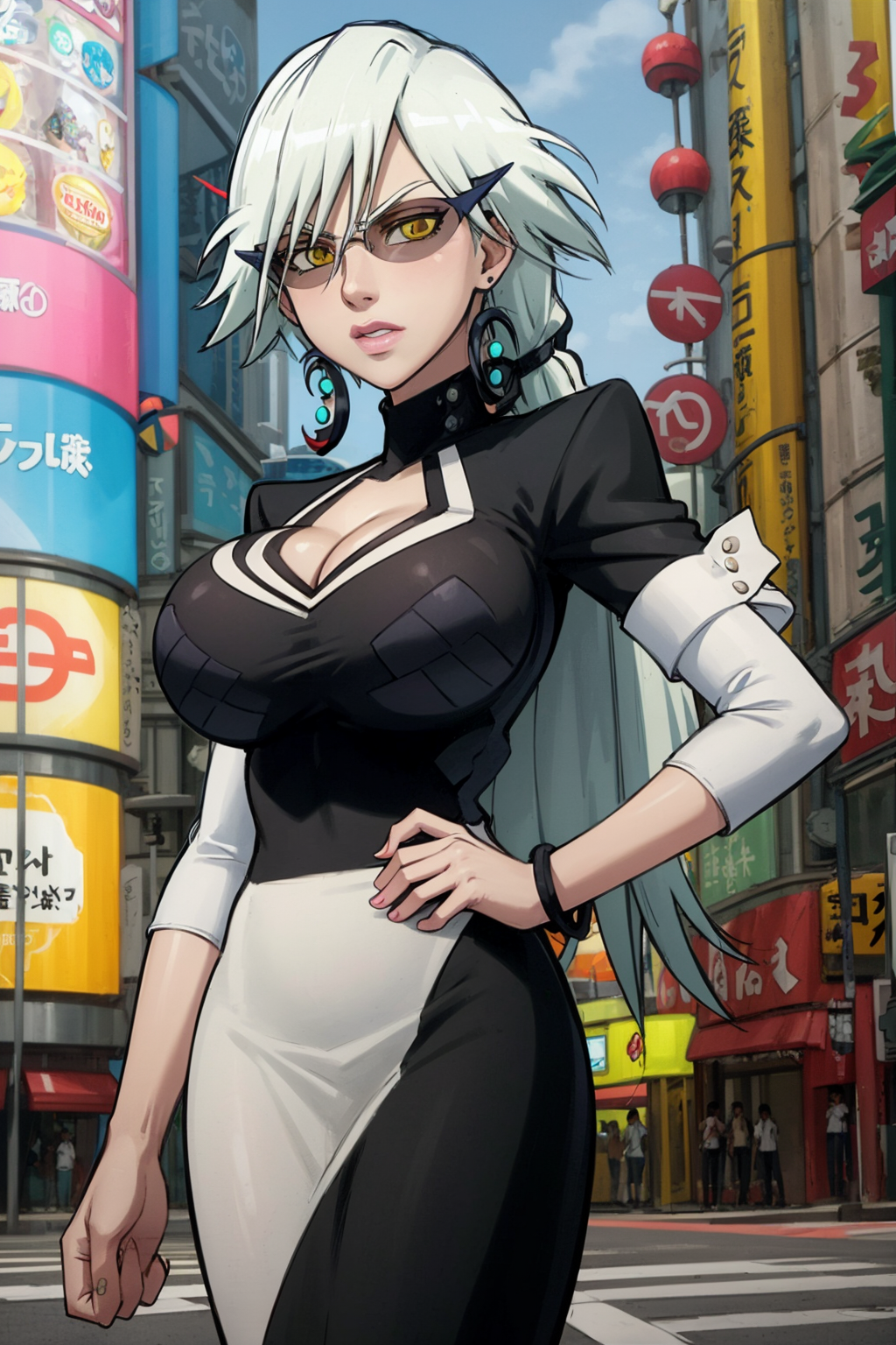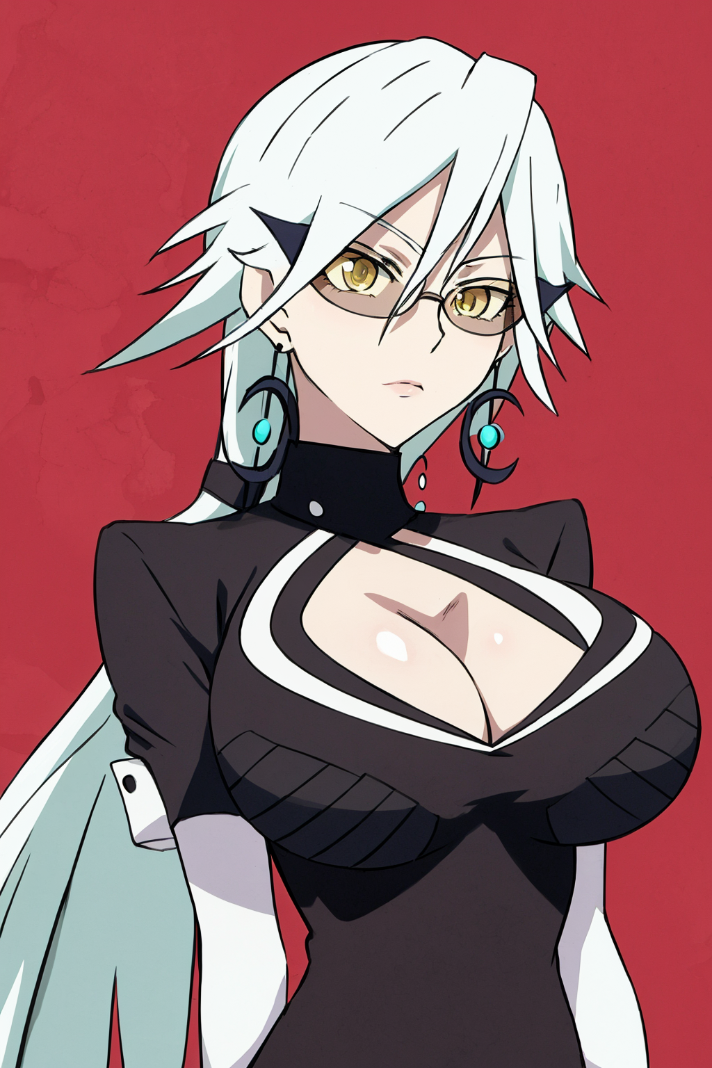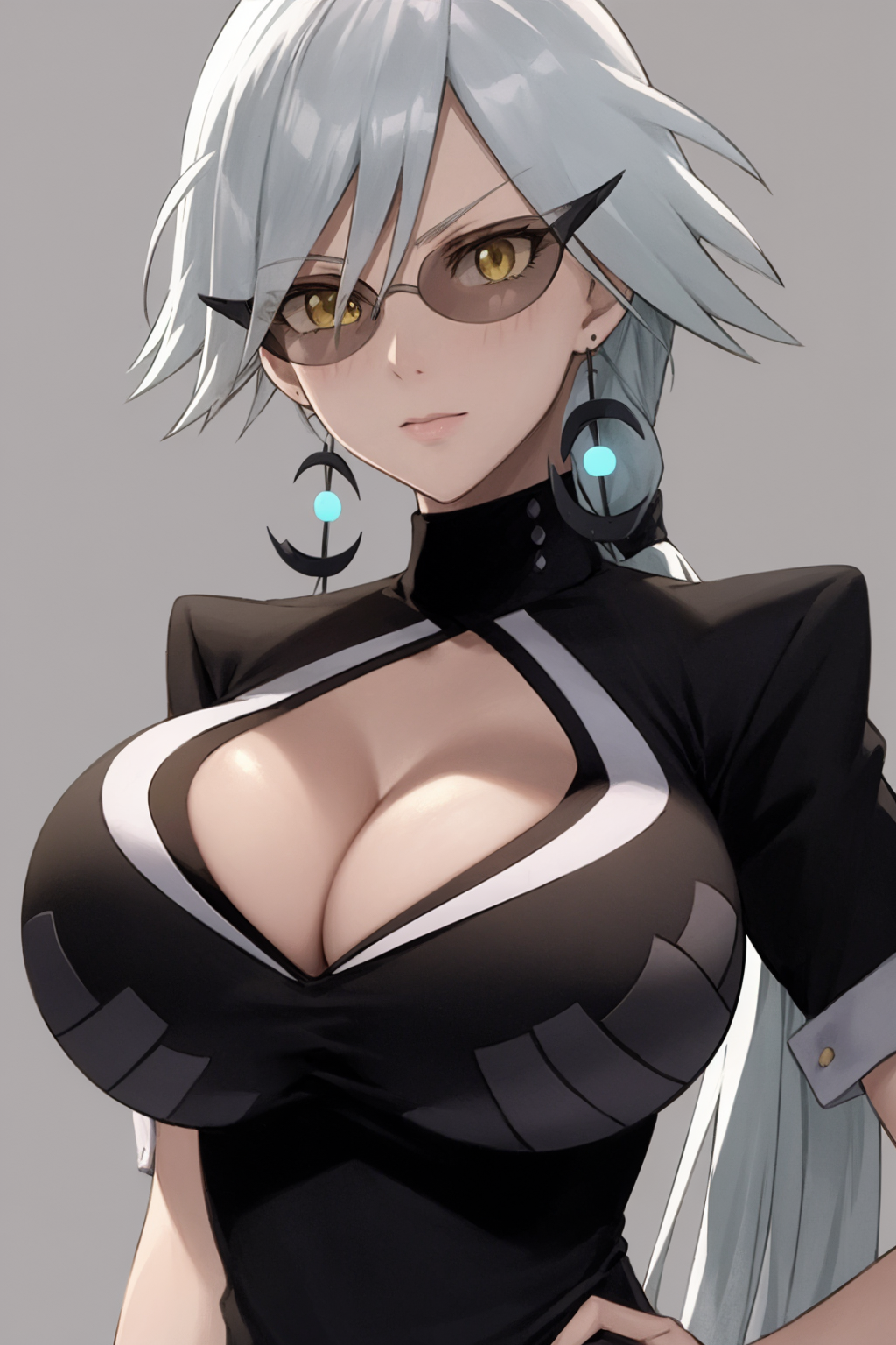 Other prompts : white hair, long hair, large breasts, cleavage cutout, clothing cutout, crescent earrings, yellow eyes, dress, lipstick, ponytail, makeup