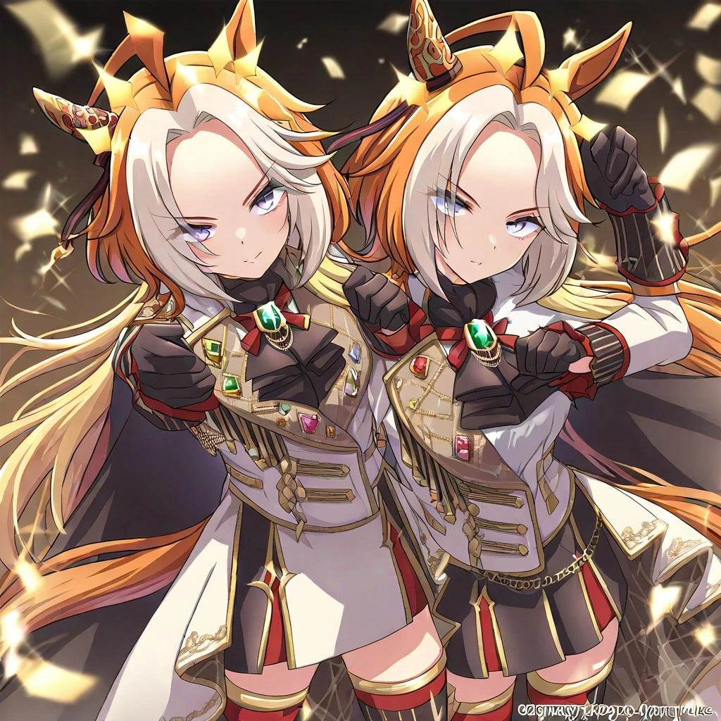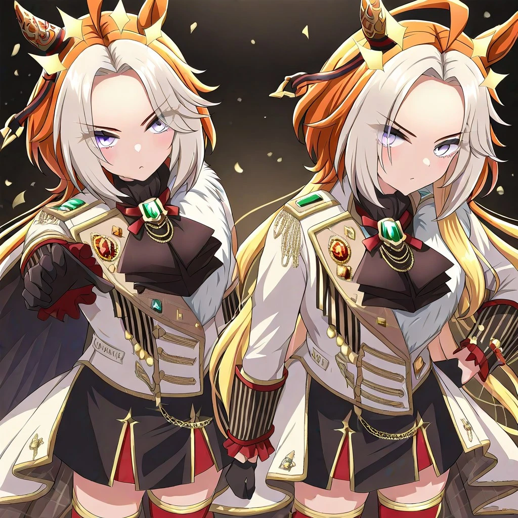 orfevre, Long hair, Multicolored Hair, Orange Hair, White Hair, Animal Ears, Horse Ears, Horse Girl, Purple Eyes, Crown, White Jacket, Long sleeves, Ascot, Black GLoves, Cape, Skirt, Thigh boots, Fur trim,