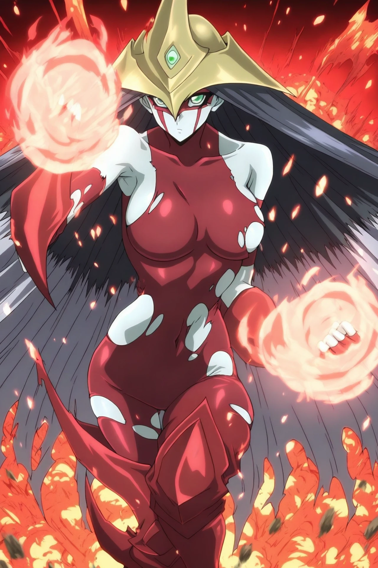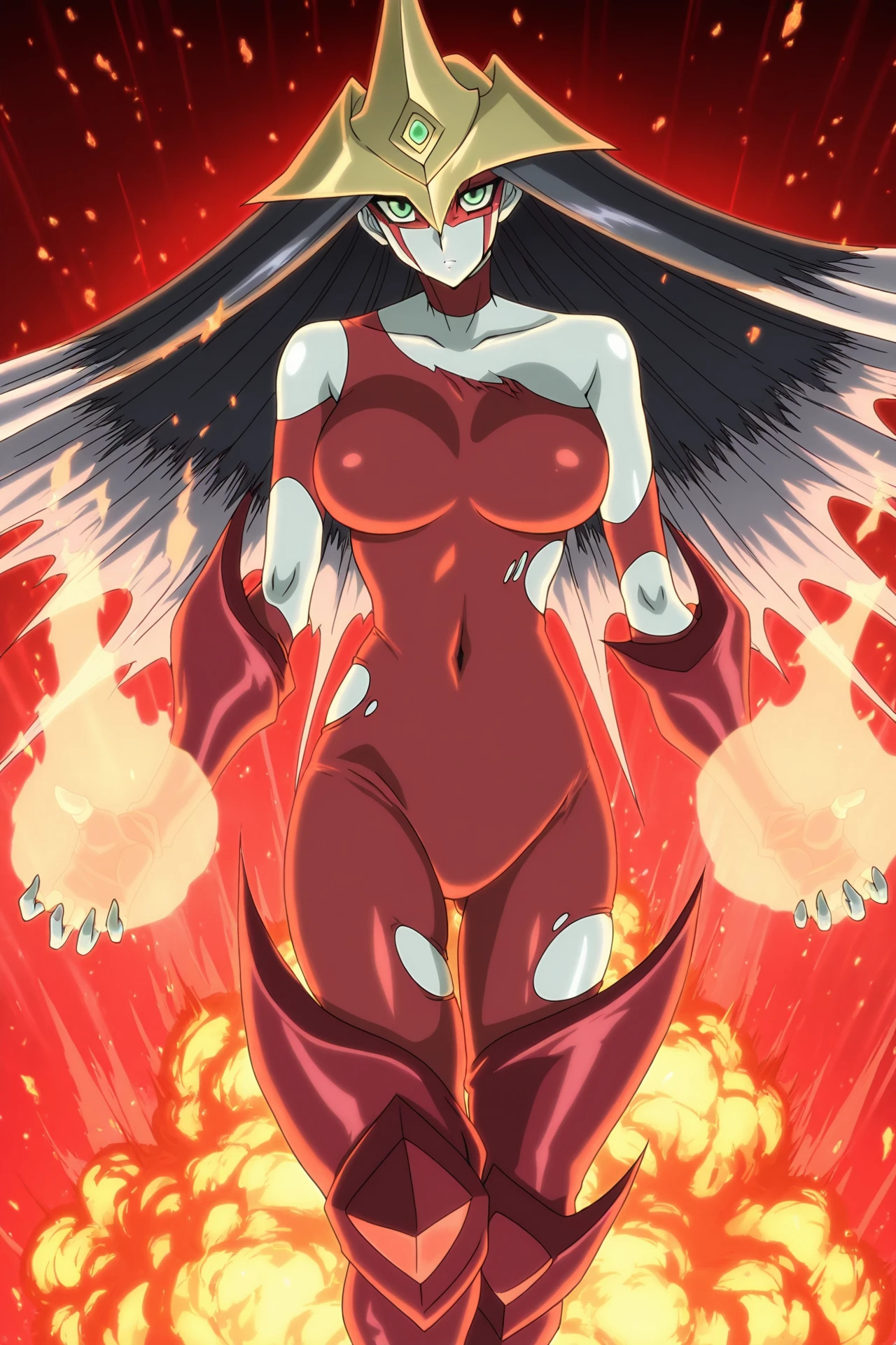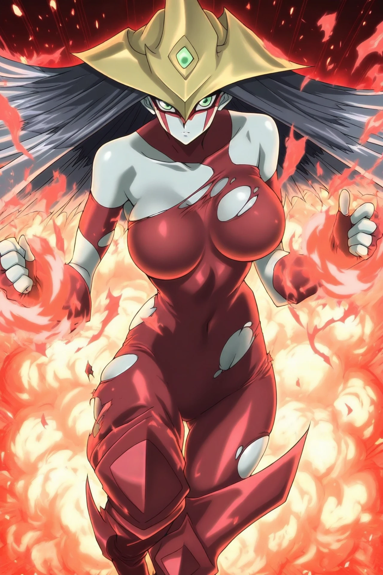 Burstinatrix, 1girl, solo, large breasts, black hair, thighhighs, green eyes, collarbone, boots, fingerless gloves, torn clothes, colored skin, thigh boots, duel monster, grey skin, red bodysuit, long hair, bare shoulders, grey hair, covered navel, red footwear