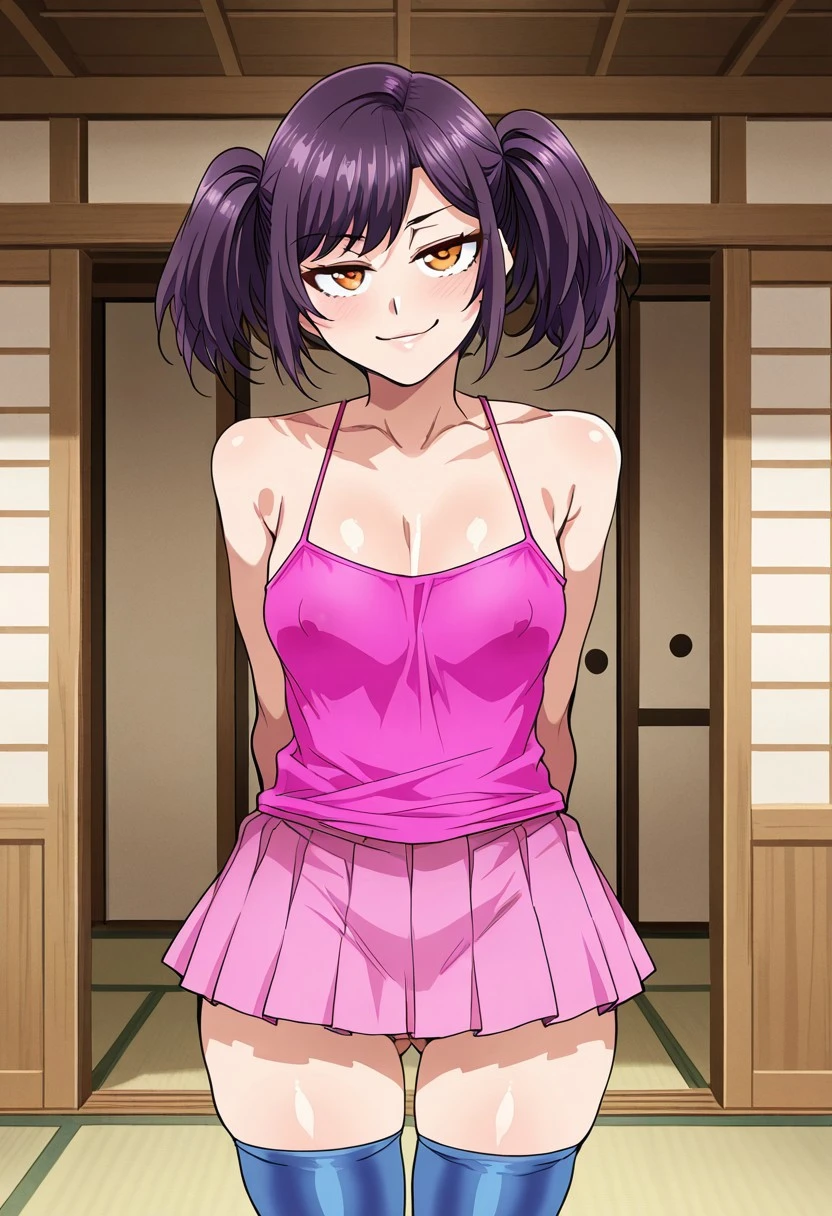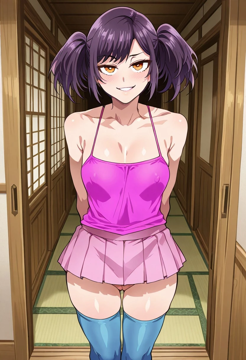 6. ((magenta camisole, pink pleated skirt, dark blue - light blue straped thighhighs, )) sexy pink panties,