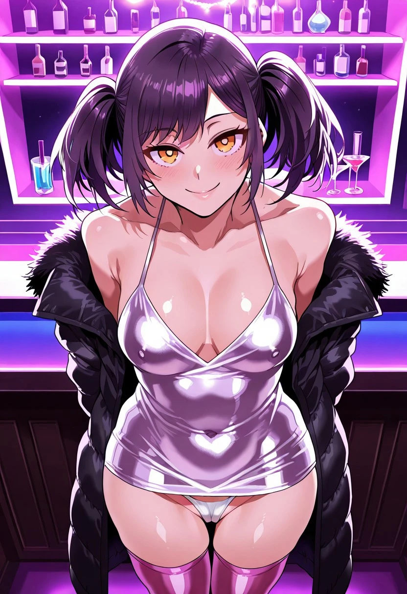 14. ((black coat with white fur trim, light blue sleeveless cocktail dress, white panties, pink thighhighs, )) light pink sleeveless cocktail dress,