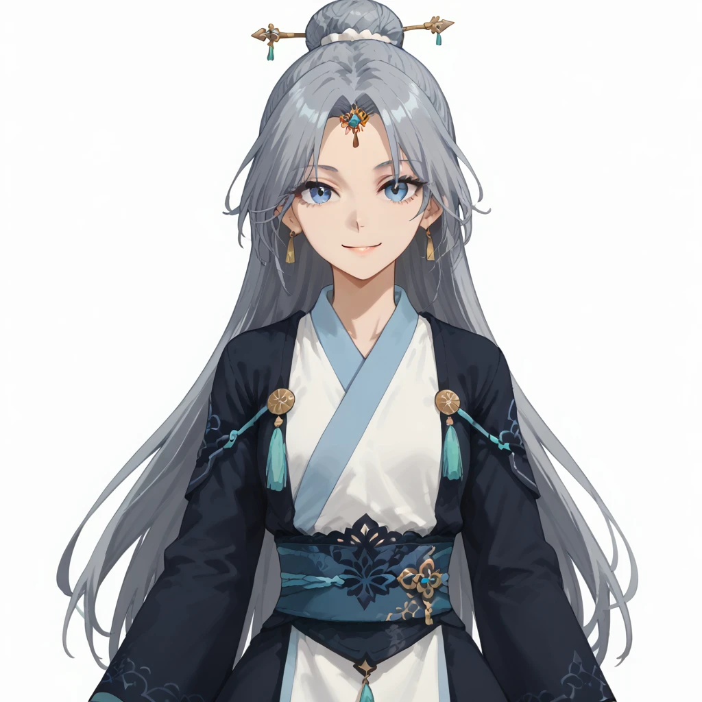 fu_hua_fusheng,long hair,bangs,blue eyes,parted bangs,hair bun,hair ornament,grey hair,blue hair,smile,earrings,single bun,