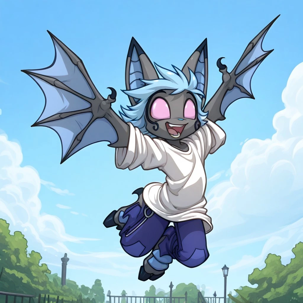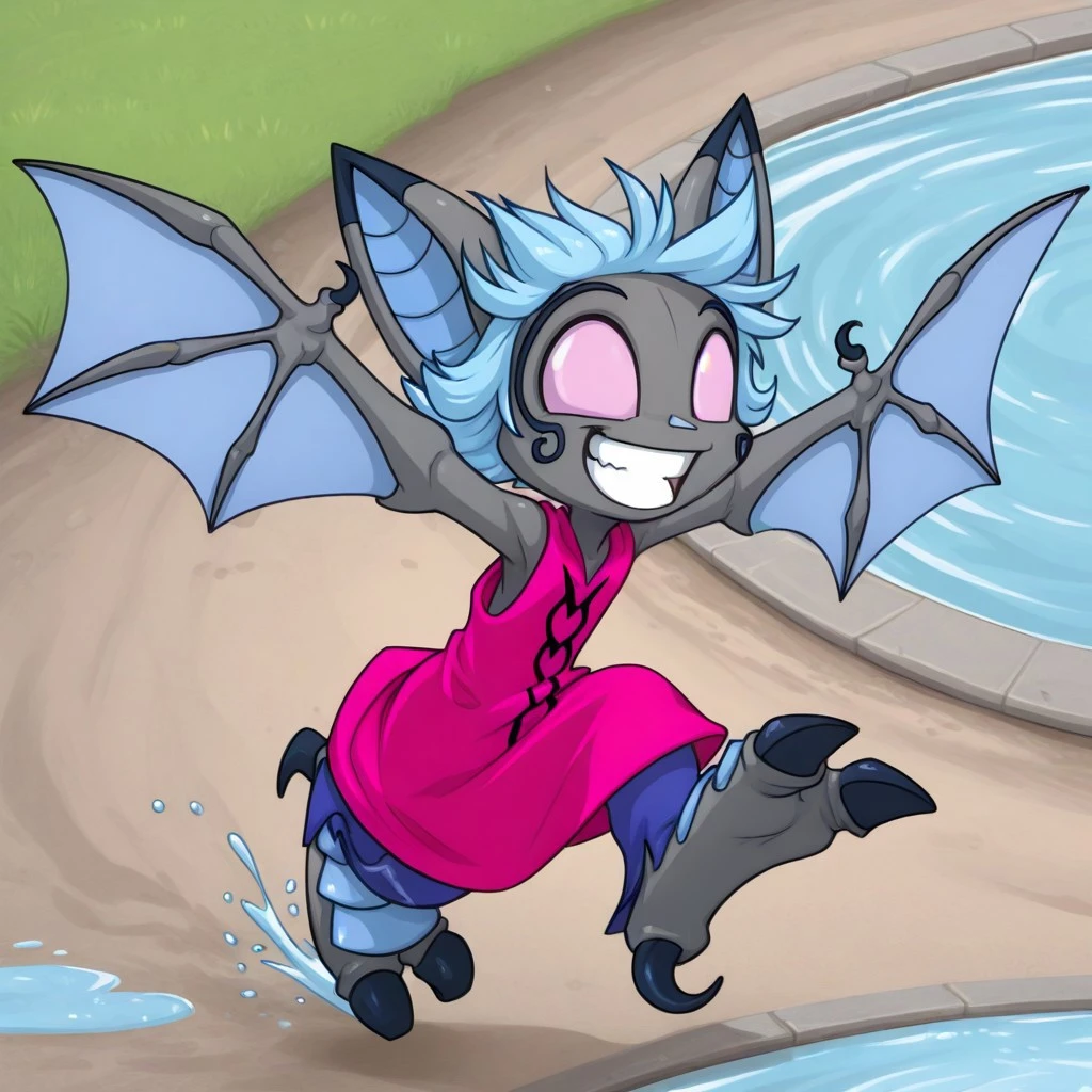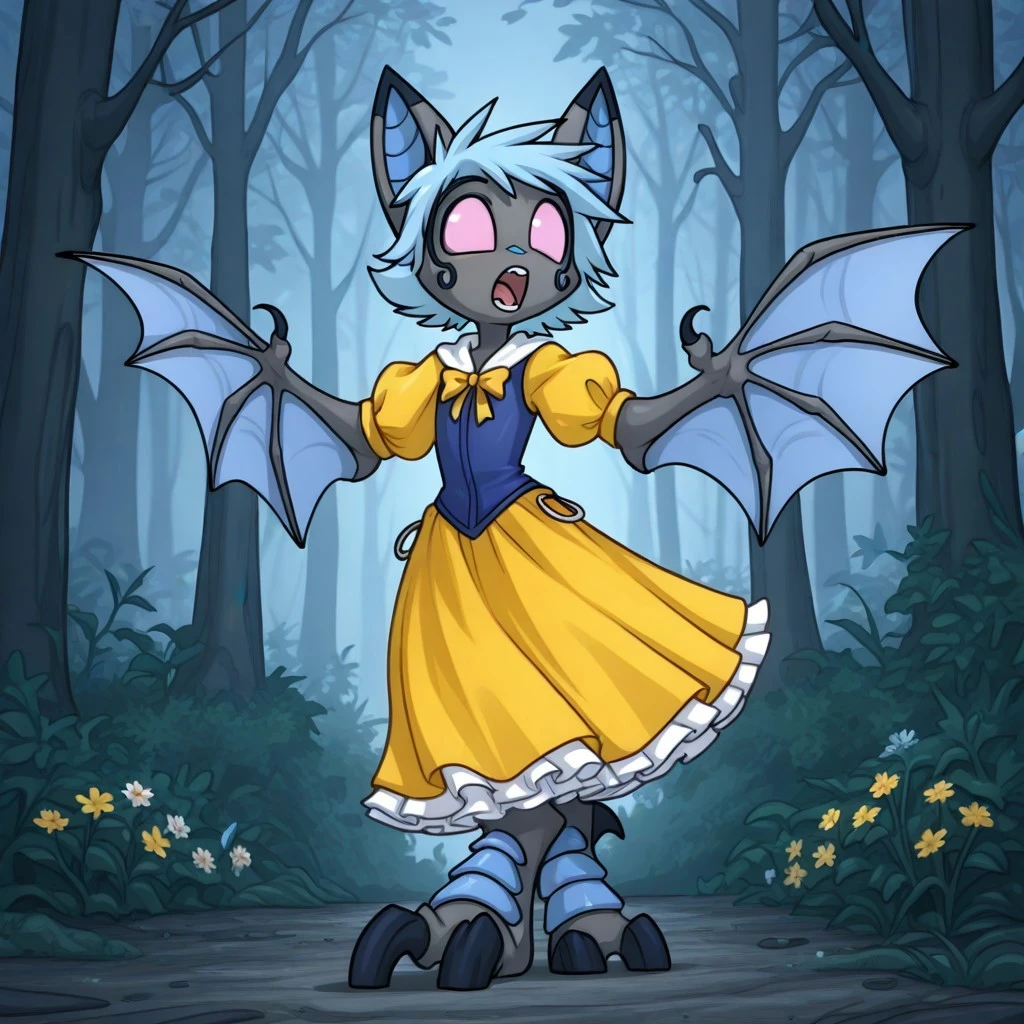 vanth, 1girl, solo, furry, furry female, bat girl, grey skin, short hair, blue hair, animal ears, bat ears, animal nose, pink eyes, no pupils, bat wings, animal feet,