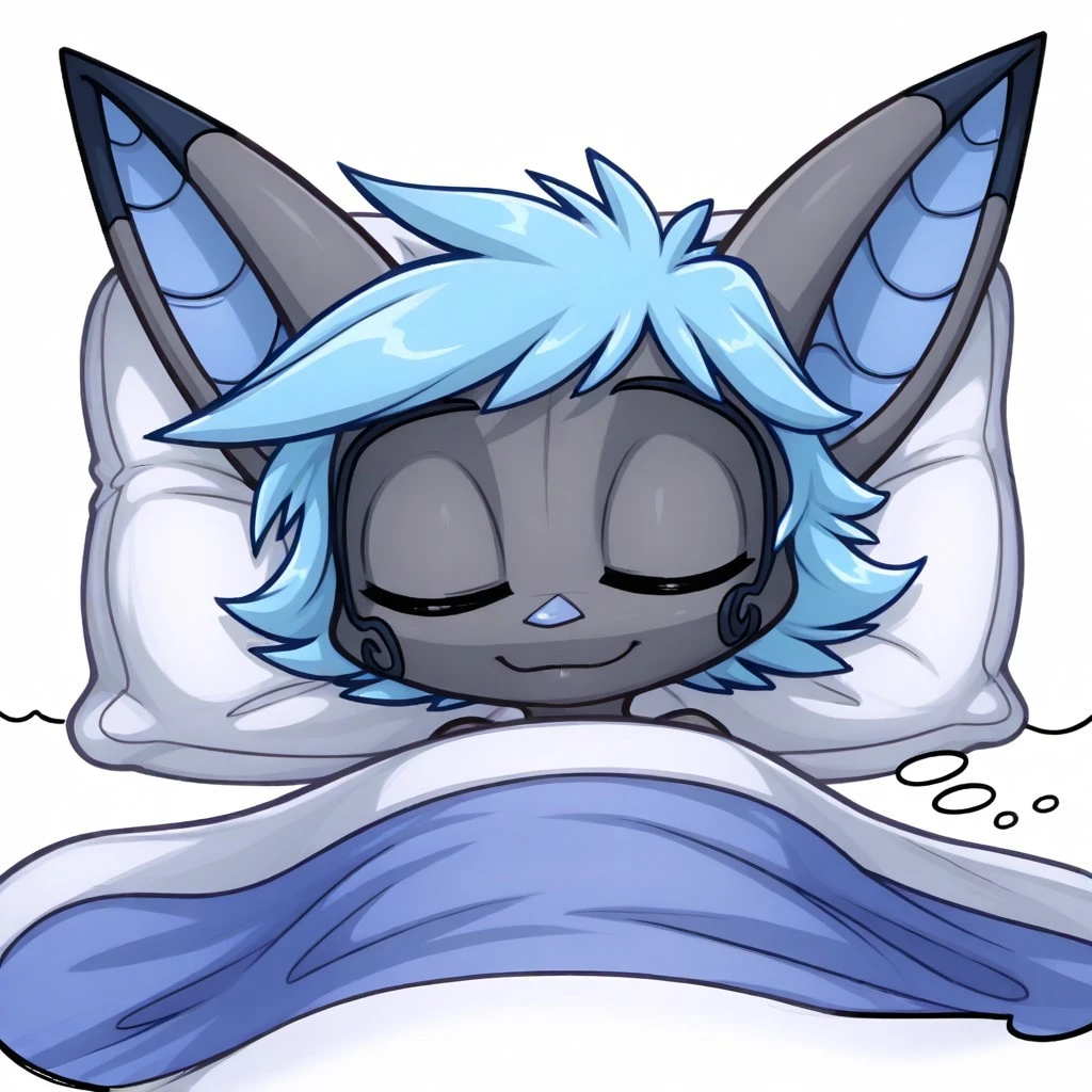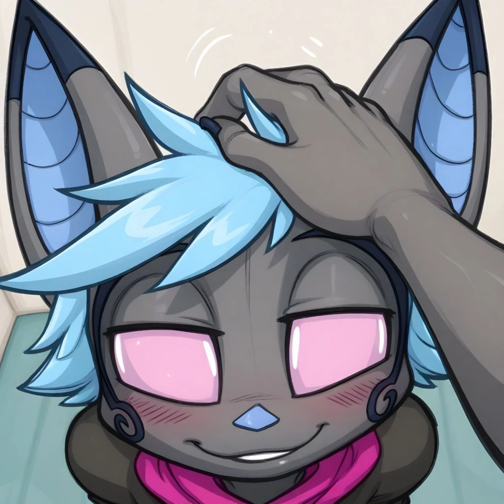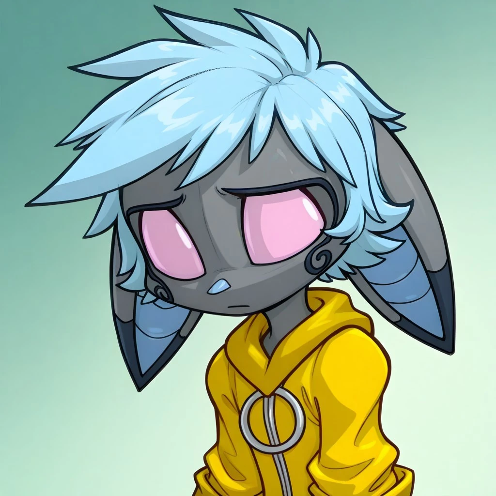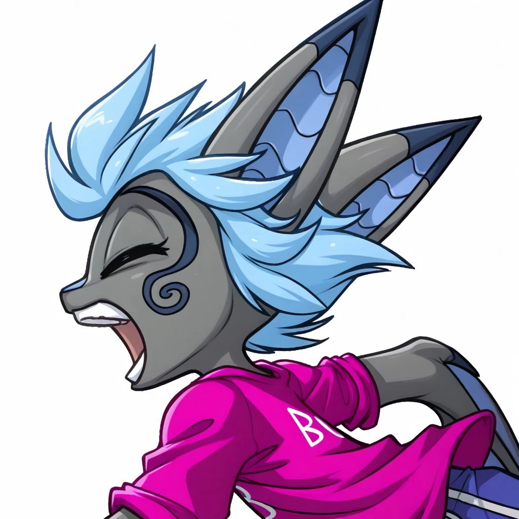vanth, 1girl, solo, furry, furry female, bat girl, grey skin, short hair, blue hair, animal ears, bat ears, animal nose, pink eyes, no pupils, bat wings, animal feet,