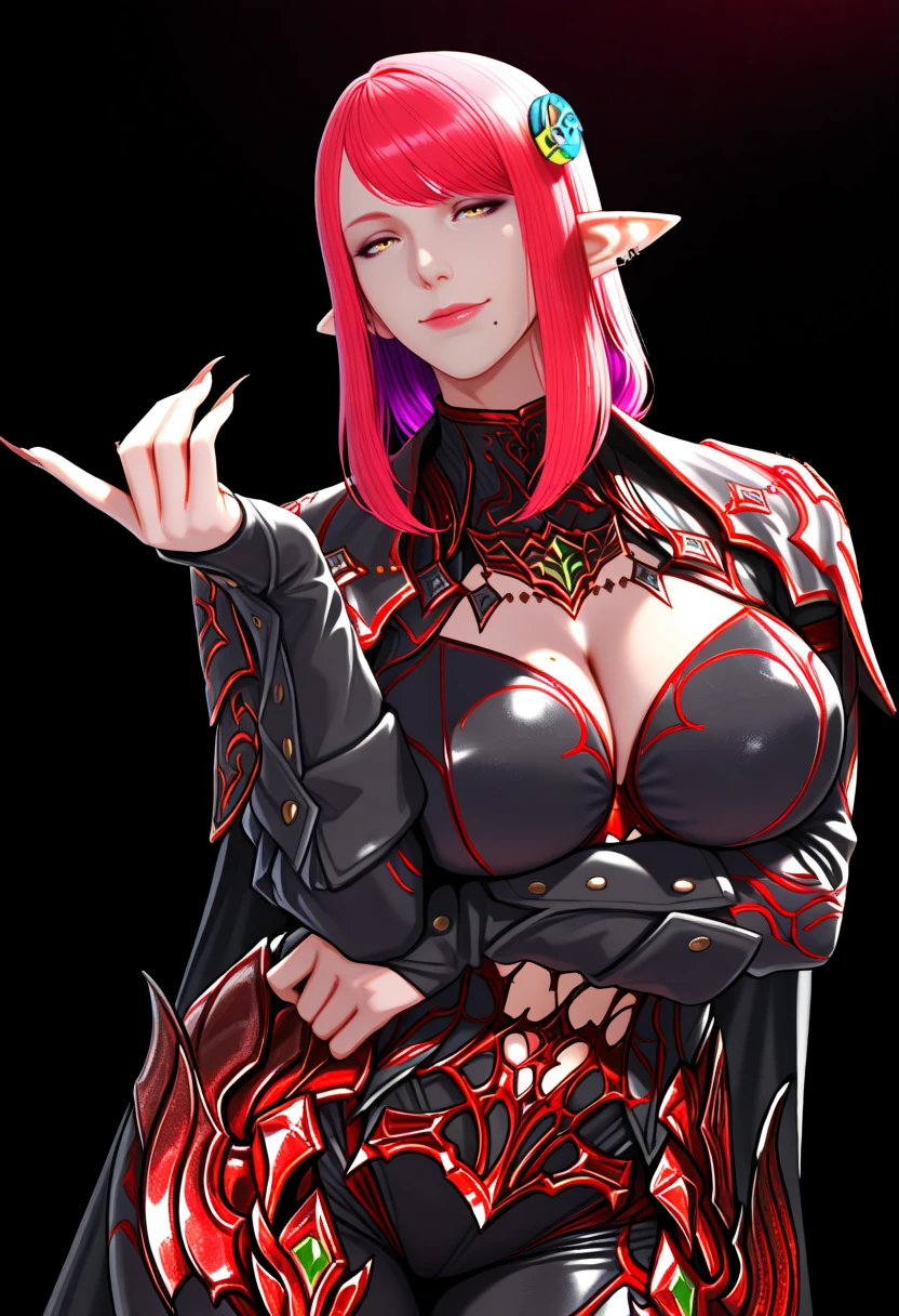 f4t4l3, mature female, elezen,red hair, yellow eyes, mole under mouth, pink colored inner hair,hair ornament, black and red bodysuit, fingernails