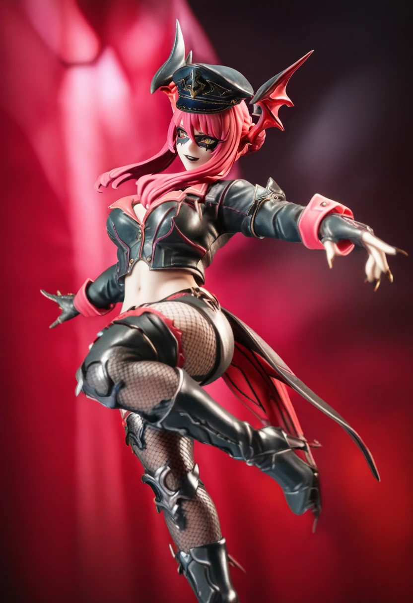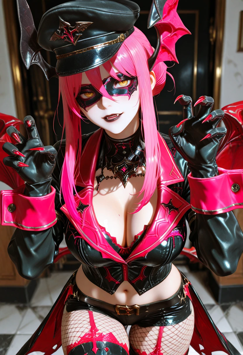 v4mp, yellow eyes, pink hair, head wings, hair between eyes, single hair bun, black lips, midriff, black leather jacket, red wings, fishnet pantyhose, peaked cap, thighhighs over pantyhose, black gloves, high heels, sharp fingernails, coattails, eye mask