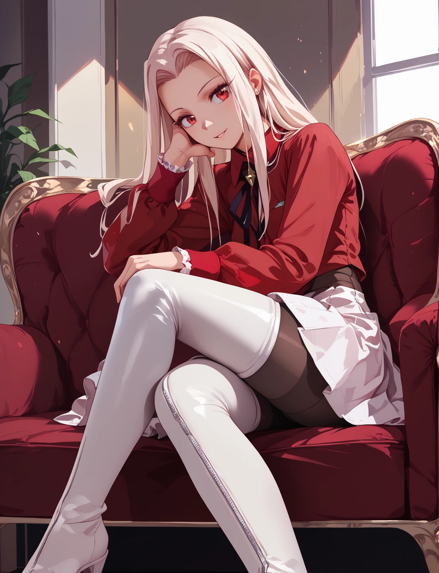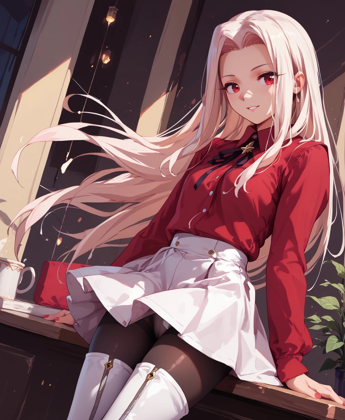 iirisviel_von_einzbern_def, red shirt, white skirt, long sleeves, white thigh-high boots, pantyhose