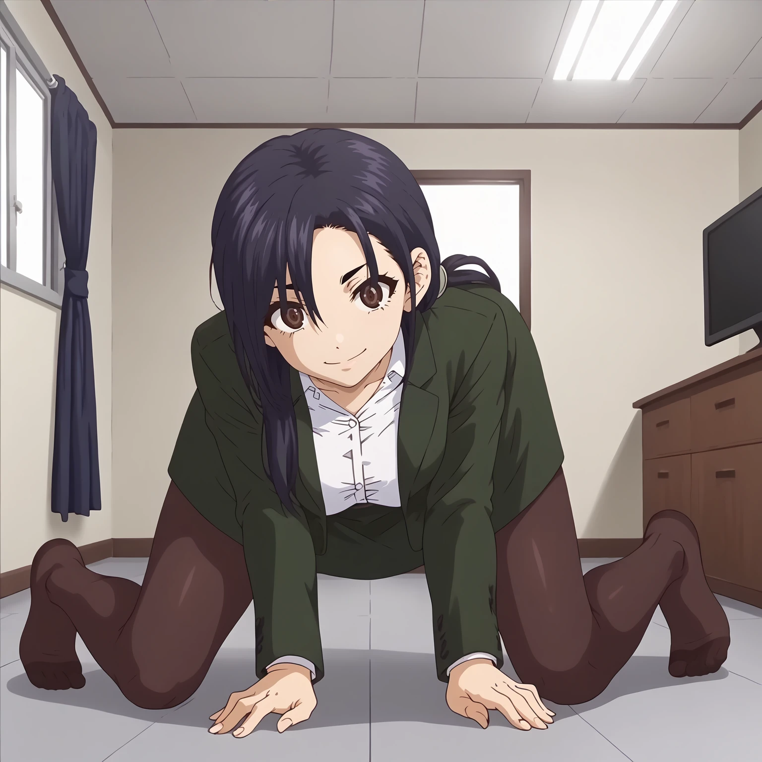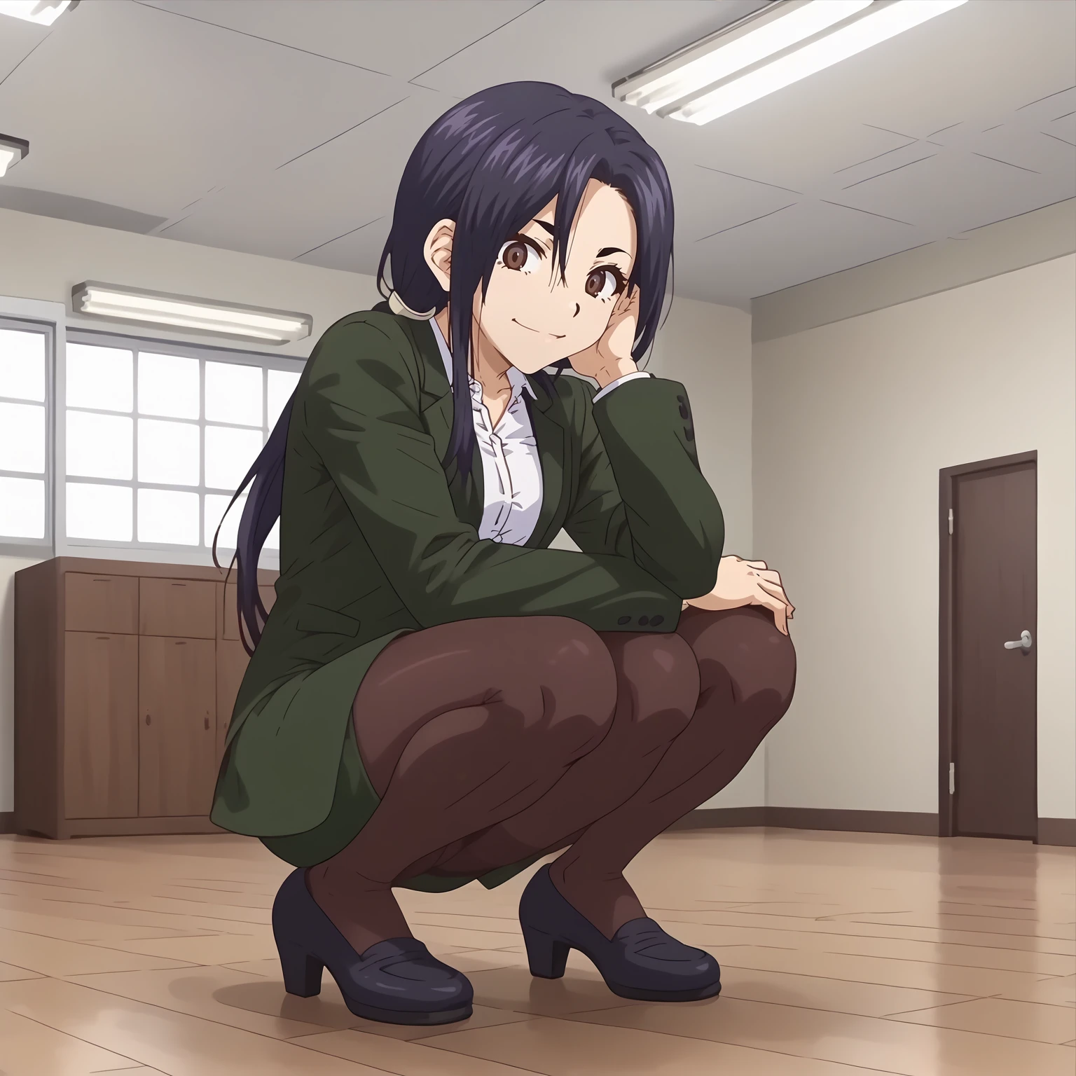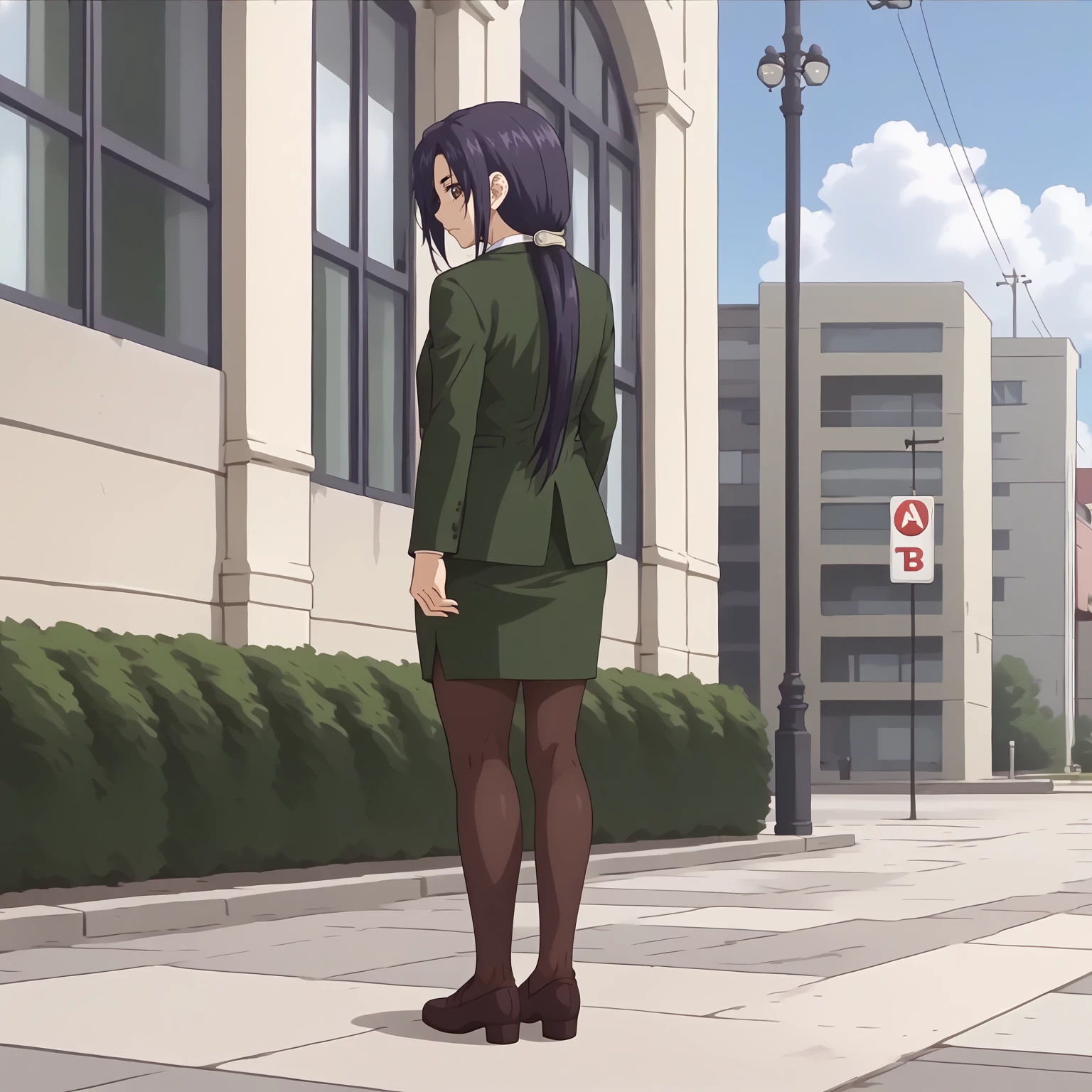 business_suit,green jacket,white shirt, green skirt, black_pantyhose,