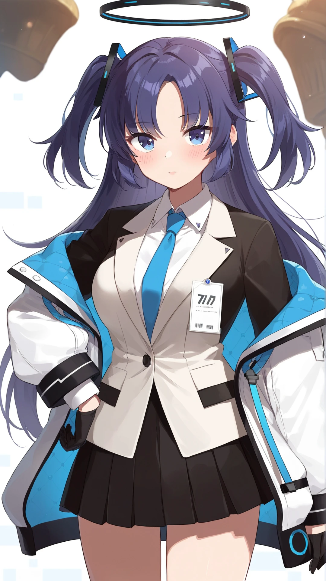 yuuka_blue_archive, an anime girl, 1girl, solo, long hair, breasts, looking at viewer, blush, bangs, blue eyes, skirt, simple background, shirt, gloves, white background, jacket, white shirt, purple hair, pleated skirt, open clothes, necktie, black gloves, collared shirt, belt, miniskirt, black skirt, off shoulder, two side up, hand on hip, parted bangs, halo, white jacket, blue necktie, id card,
