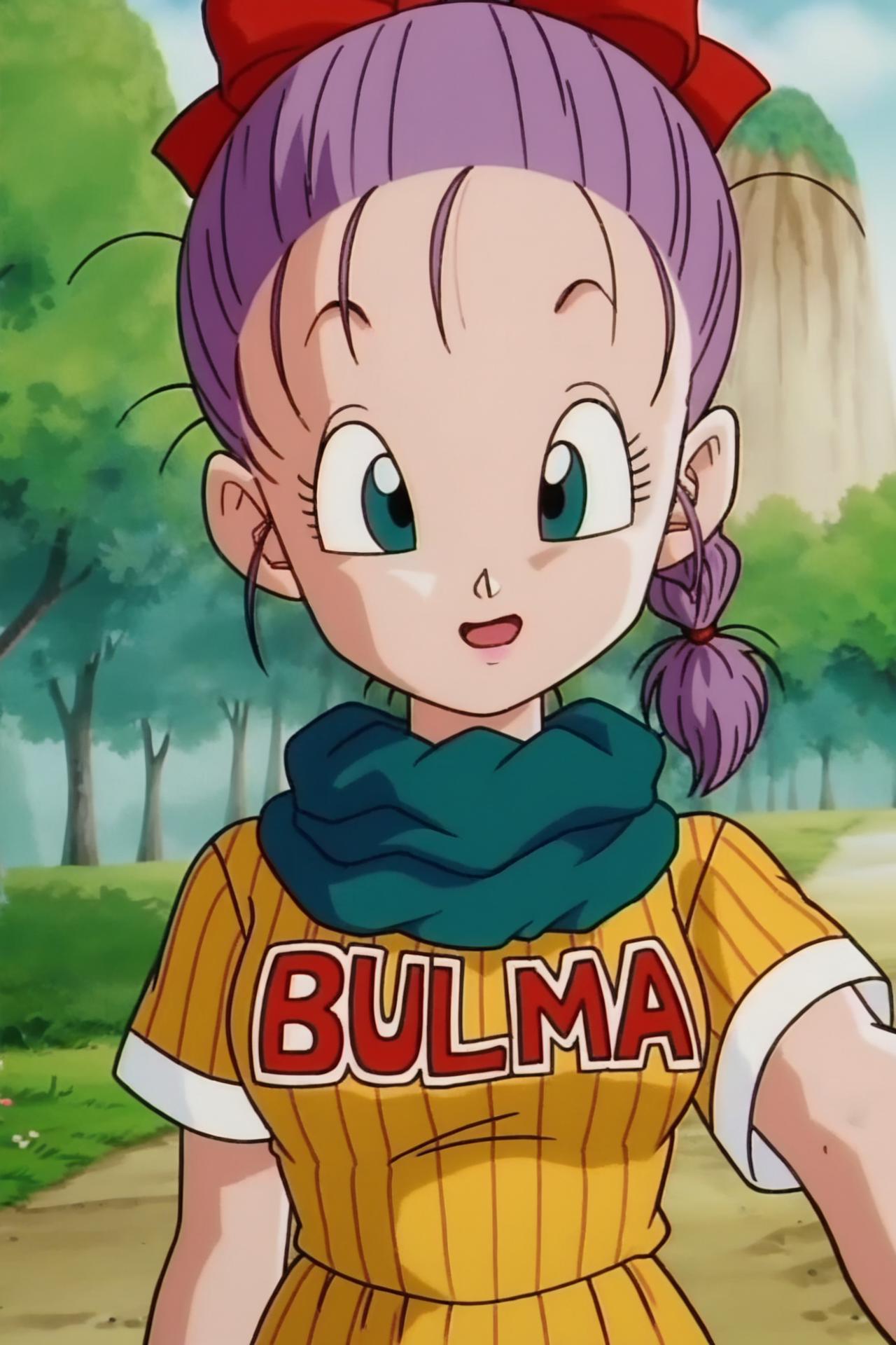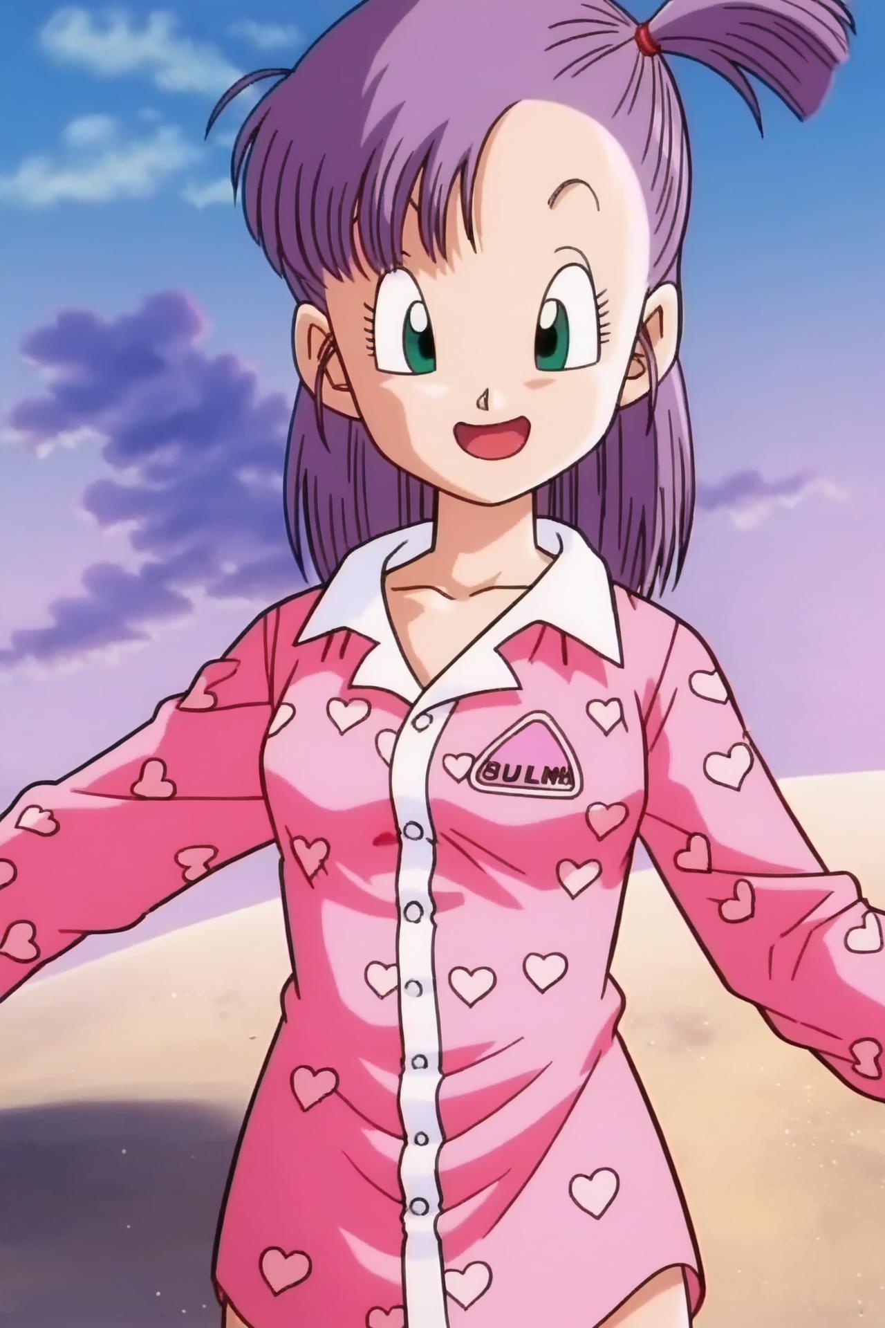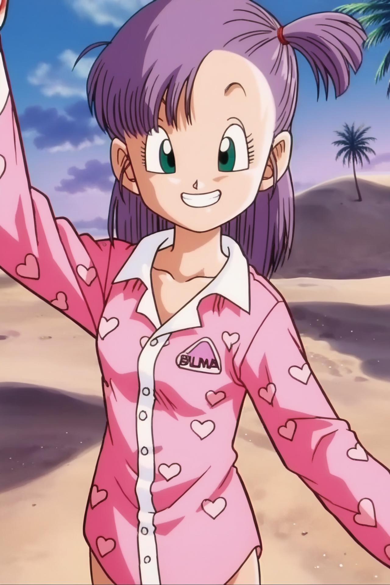 bulma, purple hair, green eyes