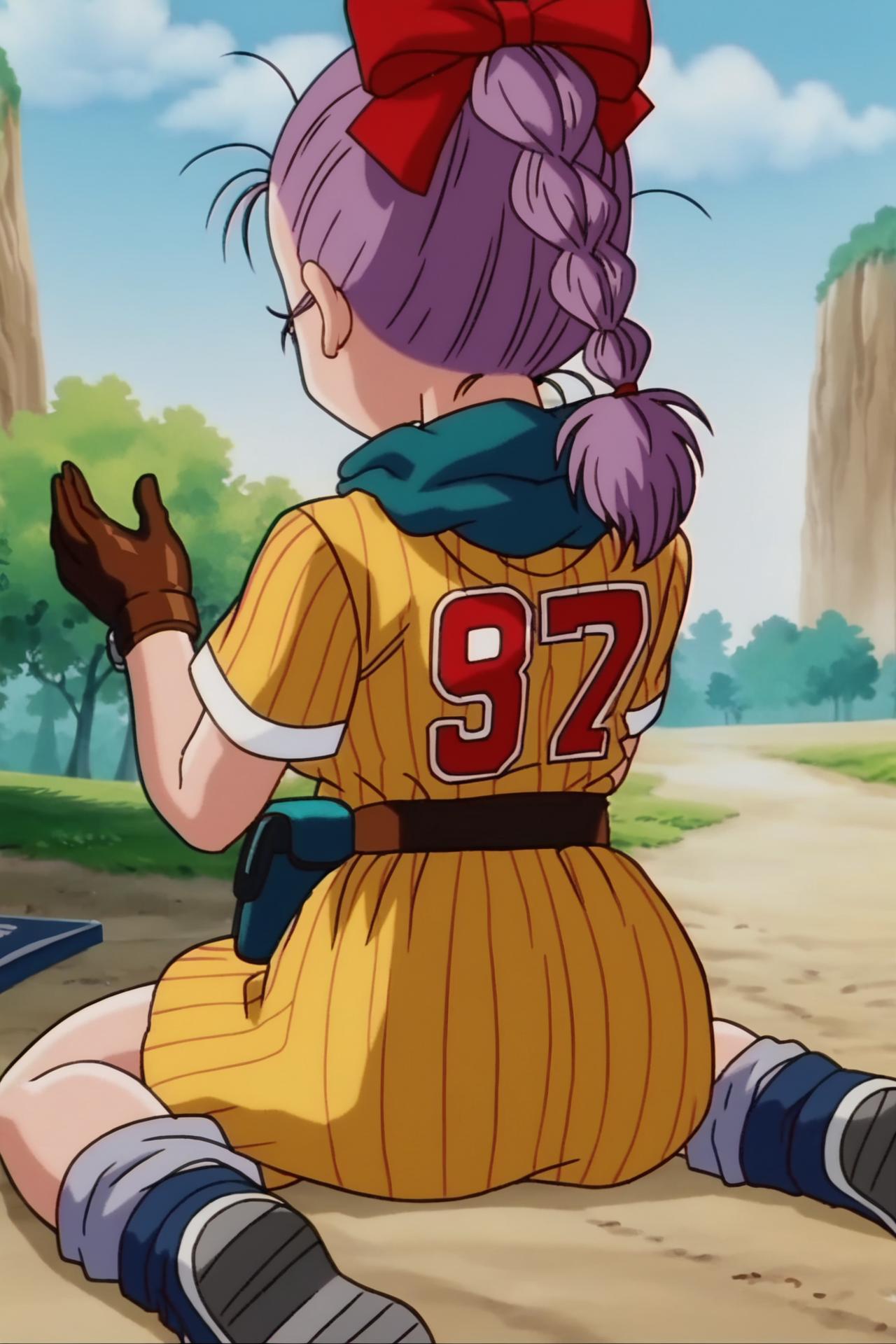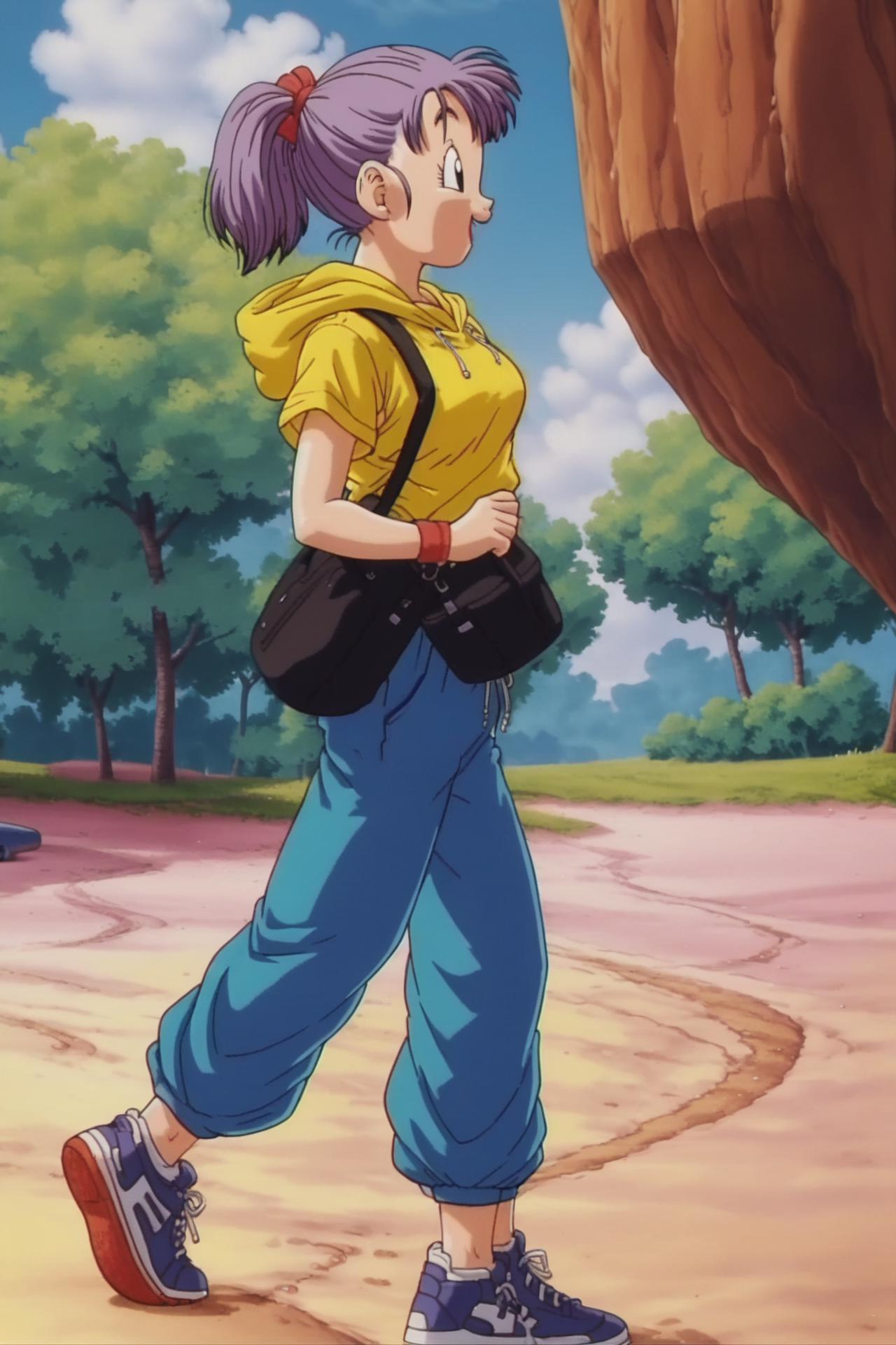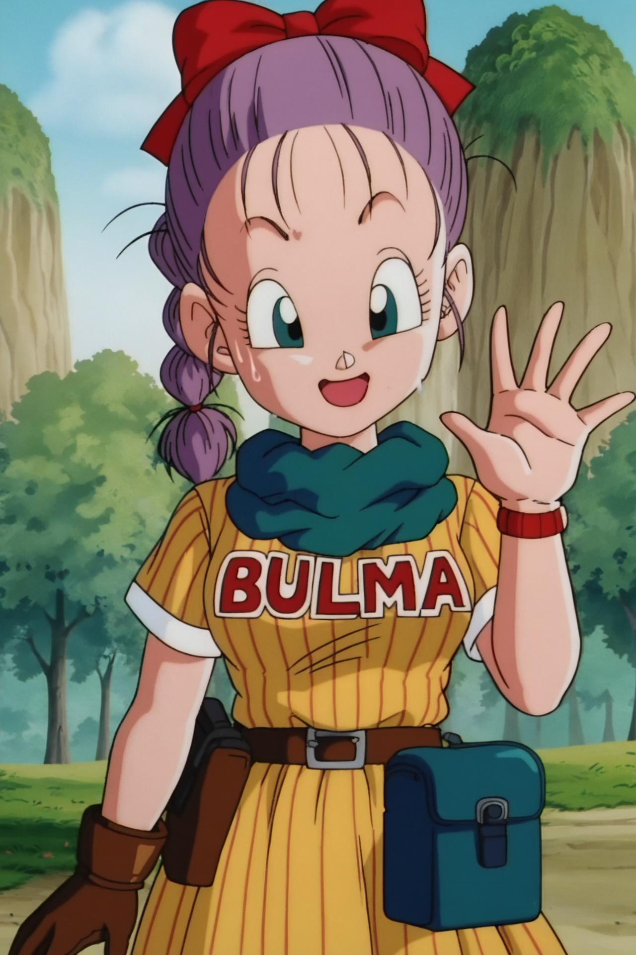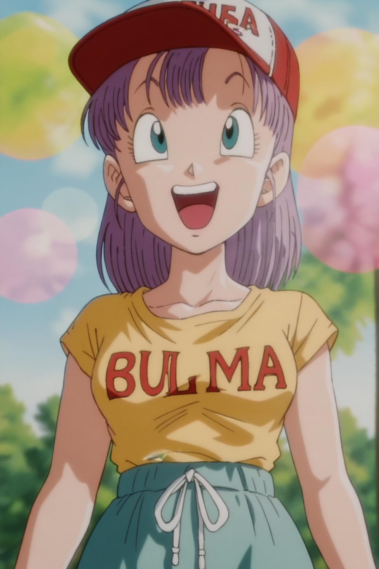 bulma, purple hair, green eyes