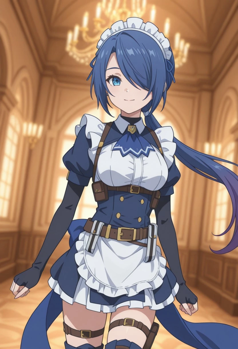 LoyalMa1d,1girl, blue eyes, short blue hair, side swept bangs, long side fringe covering one eye, low ponytail, blue hair with purple gradient, blue fantasy uniform,, short sleeved white blouse, blue chest bow, high collar choker, fitted blue corset dress, waist belt with gold buckle, harness straps, thigh holster straps, pleated mini skirt, detached long skirt panels, dark thigh high boots, fingerless gloves, corset waist, belt, thigh straps, mini skirt, maid headband,